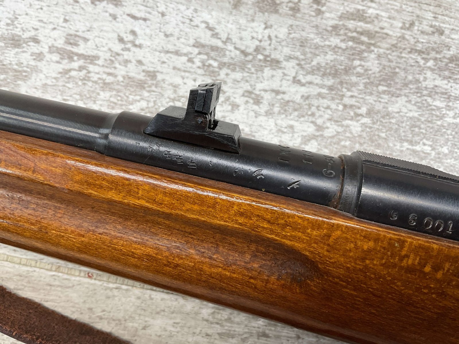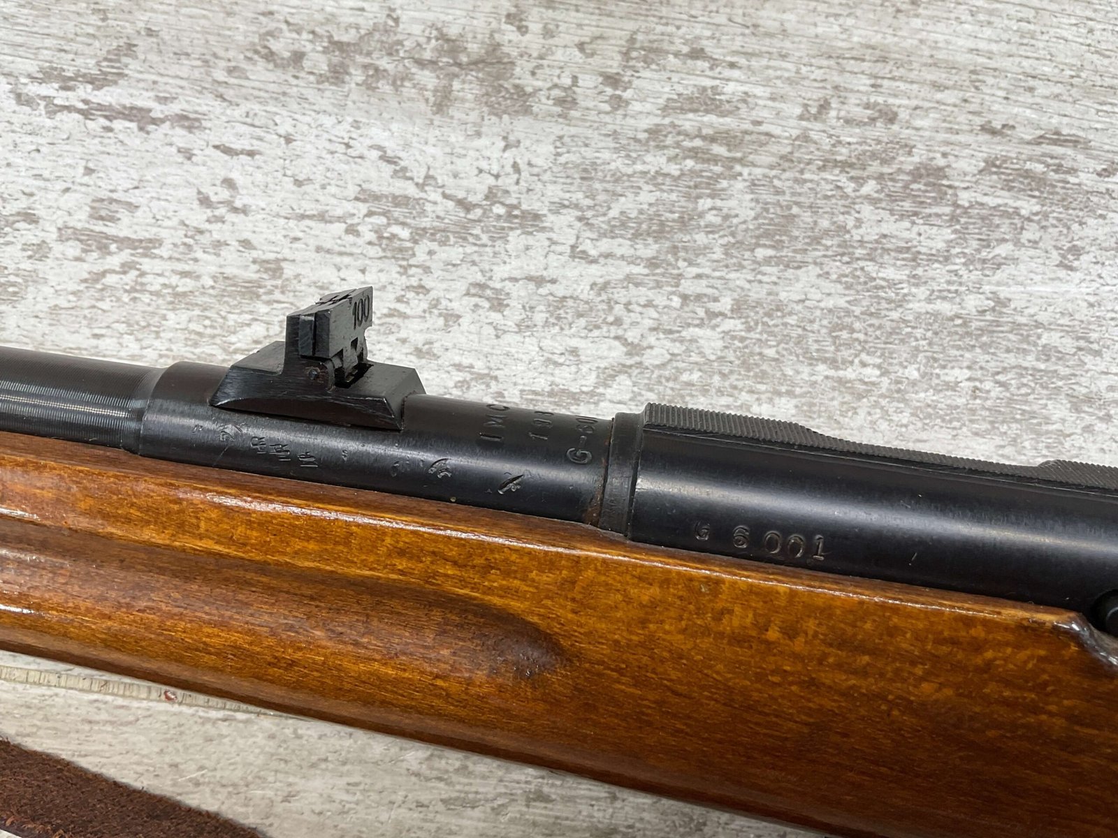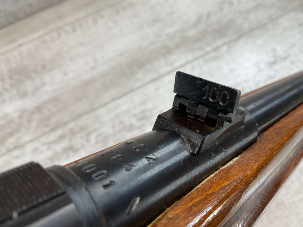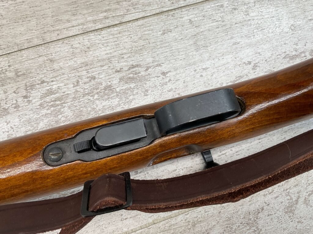 ROMANIAN M69 .22LR TRAINING RIFLE, IMC2 1984 MFR #G-6001, 23 1/4″ BBL, EXC SMOOTH WALNUT STOCK, MADE IN CUGIR ROMANIA, “RIBBED” BARREL, BLADE FRONT SIGHT W/HOOD, REAR STEEL LEAF SIGHT 25M W/TWO FOLD DOWN FOR 100M & 50M, ORIGINAL REMOVABLE 5 ROUND MAGAZINE, TRAPDOOR IN BUTT PLATE W/CLEANING KIT, SLING SWIVELS AND LEATHER SLING, EXC MIRROR BORE & RIFLING, 95+% OVERALL