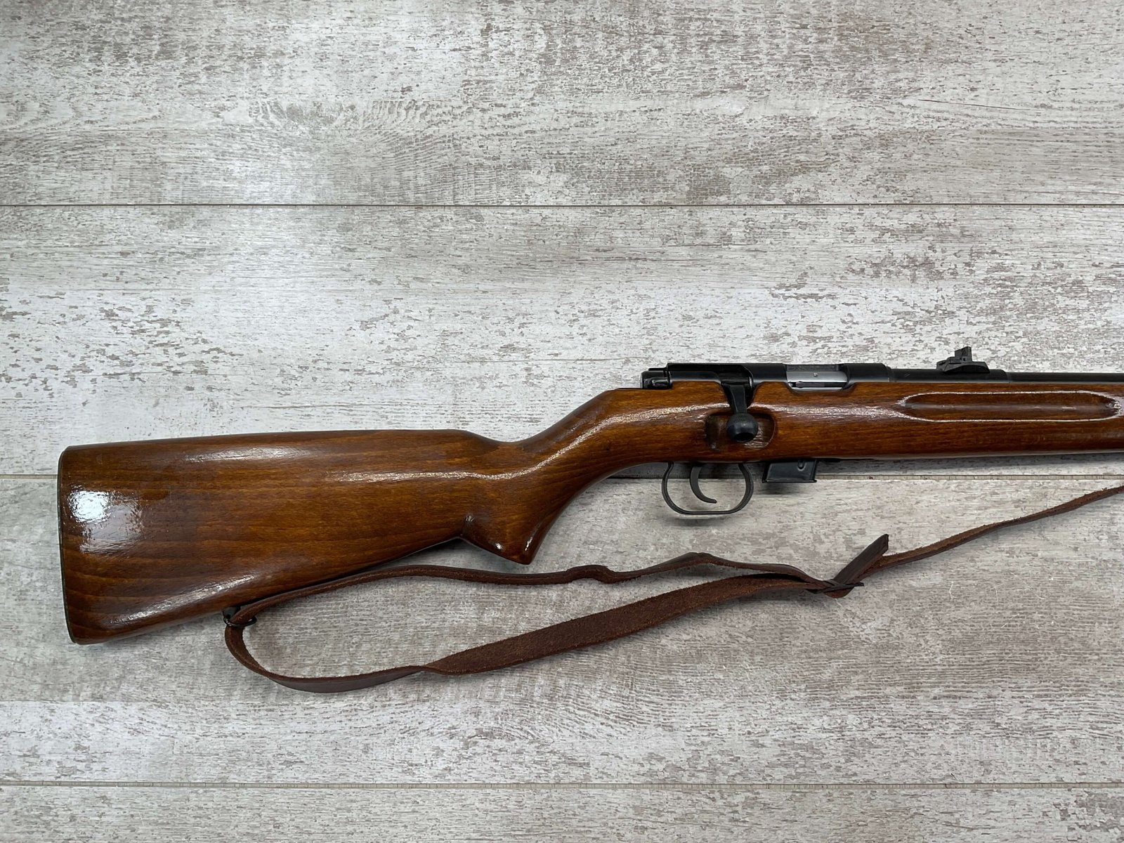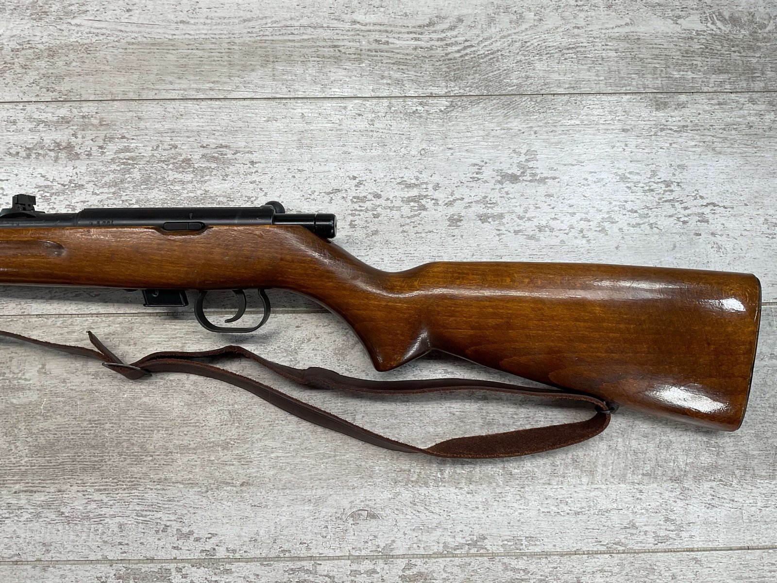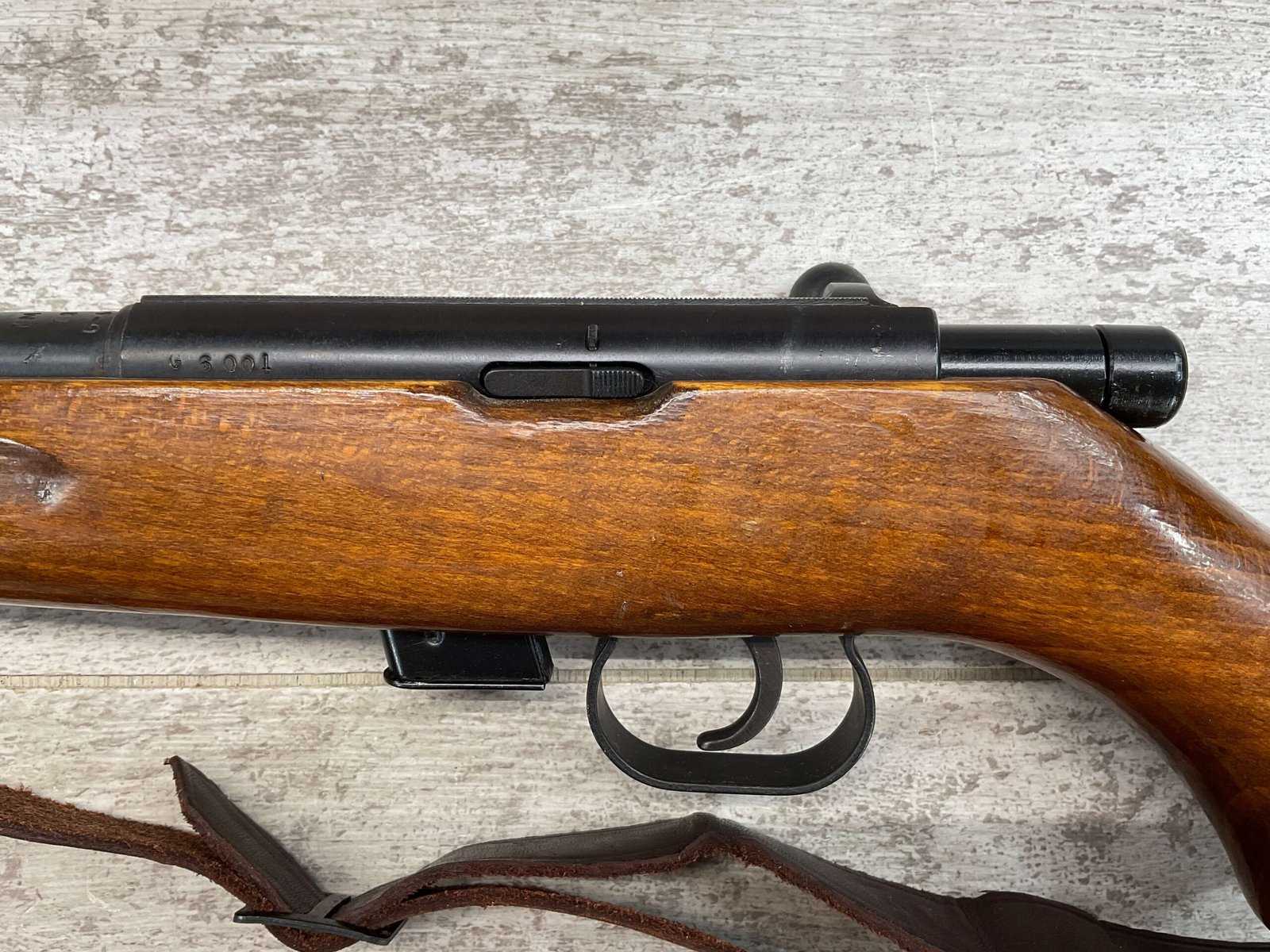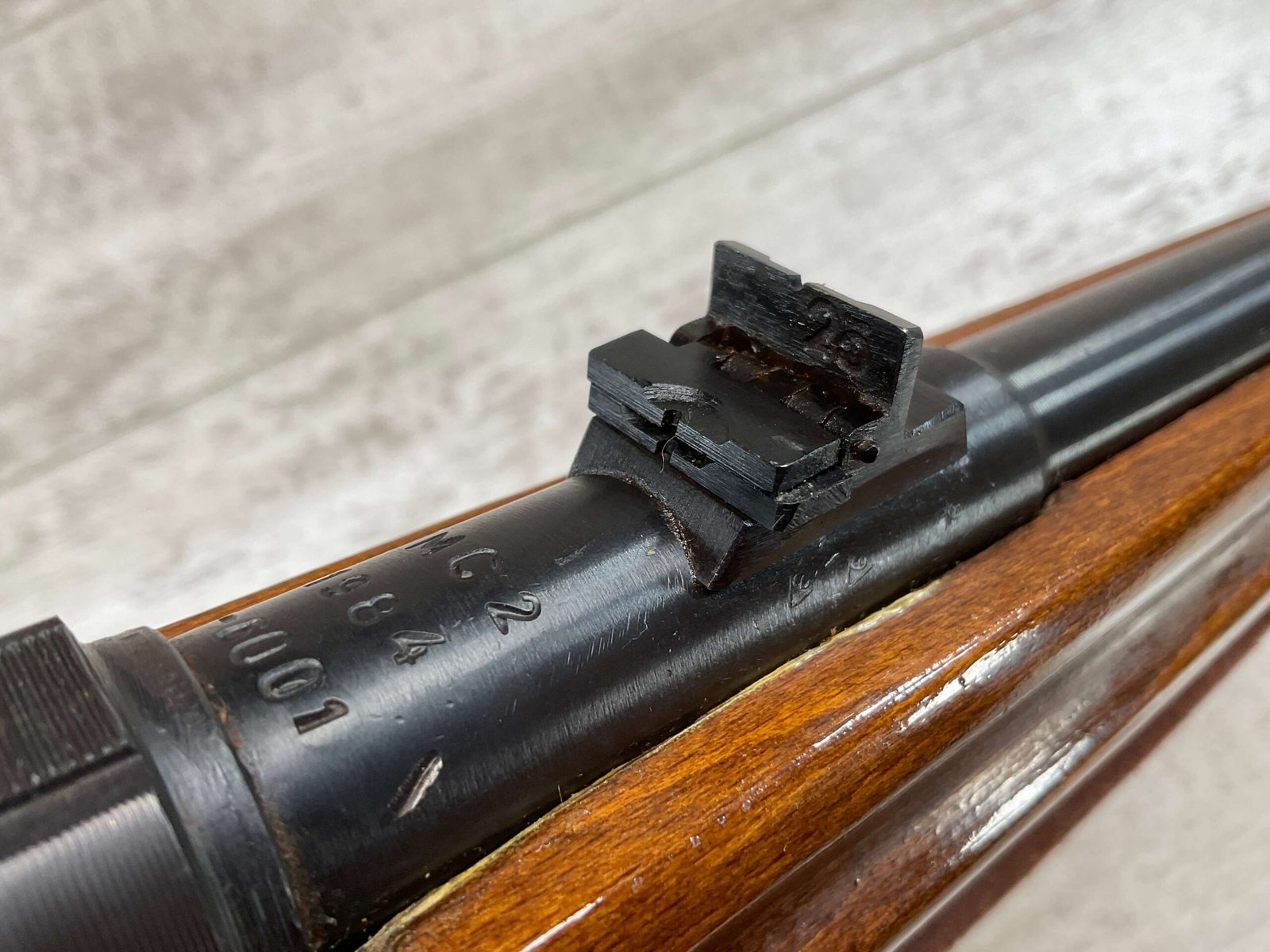 ROMANIAN M69 .22LR TRAINING RIFLE, IMC2 1984 MFR #G-6001, 23 1/4″ BBL, EXC SMOOTH WALNUT STOCK, MADE IN CUGIR ROMANIA, “RIBBED” BARREL, BLADE FRONT SIGHT W/HOOD, REAR STEEL LEAF SIGHT 25M W/TWO FOLD DOWN FOR 100M & 50M, ORIGINAL REMOVABLE 5 ROUND MAGAZINE, TRAPDOOR IN BUTT PLATE W/CLEANING KIT, SLING SWIVELS AND LEATHER SLING, EXC MIRROR BORE & RIFLING, 95+% OVERALL