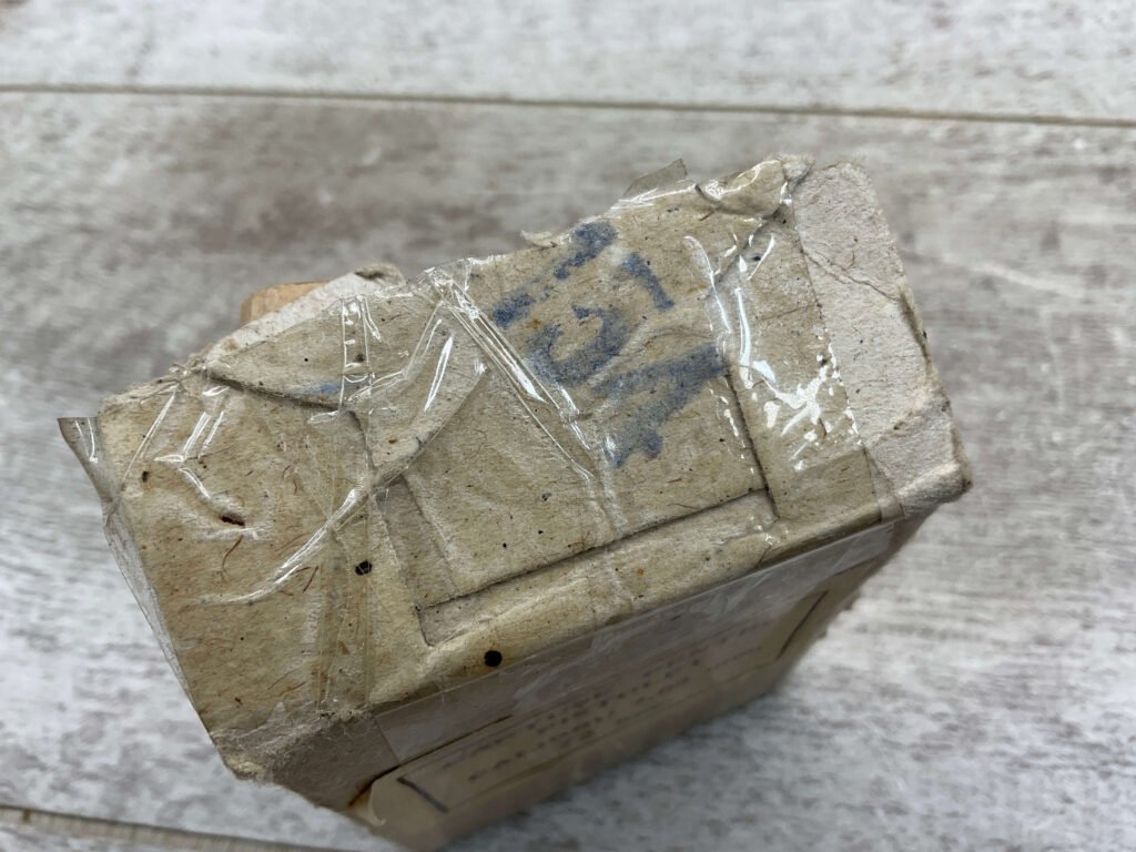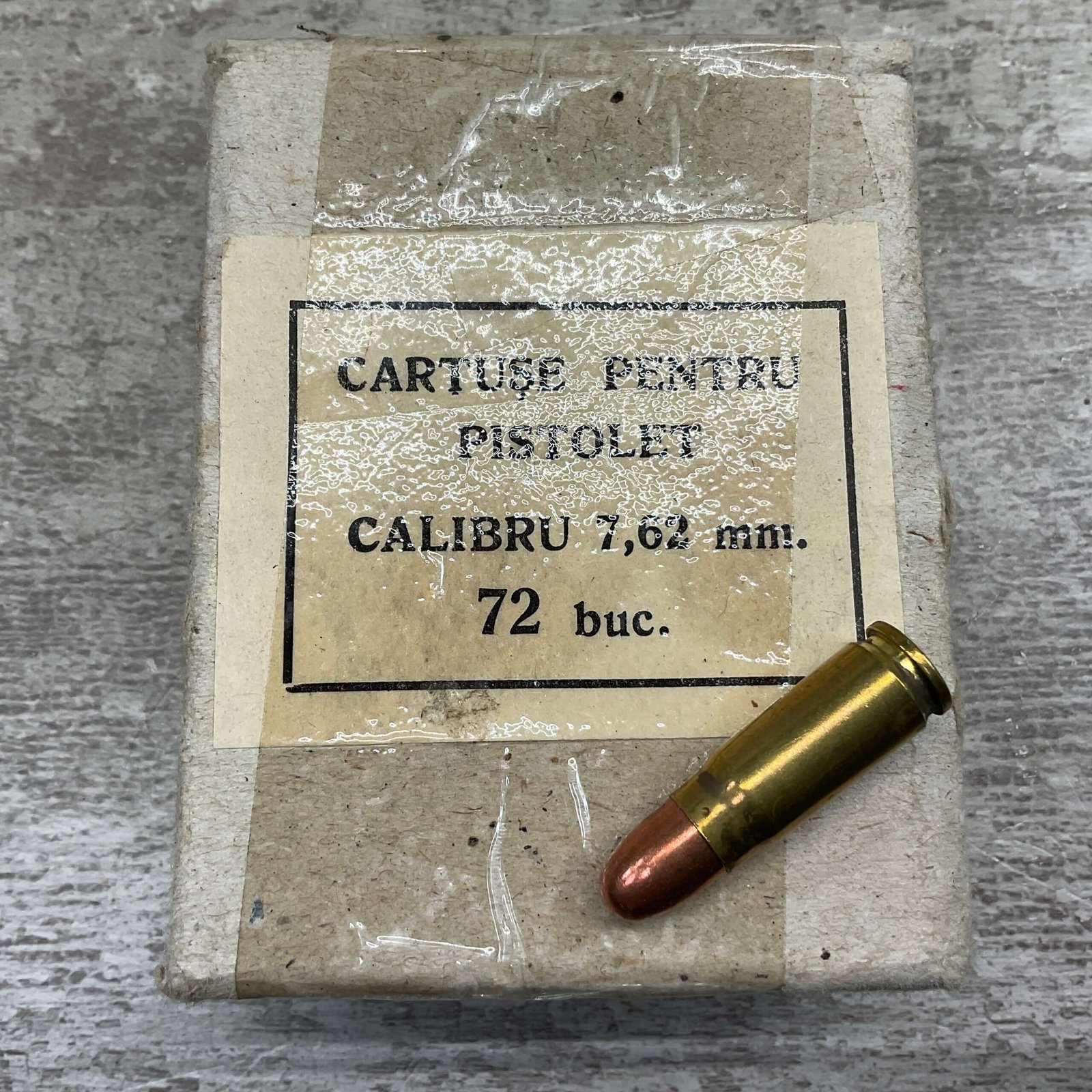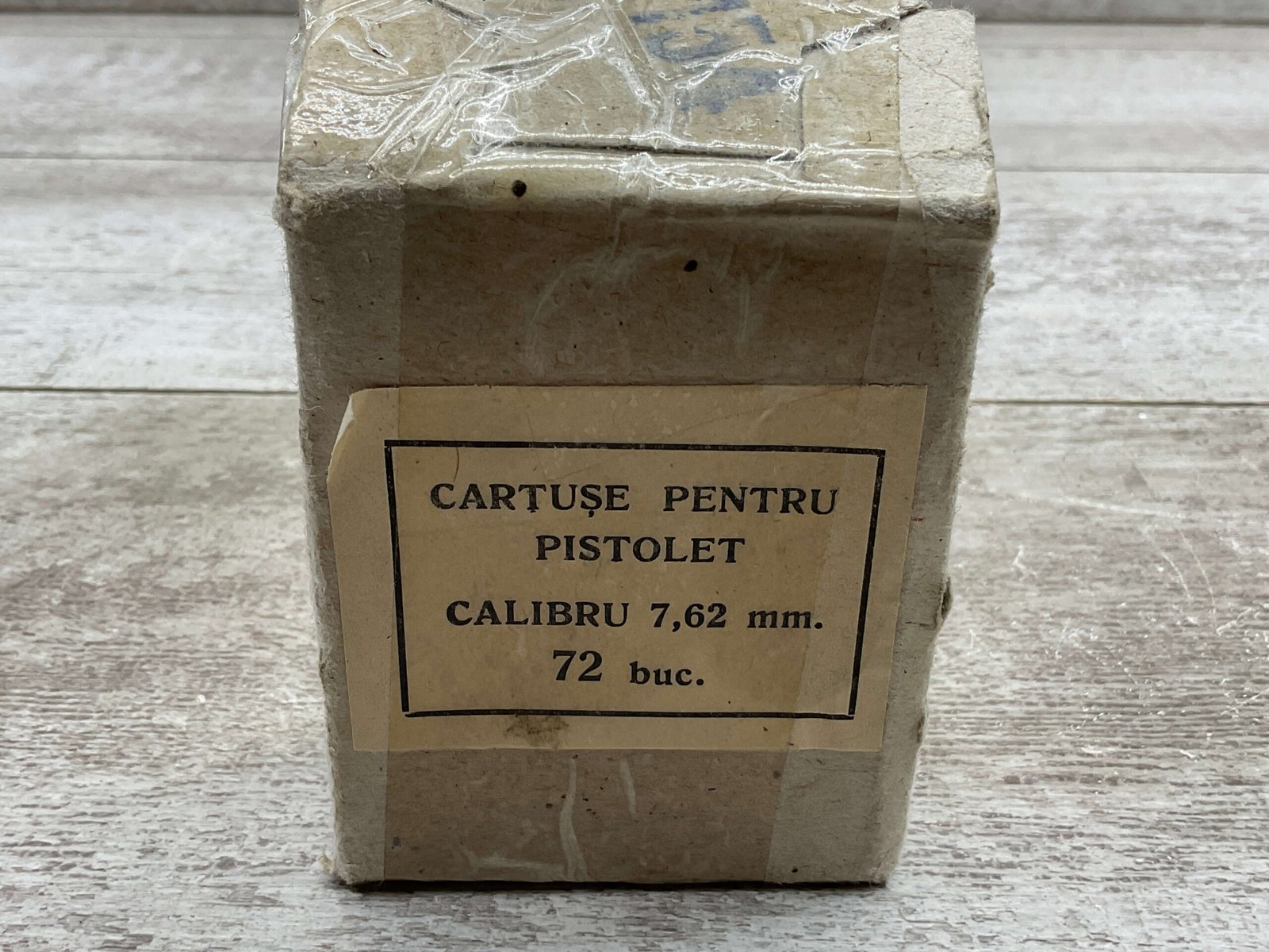 ROMANIAN TOKAREV 7.62X25MM AMMO, 72RDS, BOX IS WRAPPED WITH SOME CLEAR TAPE ON FRONT, BACK, AND TOP, AND SOME BLUE PAINTERS TAPE ON THE BACK. BOX IS ADDITIONALLY RIPPING IN SOME PARTS WHICH IS EXPECTED DUE TO WEIGHT.