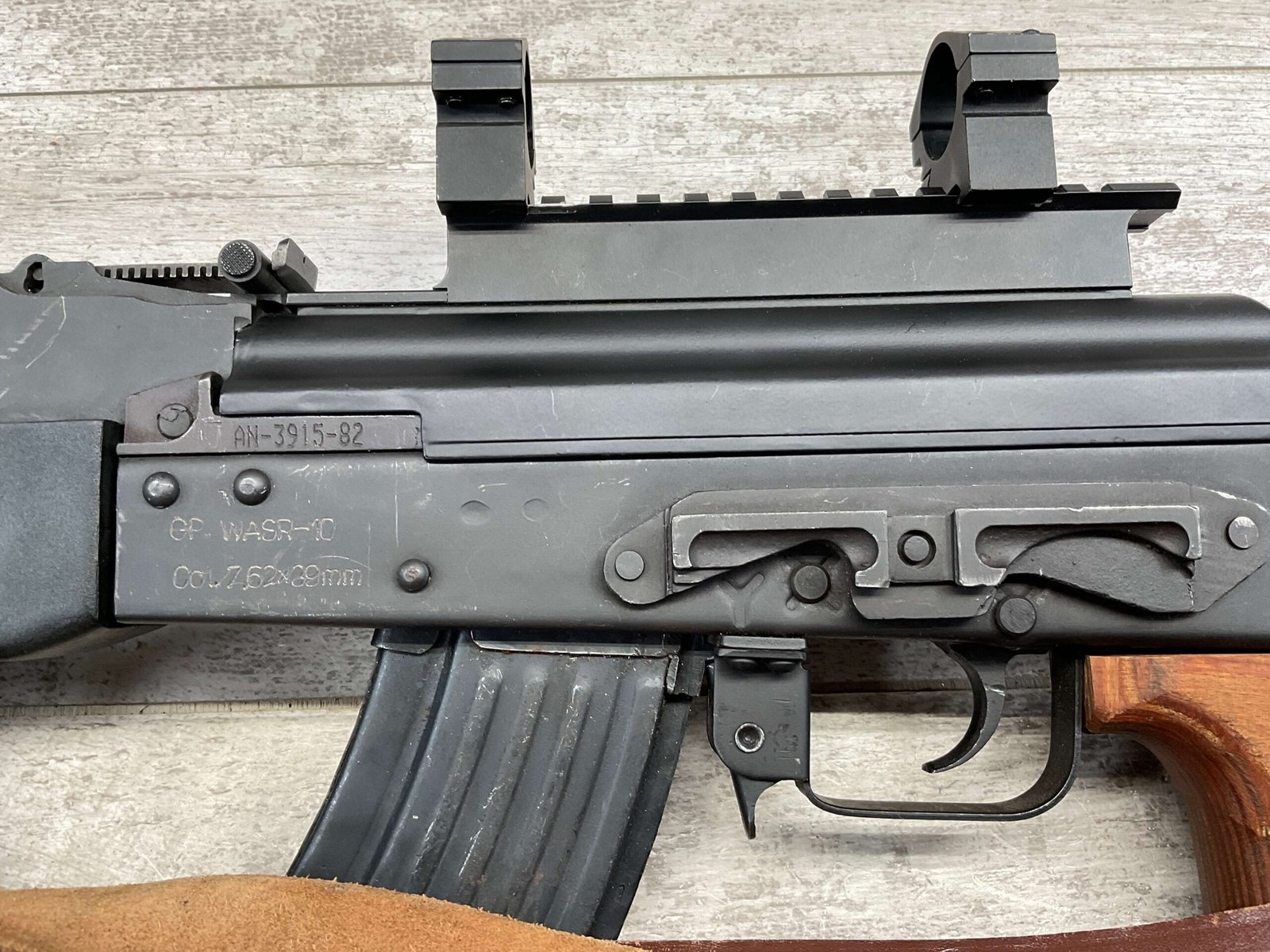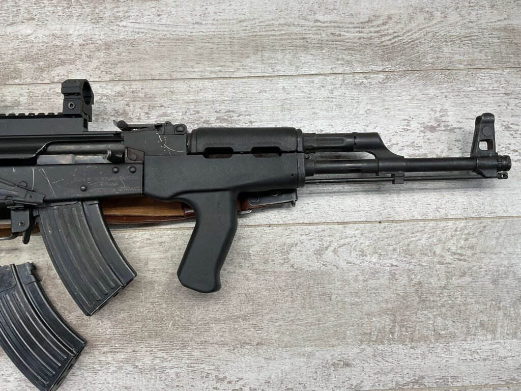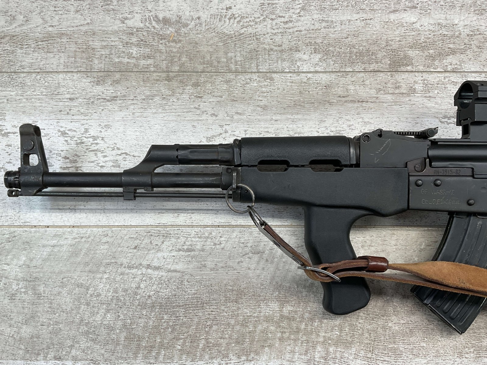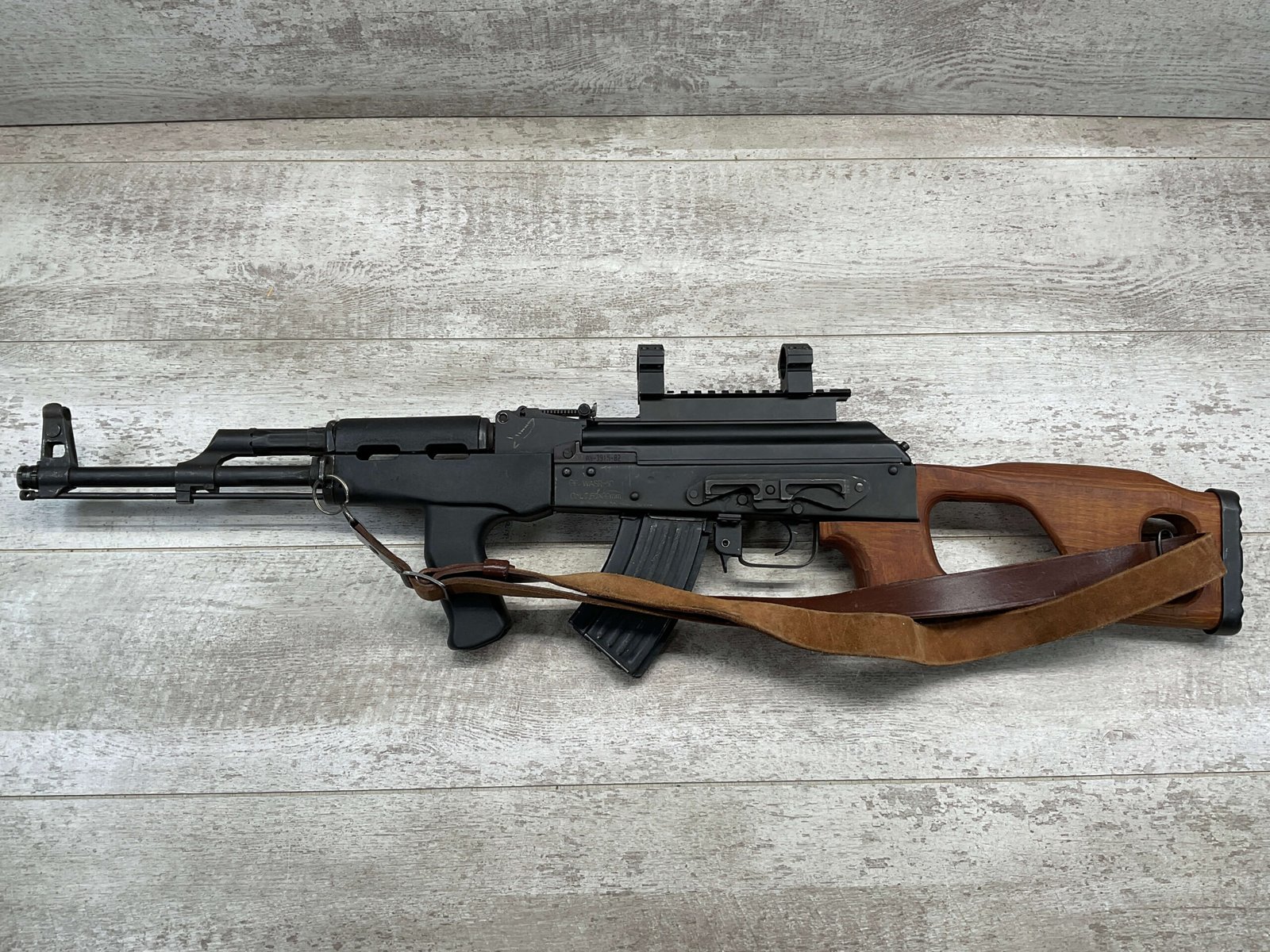 ROMARM CUGIR WASR-10 SINGLE STACK AK47 7.62X39 SEMI AUTO RIFLE #AN-3915-82, PRE-BAN, LAMINATED THUMBHOLE WOODEN STOCK, BLACK PLASTIC FRONT HANDGUARD, 16″ BARREL, EXC BORE & RIFLING, SINGLE STACK, 2-10RND MAGS & 2-5RND MAGS INCLUDED, LEATHER SLING, SIDE MOUNT SCOPE RAIL, BAYONET LUG GROUND, TOP OF RECEIVER HAS SCOPE MOUNT, VG-EXC OVERALL