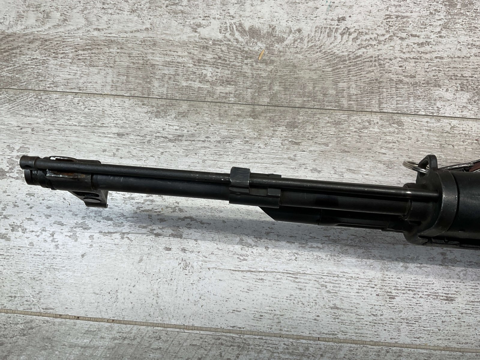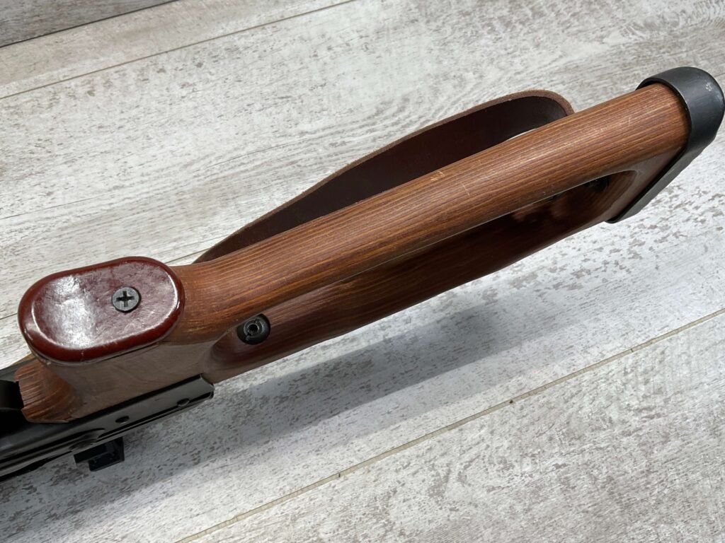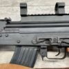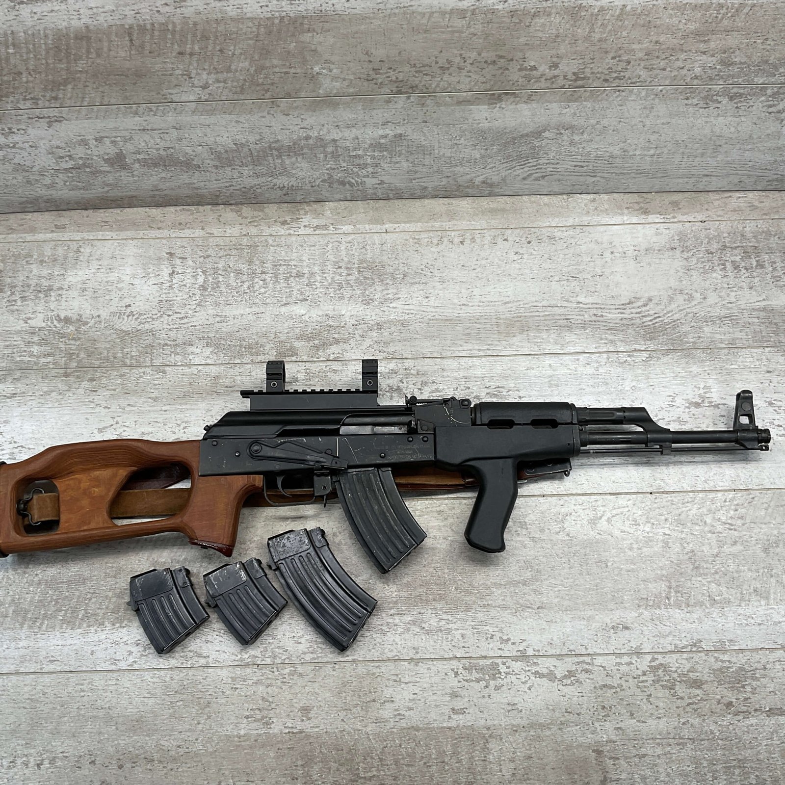 ROMARM CUGIR WASR-10 SINGLE STACK AK47 7.62X39 SEMI AUTO RIFLE #AN-3915-82, PRE-BAN, LAMINATED THUMBHOLE WOODEN STOCK, BLACK PLASTIC FRONT HANDGUARD, 16″ BARREL, EXC BORE & RIFLING, SINGLE STACK, 2-10RND MAGS & 2-5RND MAGS INCLUDED, LEATHER SLING, SIDE MOUNT SCOPE RAIL, BAYONET LUG GROUND, TOP OF RECEIVER HAS SCOPE MOUNT, VG-EXC OVERALL