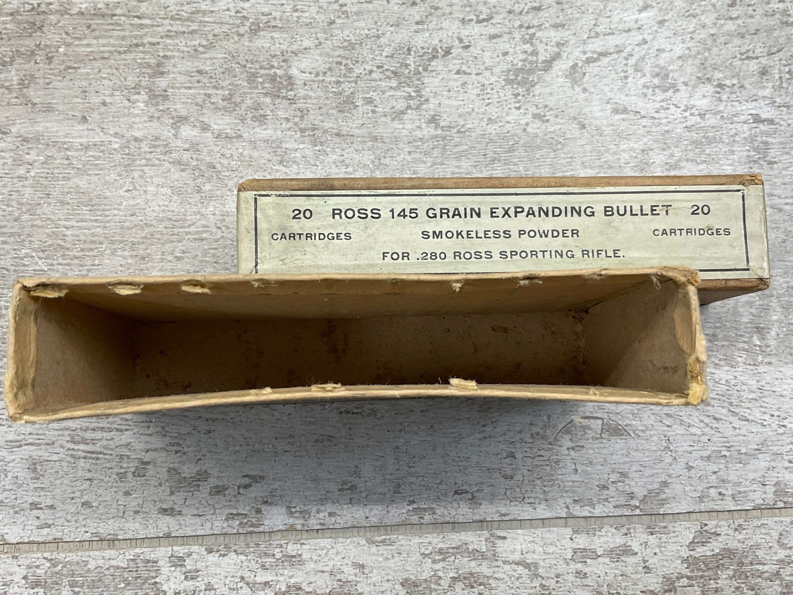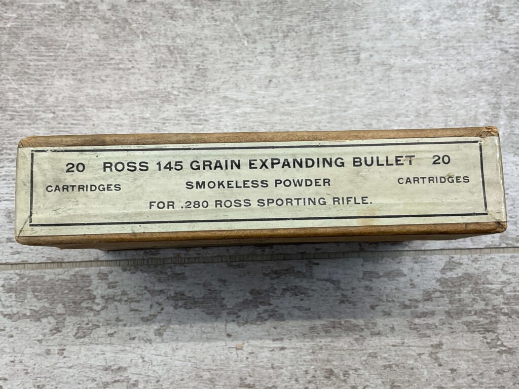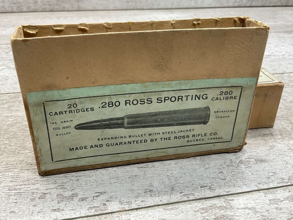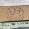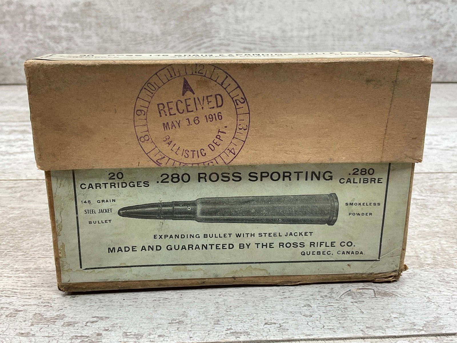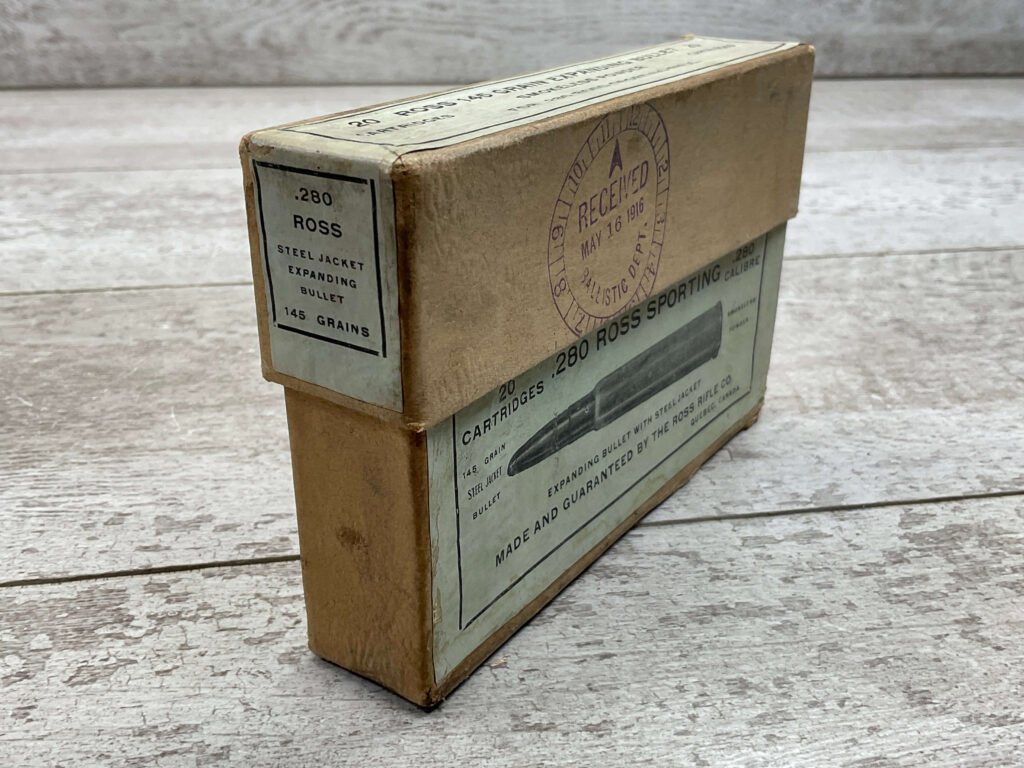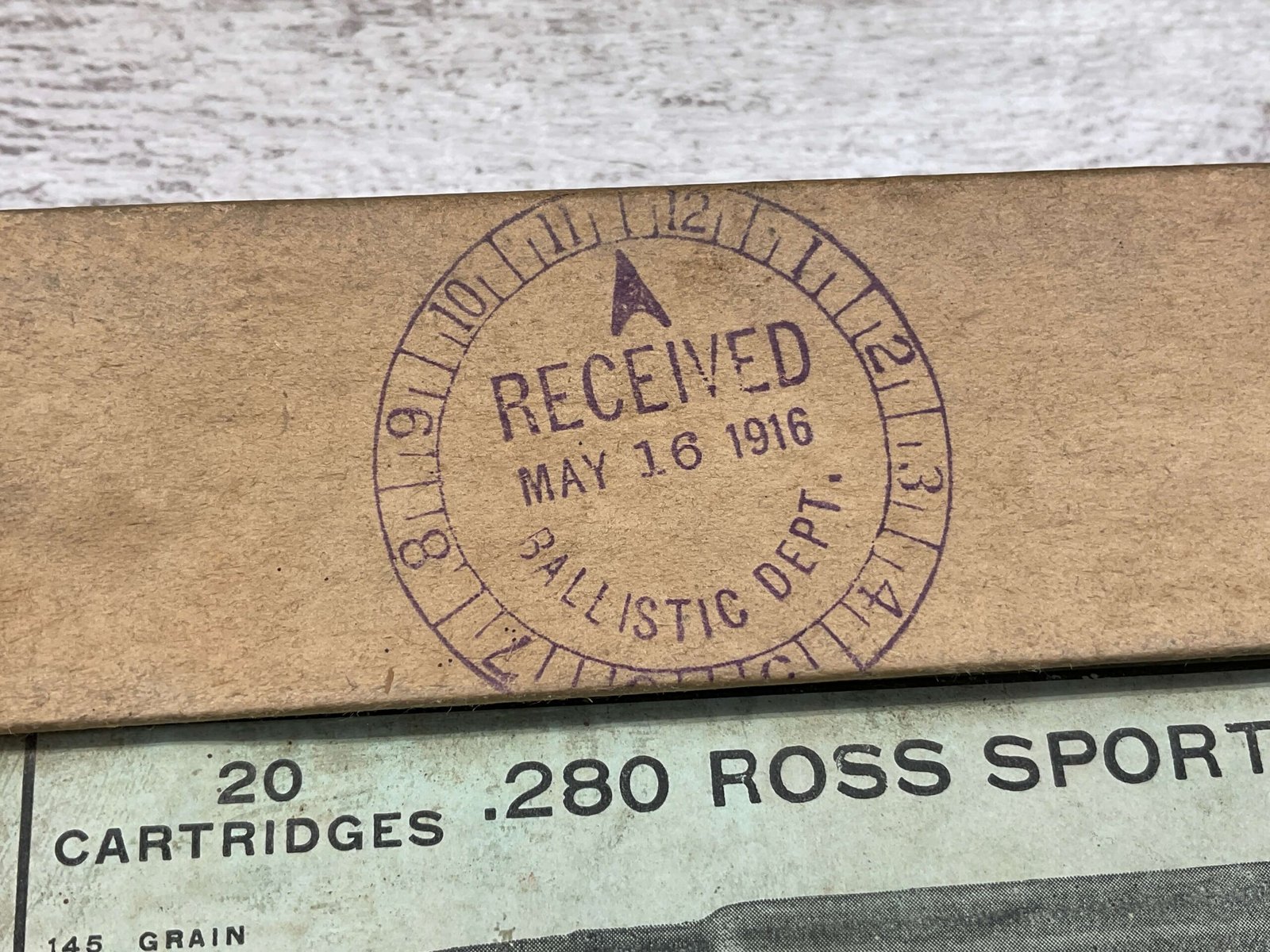 ROSS SPORTING .280 CAL SMOKELESS AMMO, EMPTY BOX, VERY RARE, VINTAGE, BOX DOES NOT CONTAIN THE ORIGINAL INSERTS, HAS STAMP ON FRONT WITH “RECEIVED MAY 16, 1916 BALLISTIC DEPT.” ON IT. THIS EXTREMELY RARE COLLECTIBLE IS IN FANTASTIC CONDITION AND WOULD BE GREAT FOR DISPLAY.