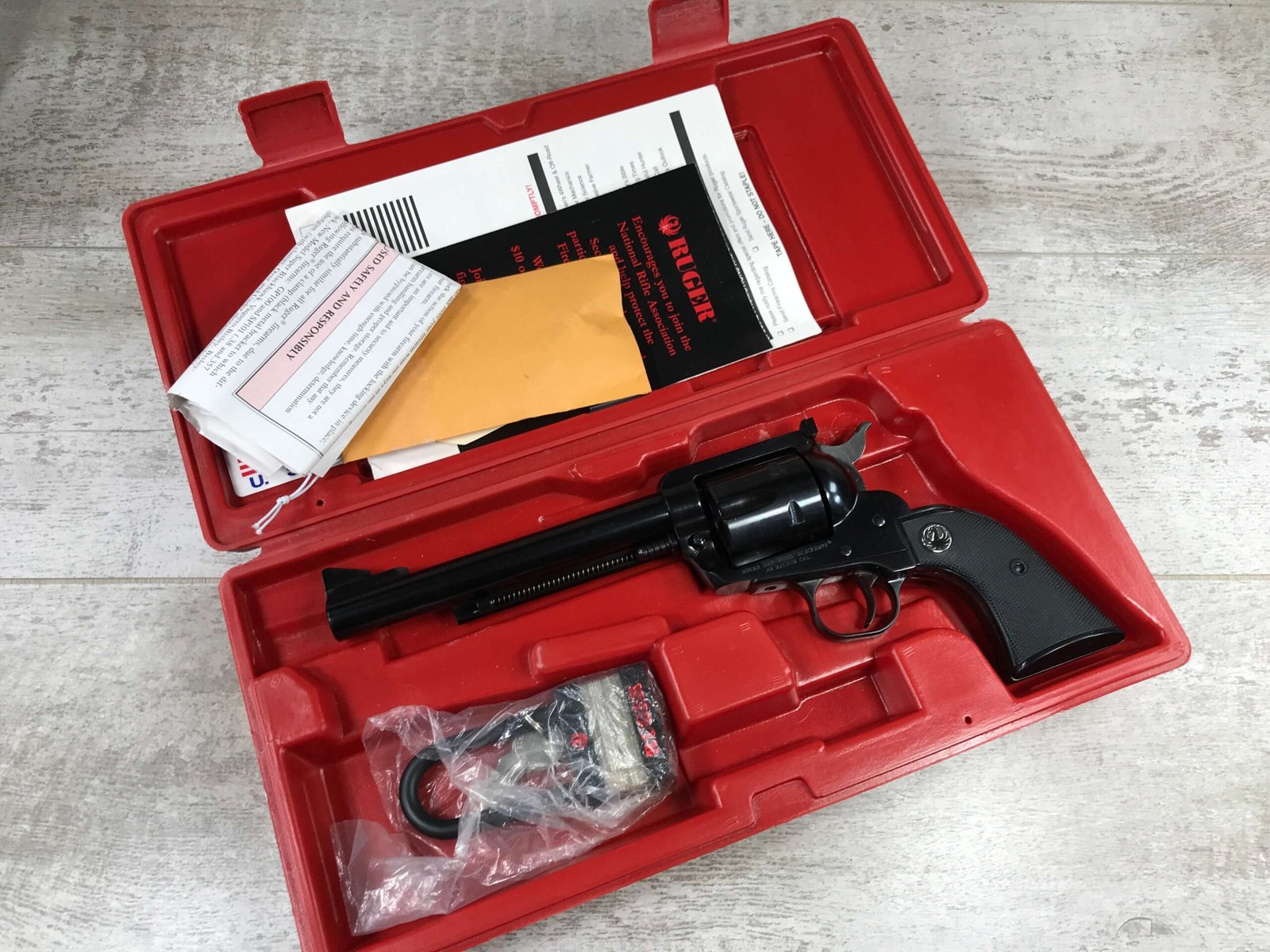 RUGER 44MAG BLACKHAWK REVOLVER COLLECTORS EDITION IN RED PLASTIC CASE #870-07200, “50YRS OF 44 MAGNUM 1956-2006″ ENGRAVED IN GOLD ON THE TOP OF THE 6.5” BARREL, SIX SHOT, S/A, CHECKERED BLACK GRIP W/BLACK RUGER EAGLE INSET, RAMP FRONT SIGHT AND ADJ REAR SIGHT, 99+%