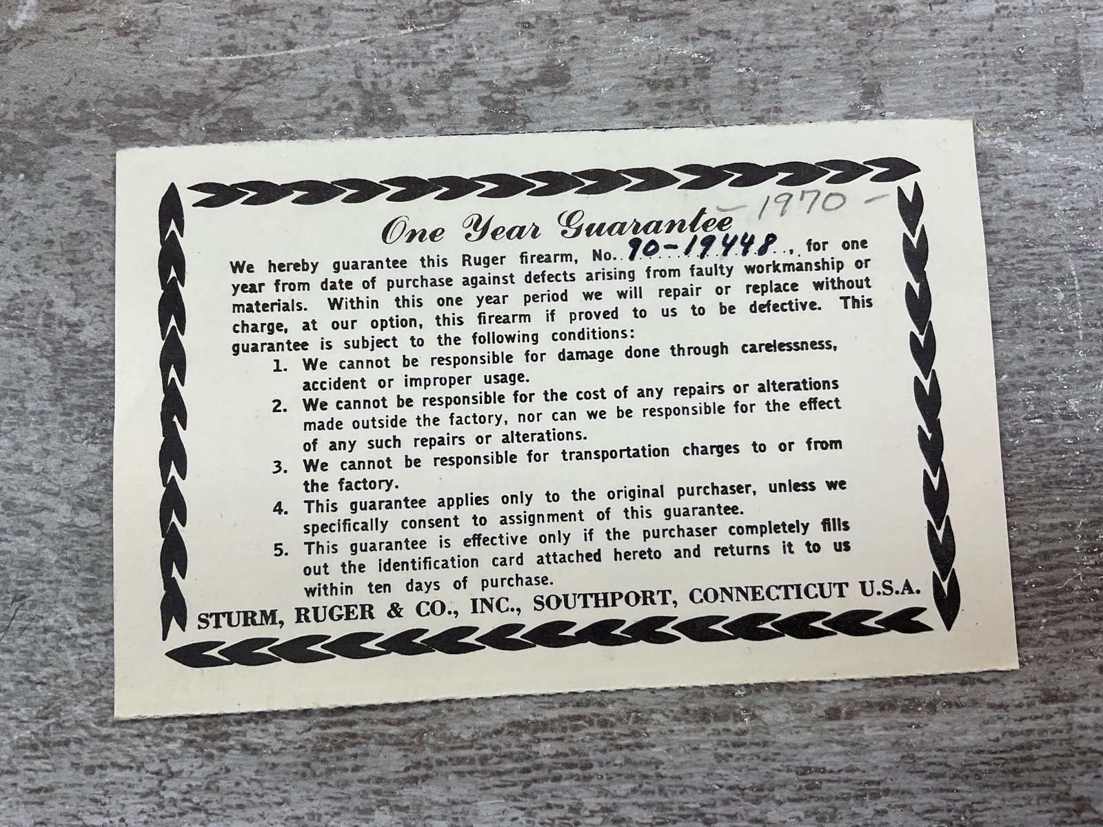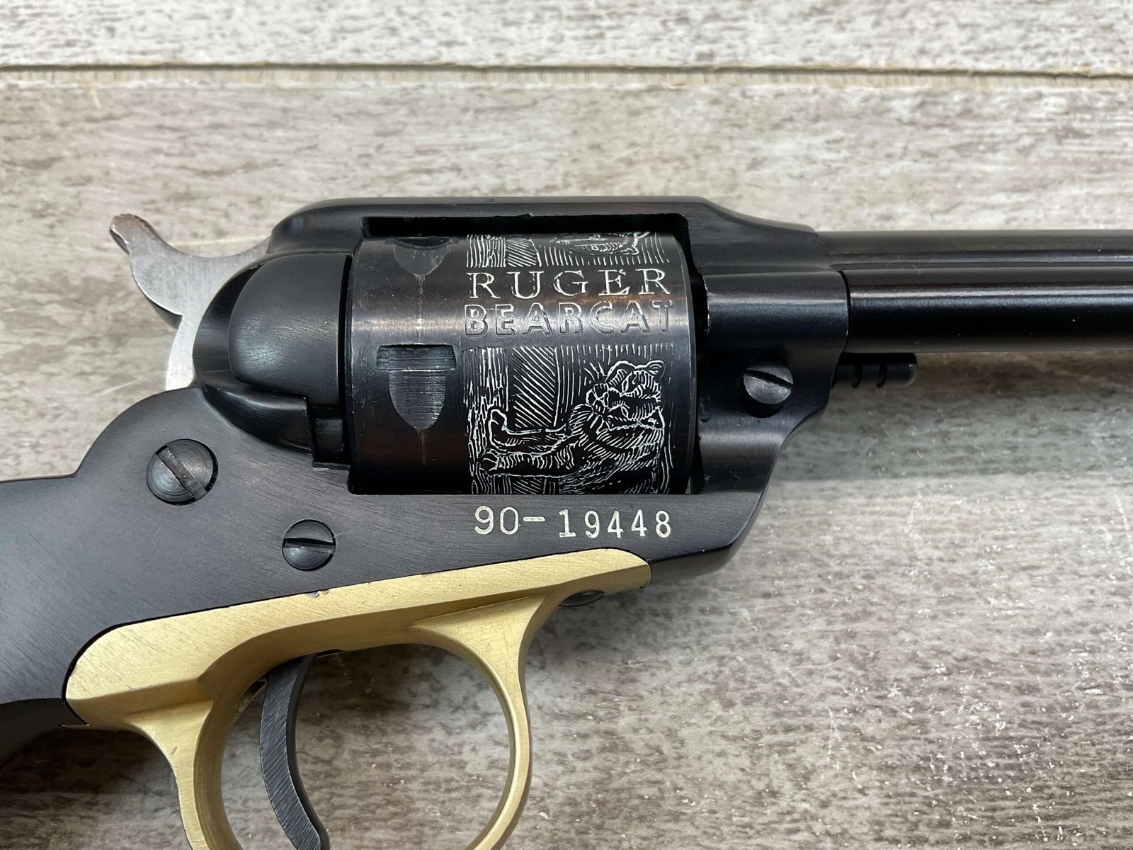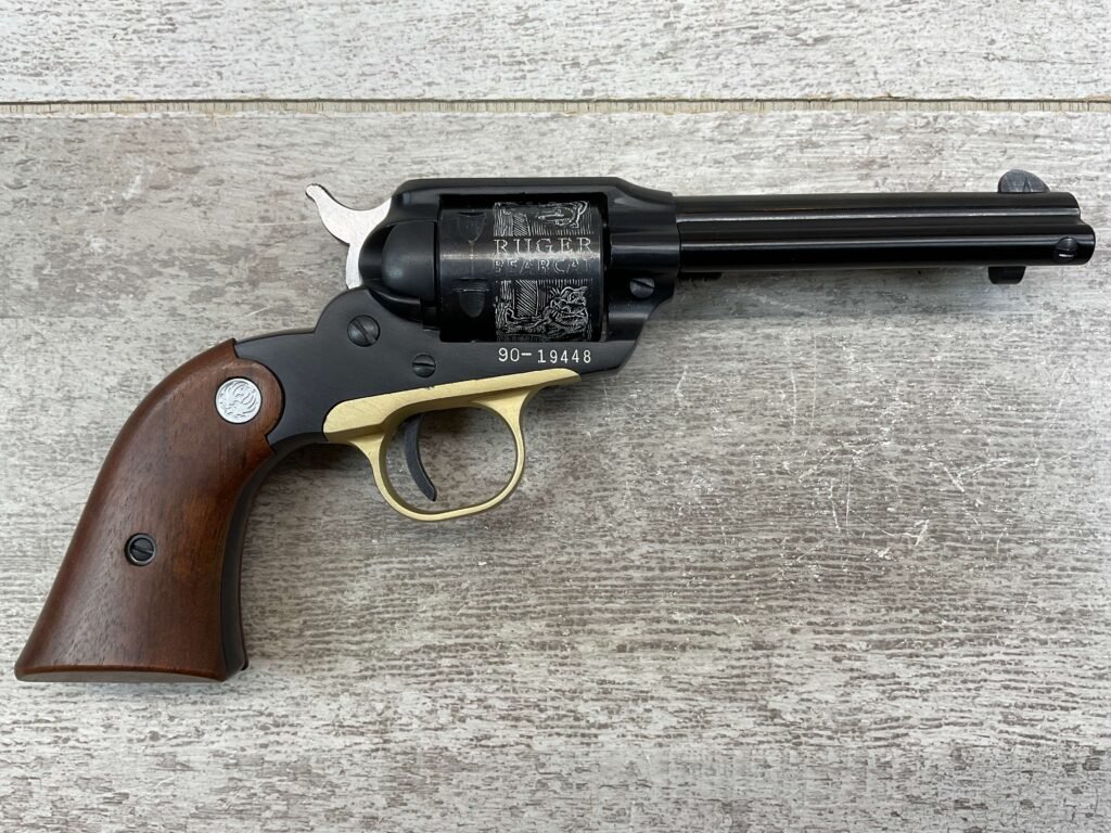 RUGER BEARCAT .22LR REVOLVER, 1970 MFR, IN BOX, MINTY, #90-19448, 4″ BARREL, EXC BLUE, EXC SMOOTH WOOD RUGER GRIPS, LEFT BARREL MARKED “STURM, RUGER & CO / SOUTHPORT, CONN.”, CYLINDER MARKED WITH BEARCAT DESIGN “RUGER BEARCAT”, UNDER RIGHT SIDE OF CYLINDER MARKED “90-19448”, EXC BRIGHT BORE W/EXC RIFLING, TIGHT LOCKUP & SMOOTH ACTION, 98%+ OVERALL, LIKE NEW CONDTION!!
