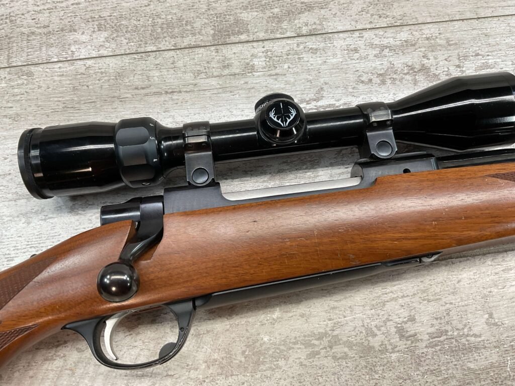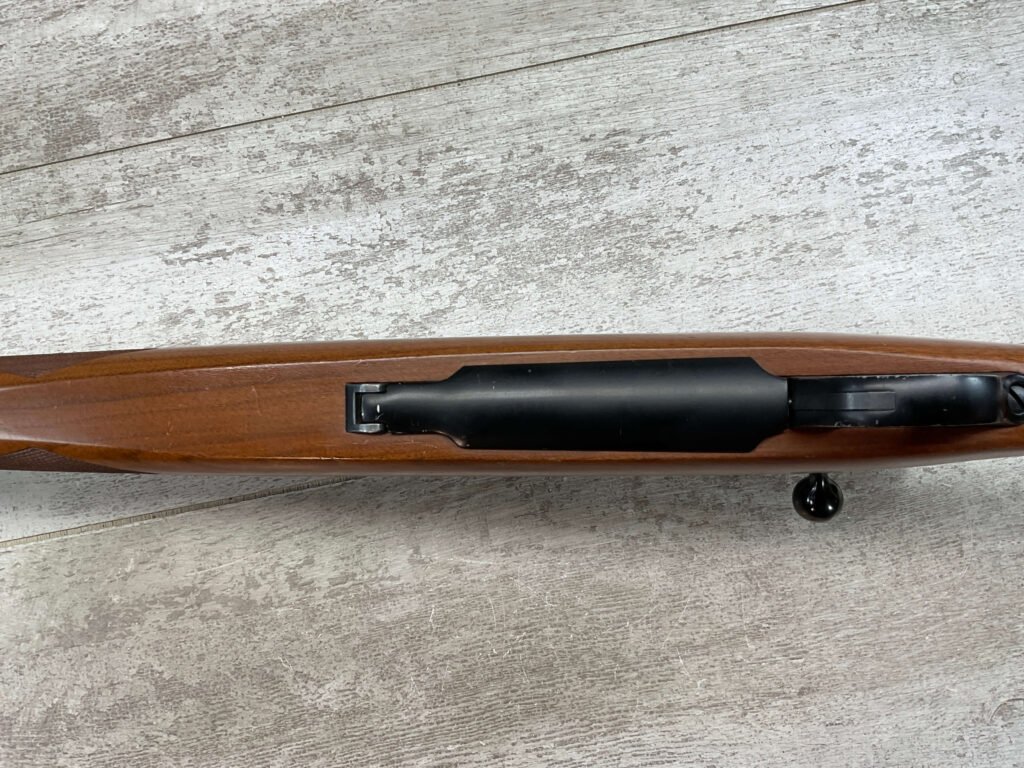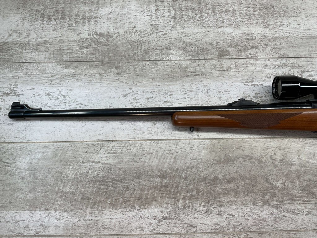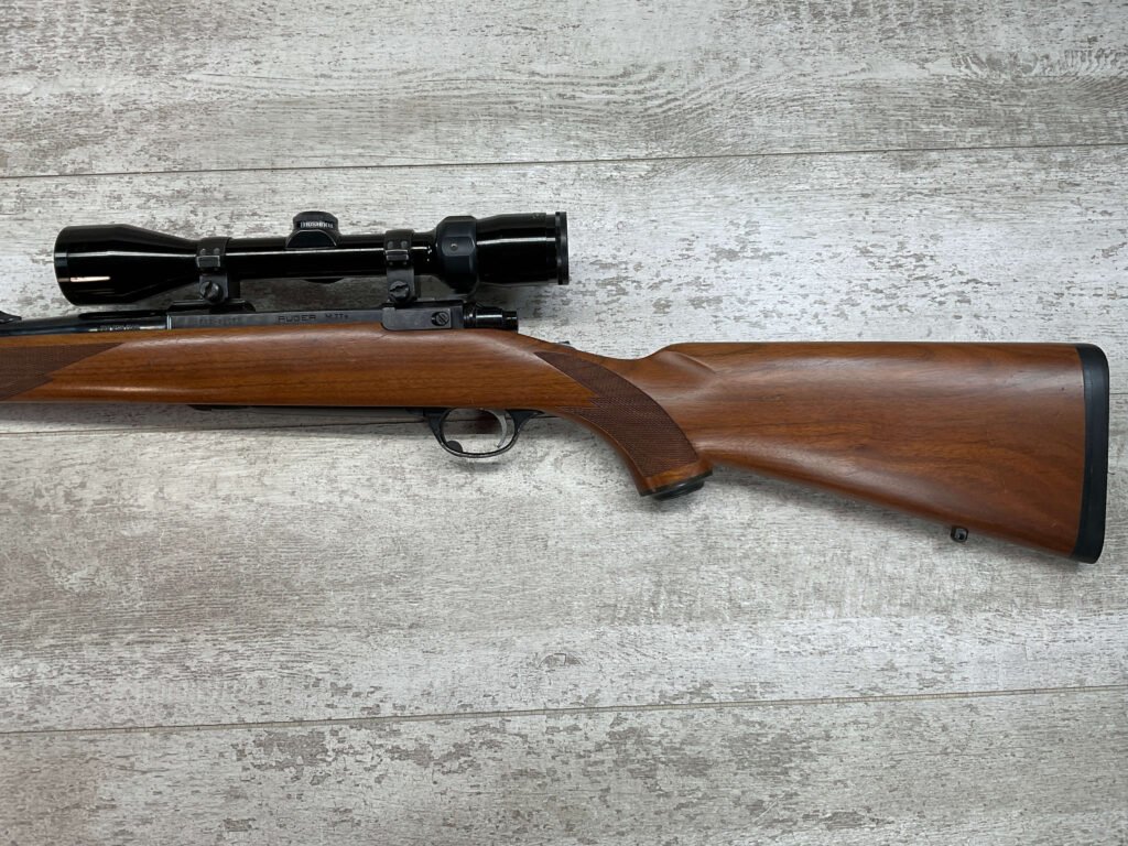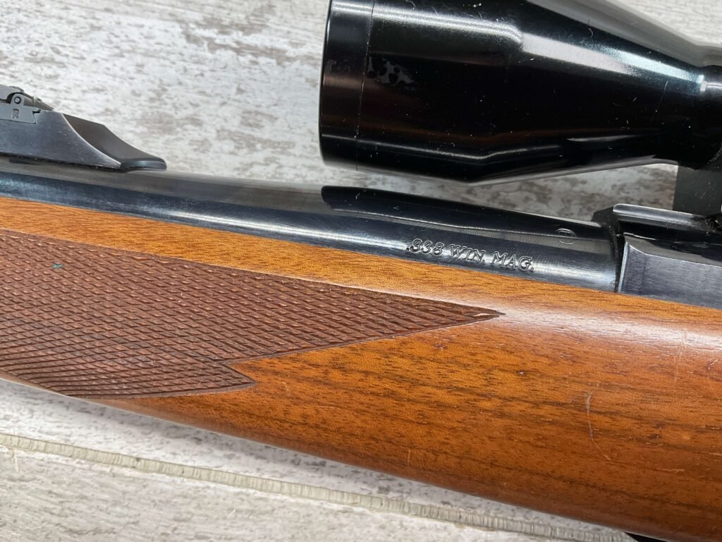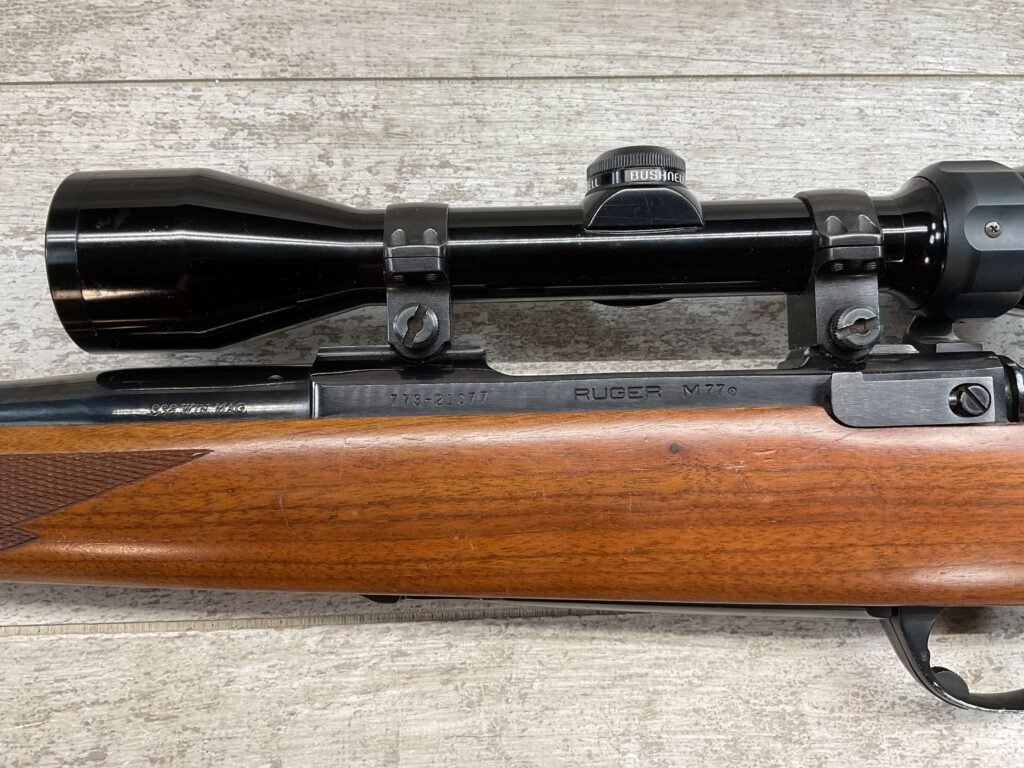 RUGER M77 .338 WIN MAG BIG BORE BOLT ACTION RIFLE #773-21077, 24″ HEAVY BARREL, EXC CHECKERED WALNUT STOCK W/LIGHT SCRATCHES FROM USE, WINCHESTER RUBBER BUTT PAD, .338 WINCHESTER MAGNUM, 3-9X40 BUSHNELL SCOPE, STANDARD IRON SIGHTS, EXCELLENT ELK & BIG GAME RIFLE!!