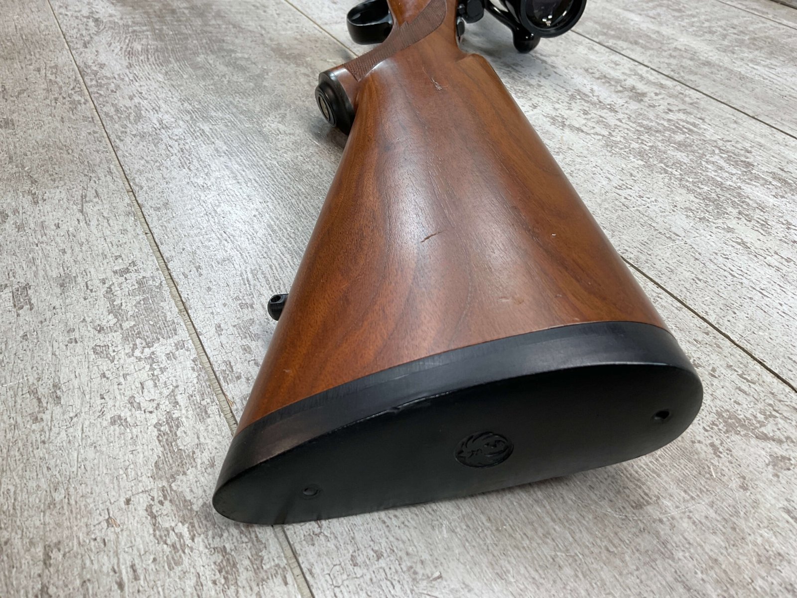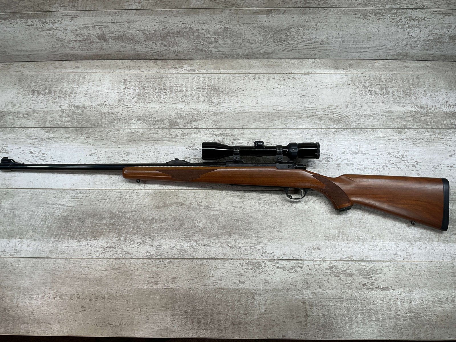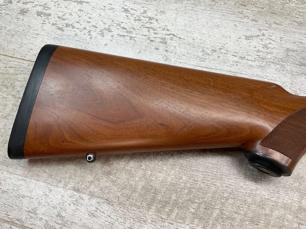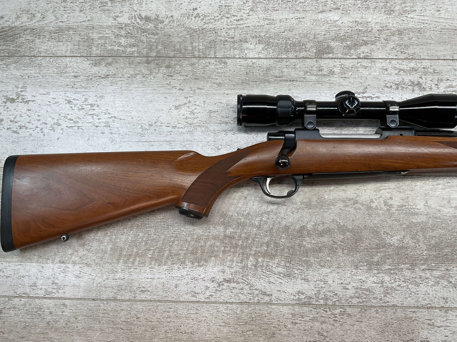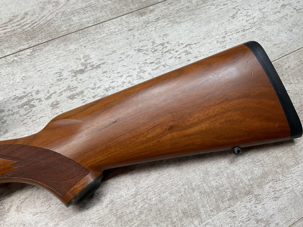 RUGER M77 .338 WIN MAG BIG BORE BOLT ACTION RIFLE #773-21077, 24″ HEAVY BARREL, EXC CHECKERED WALNUT STOCK W/LIGHT SCRATCHES FROM USE, WINCHESTER RUBBER BUTT PAD, .338 WINCHESTER MAGNUM, 3-9X40 BUSHNELL SCOPE, STANDARD IRON SIGHTS, EXCELLENT ELK & BIG GAME RIFLE!!