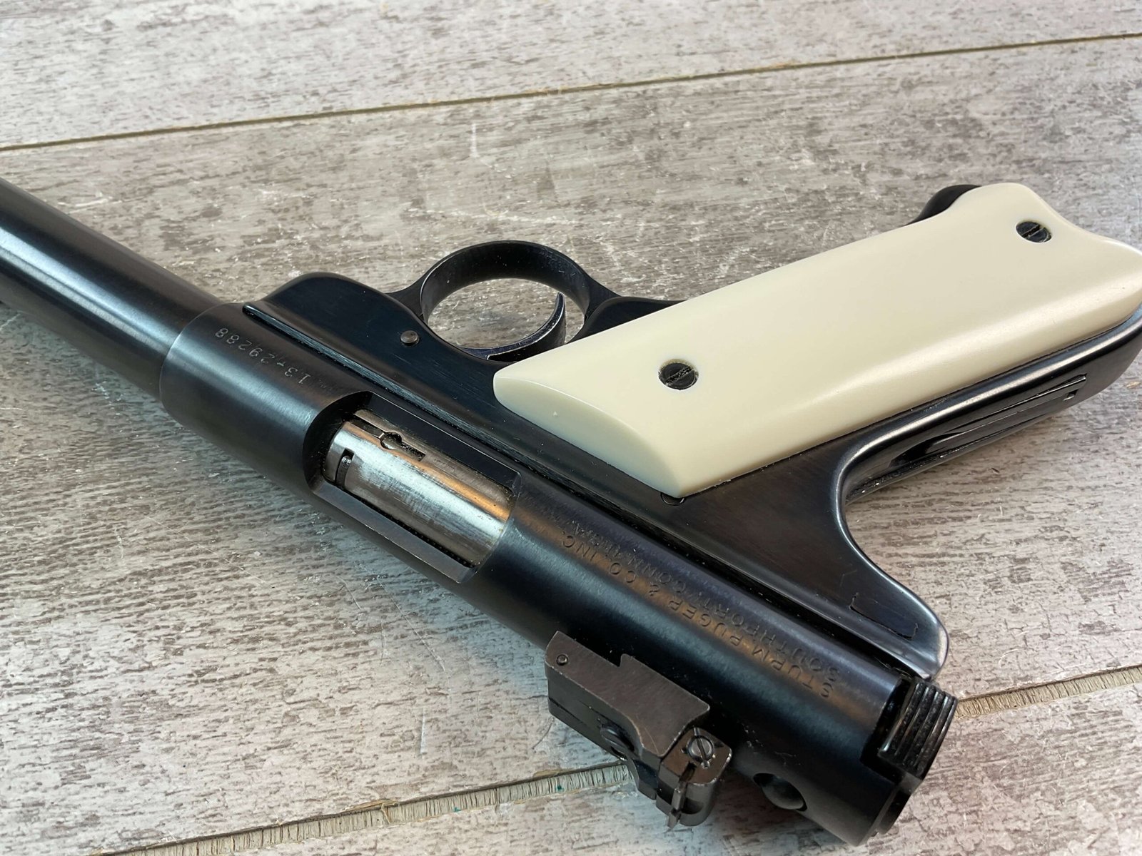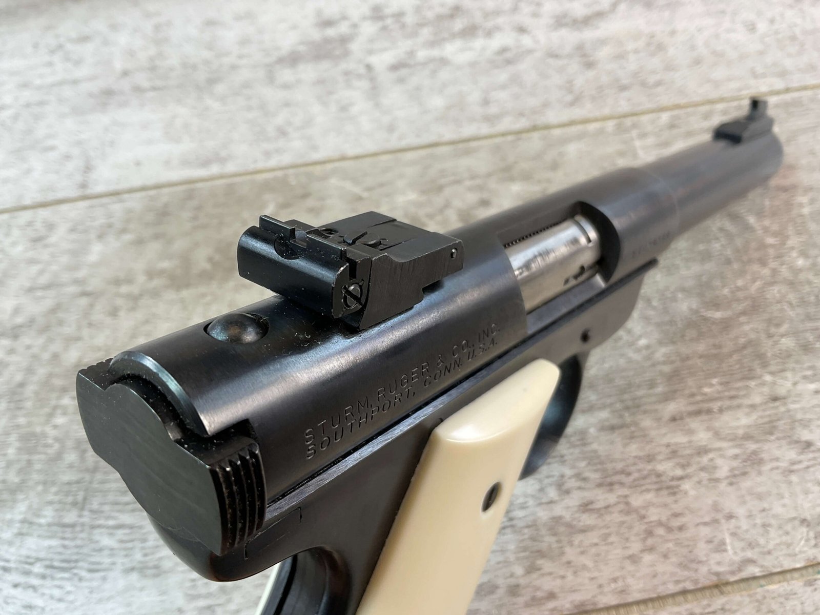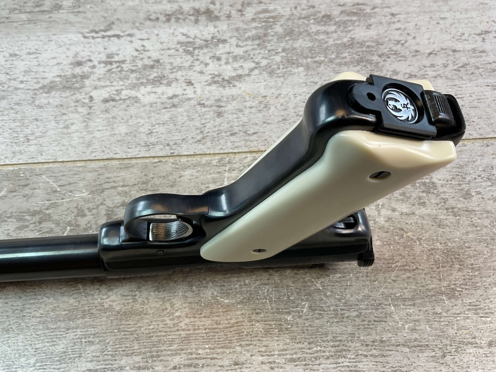 RUGER MARK I .22LR SEMI AUTO PISTOL, JAMES EARL JONES “FAVORITES” COLLECTION #13-29288, 5.5″ BULL BARREL, EXC BORE & RIFLING, EXC BLUE FINISH, ADJ REAR SIGHT, BLADE FRONT SIGHT, 1 OEM BLACK BACKGROUND EAGLE LOGO MAGAZINE, NON FACTORY GRIPS- SMOOTH IVORY LIKE, A-100 FRAME, CONDITION AS SHOWN IN PICTURES, FROM THE JAMES EARL JONES “FAVORITES” COLLECTION W/ CERTIFICATE OF AUTHENTICITY.