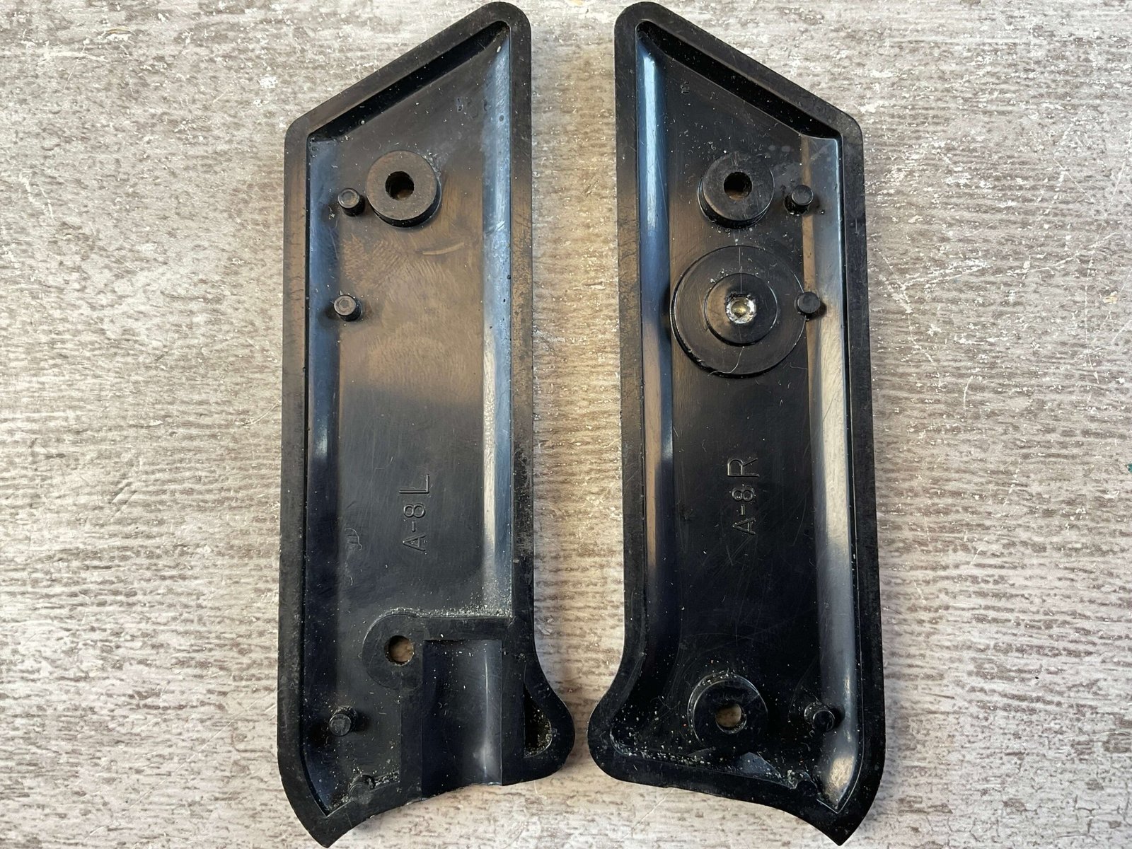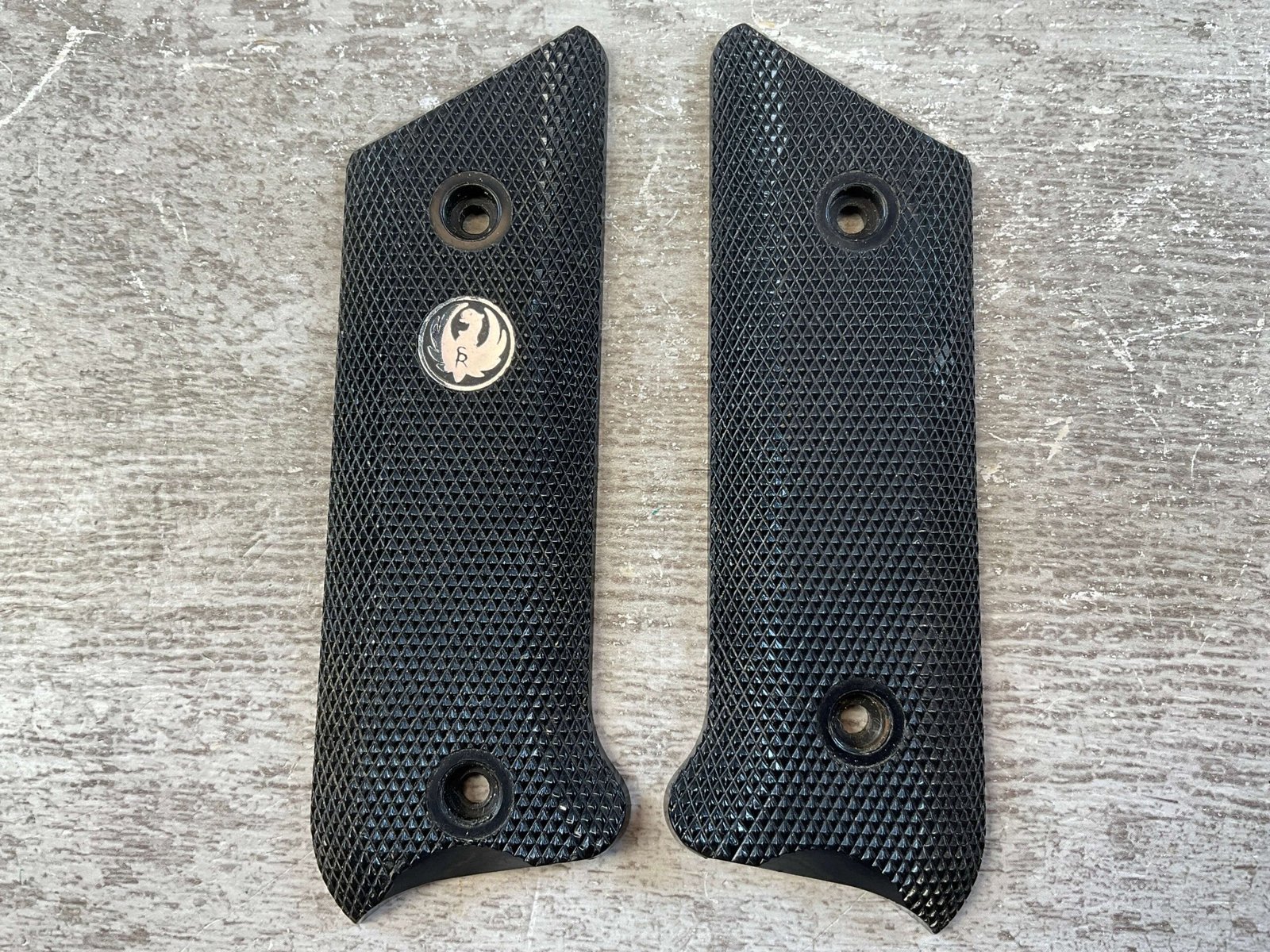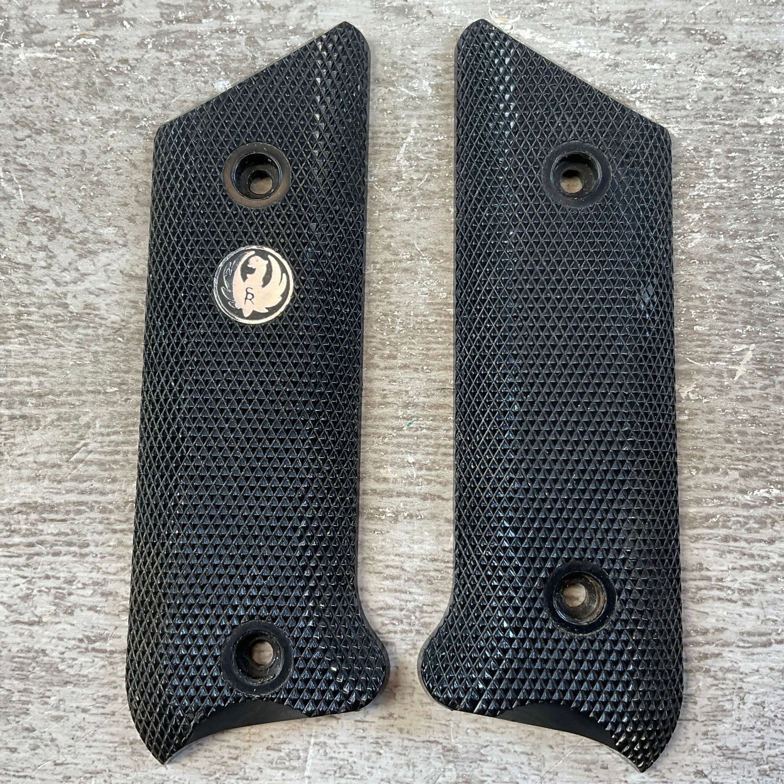 RUGER MK I / EARLY MK II PLASTIC CHECKERED GRIPS, BLACK WITH SILVER LOGO, DOES NOT COME WITH SCREWS, IN VERY GOOD/EXCELLENT CONDITION.