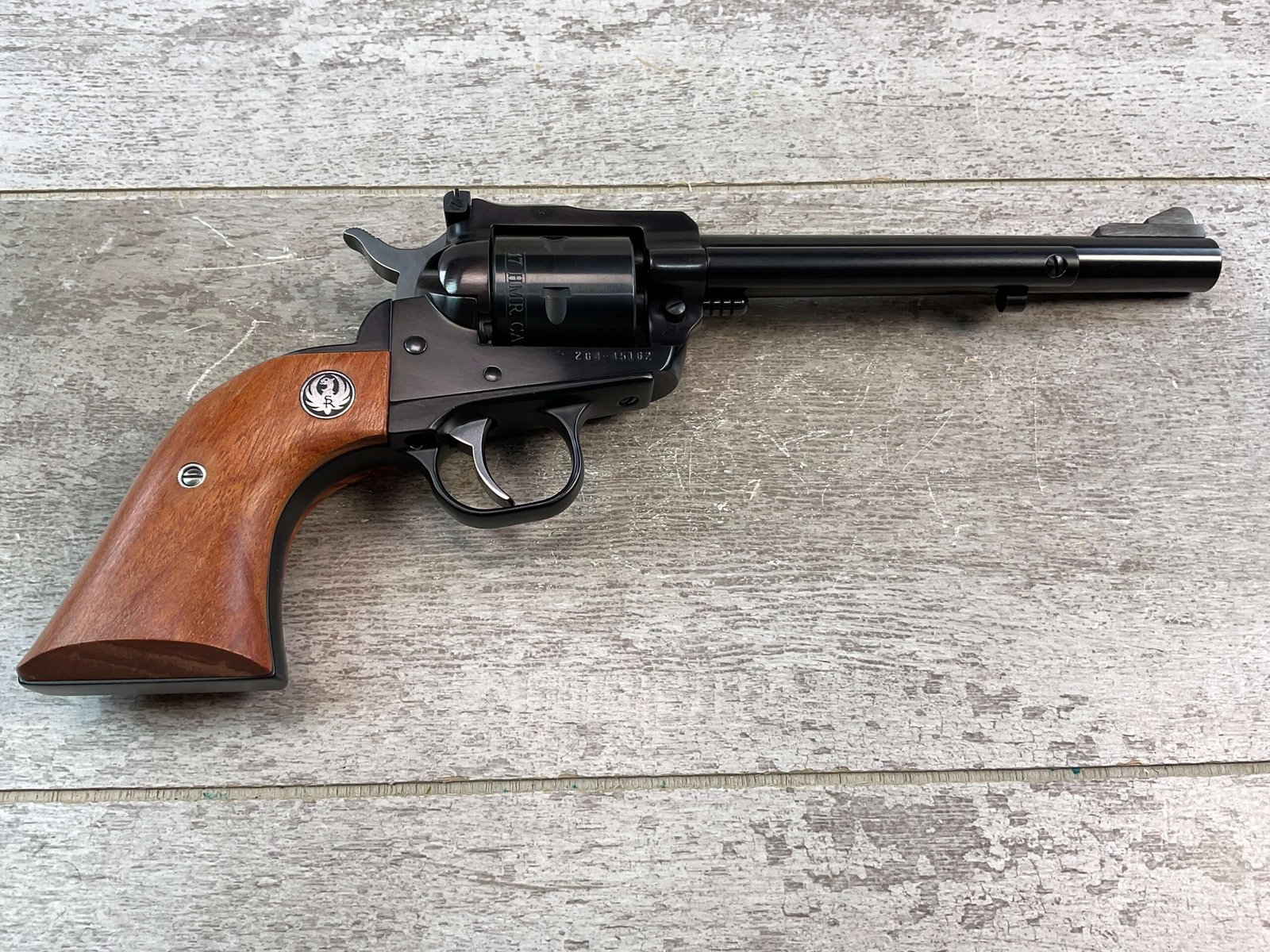 RUGER NEW MODEL SINGLE SIX 17HMR REVOLVER, JAMES EARL JONES COLLECTION, MINTY #264-45162, 6.5″ BARREL, EXC BORE & RIFLING, EXC 98%+ BLUE FINISH, EXC SMOOTH WALNUT RUGER GRIPS, TIGHT LOCKUP, SMOOTH ACTION, CONDITION AS SHOWN IN PICTURES, FROM THE JAMES EARL JONES “FAVORITES” COLLECTION W/ CERTIFICATE OF AUTHENTICITY.