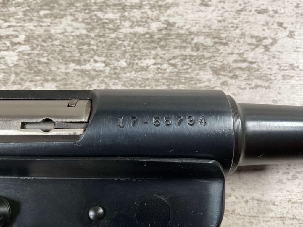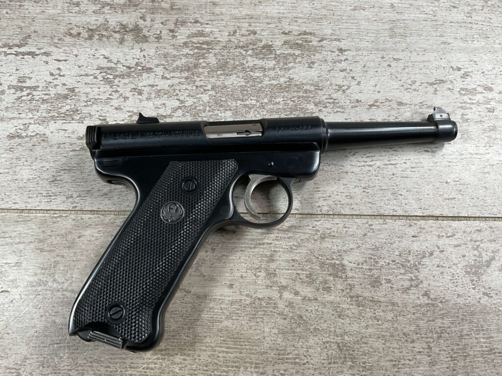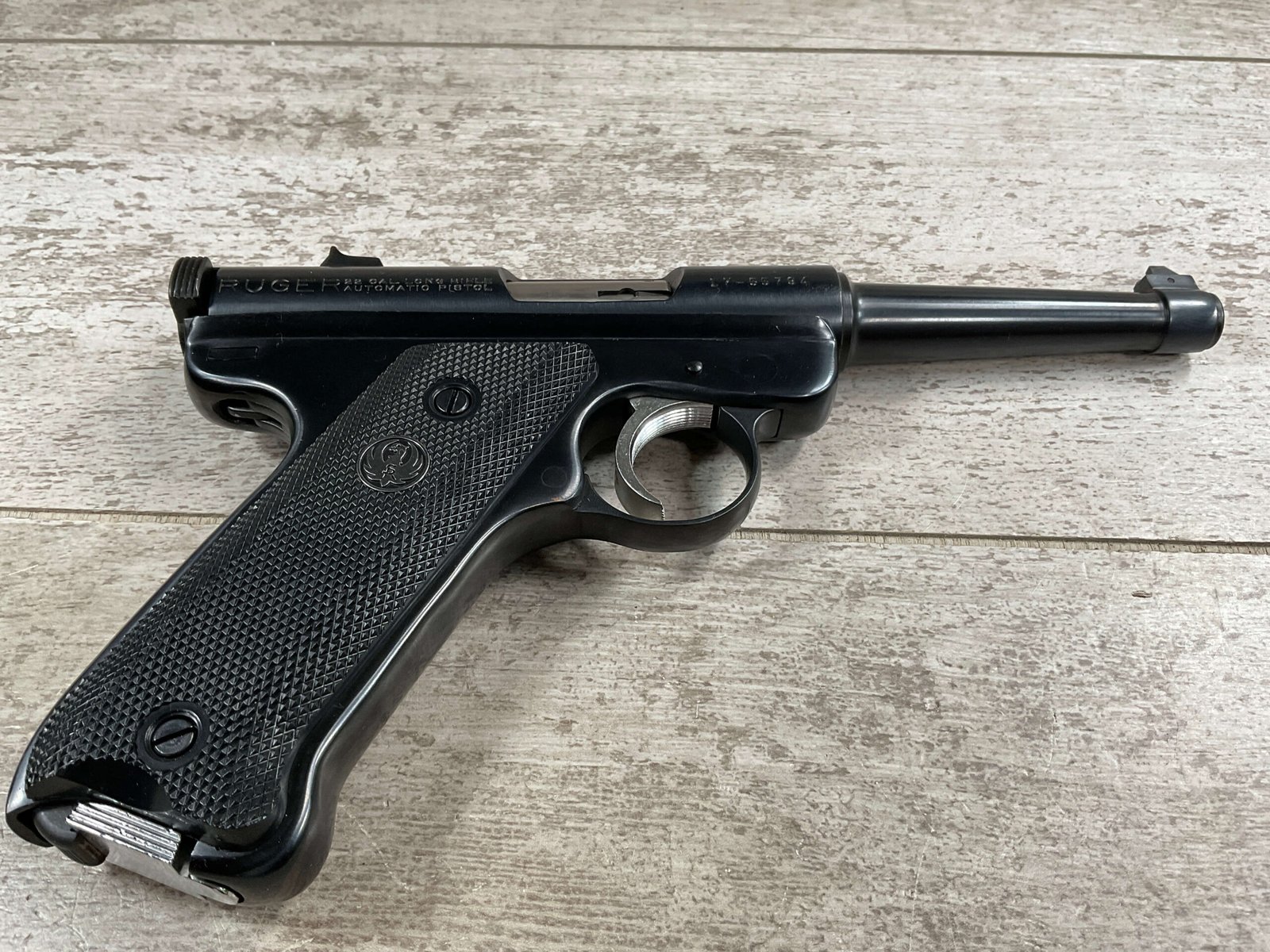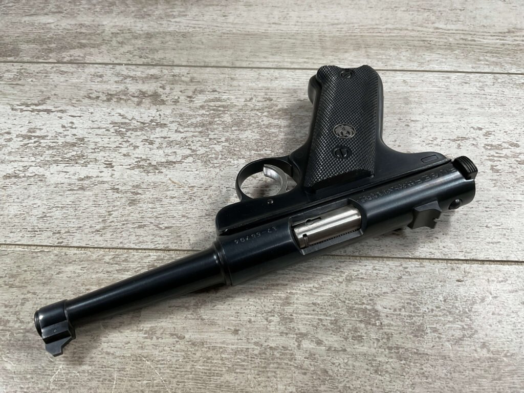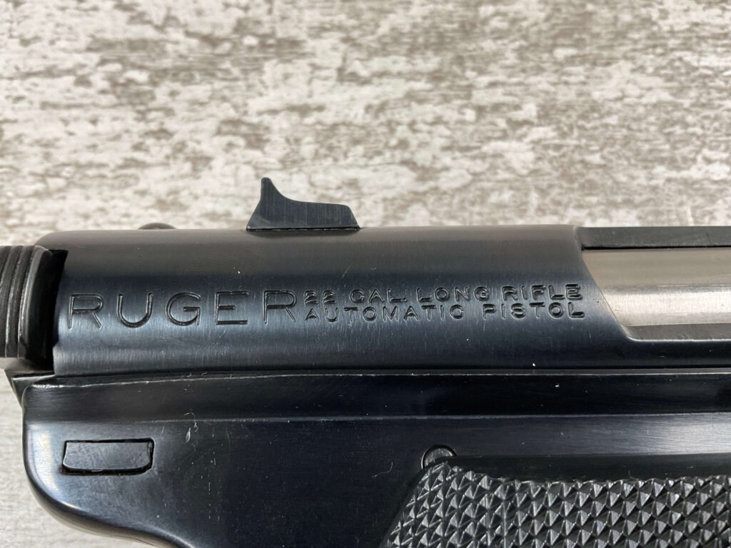 RUGER STANDARD MODEL .22LR SEMI AUTO PISTOL, W/BOX #17-55794, “BLACK EAGLE”,SEMI AUTOMATIC, 1982 MFR, 4.75″ BARREL, 10 ROUND MAGAZINE, EXC ORIGINAL BLUE W/ONLY A COUPLE OF LIGHT HANDLING MARKS, EXC BLACK PLASTIC CHECKERED GRIPS, VG-EXC SHINY BORE (8/10) W/LIGHT WEAR, FIXED SIGHTS, LIKE NEW CONDITION & LAST YEAR PRODUCTION W/ORIGINAL BOX & PAPERS INCLUDED! 98%