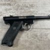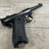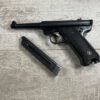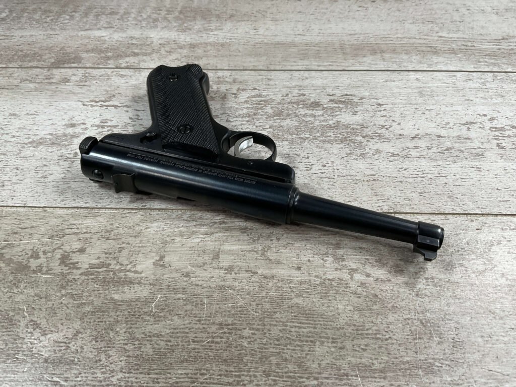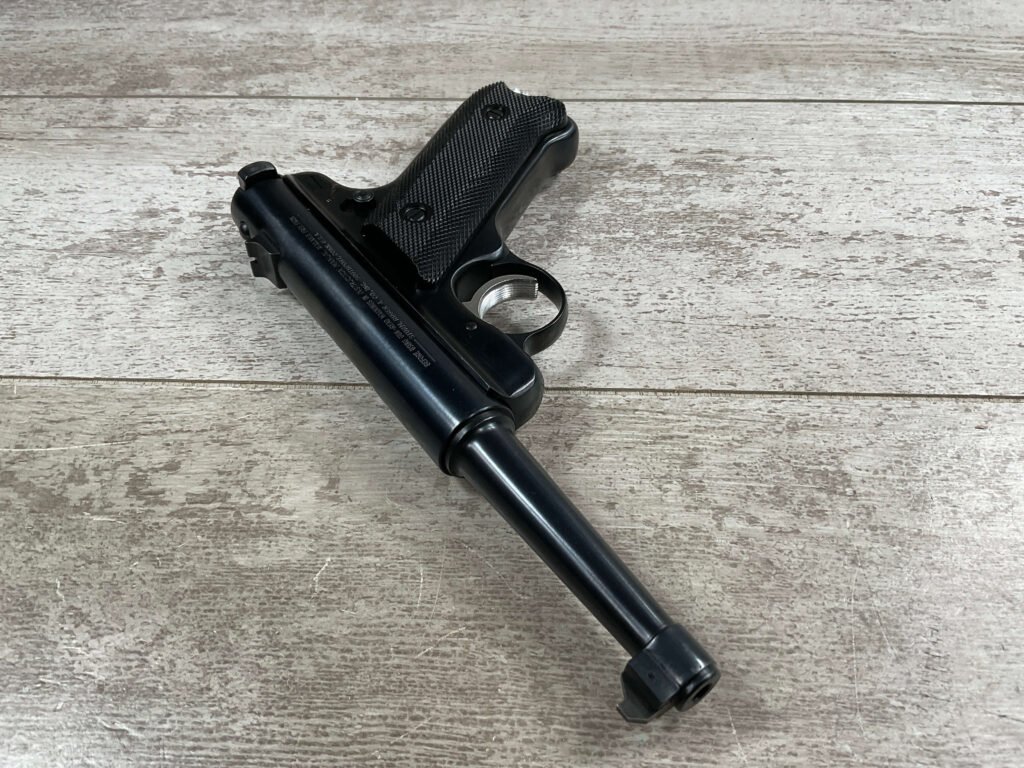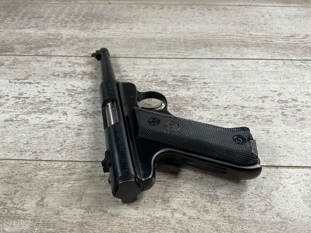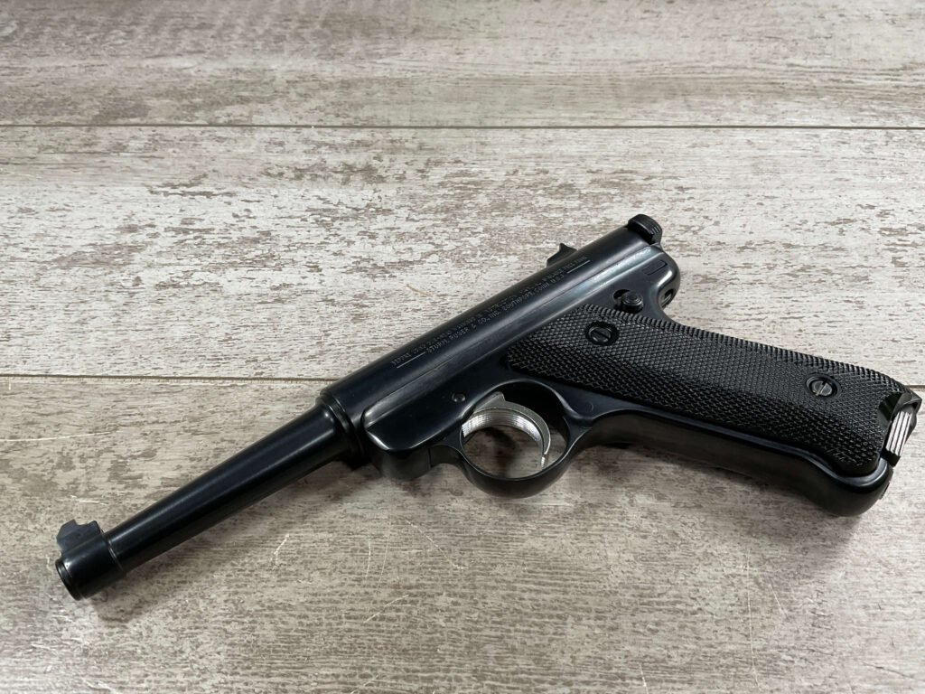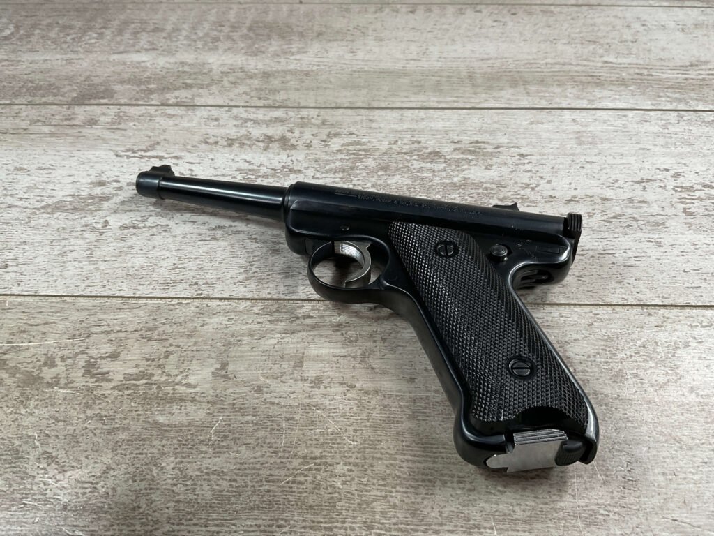 RUGER STANDARD MODEL .22LR SEMI AUTO PISTOL, W/BOX #17-55794, “BLACK EAGLE”,SEMI AUTOMATIC, 1982 MFR, 4.75″ BARREL, 10 ROUND MAGAZINE, EXC ORIGINAL BLUE W/ONLY A COUPLE OF LIGHT HANDLING MARKS, EXC BLACK PLASTIC CHECKERED GRIPS, VG-EXC SHINY BORE (8/10) W/LIGHT WEAR, FIXED SIGHTS, LIKE NEW CONDITION & LAST YEAR PRODUCTION W/ORIGINAL BOX & PAPERS INCLUDED! 98%