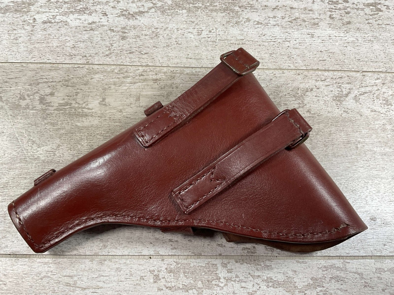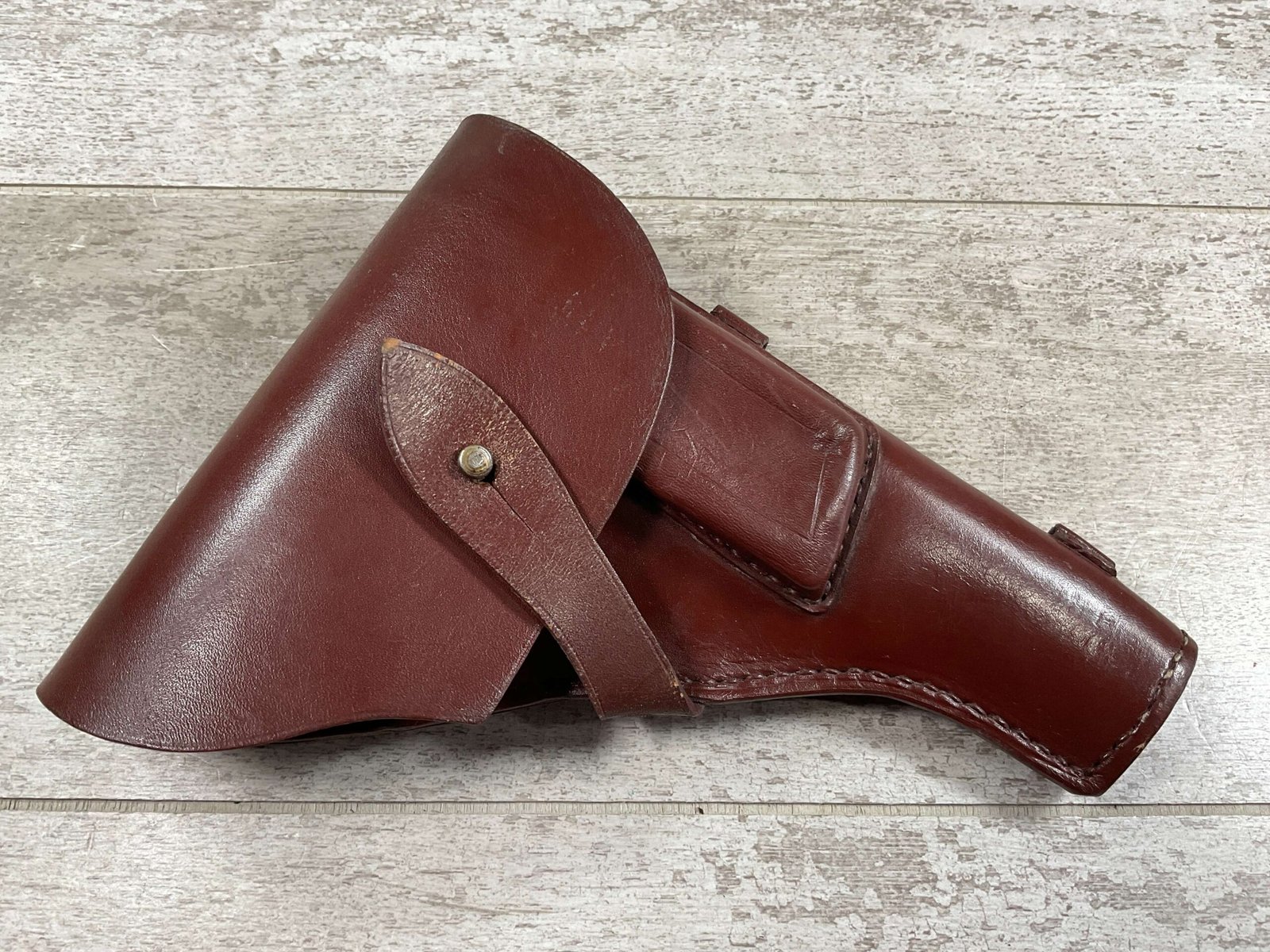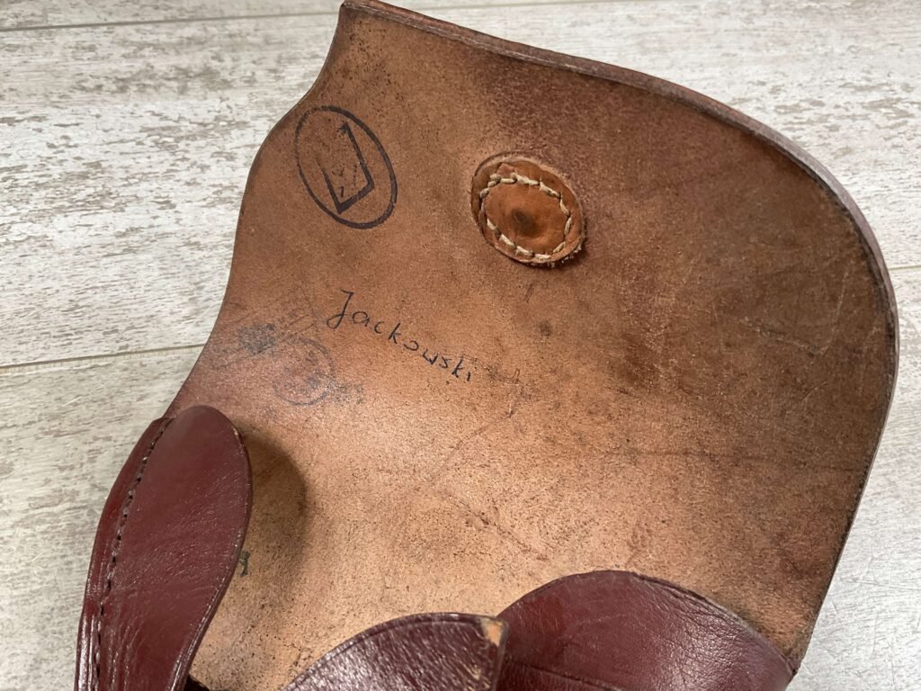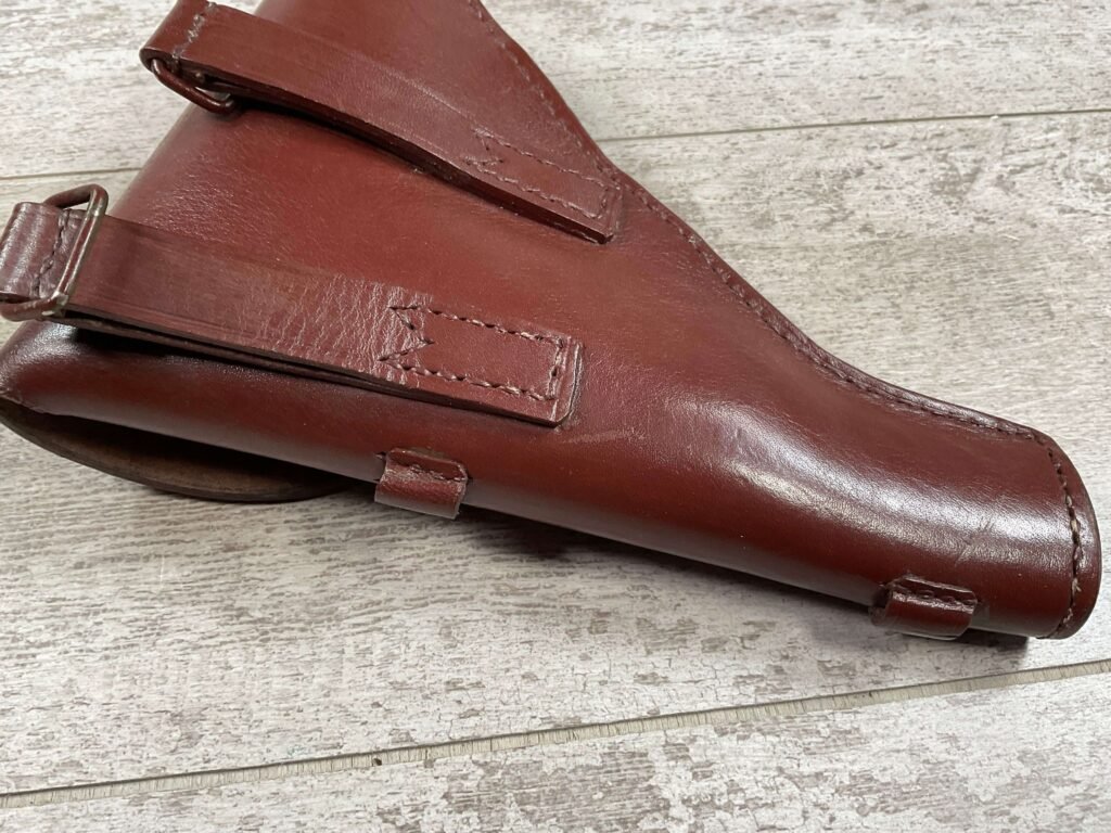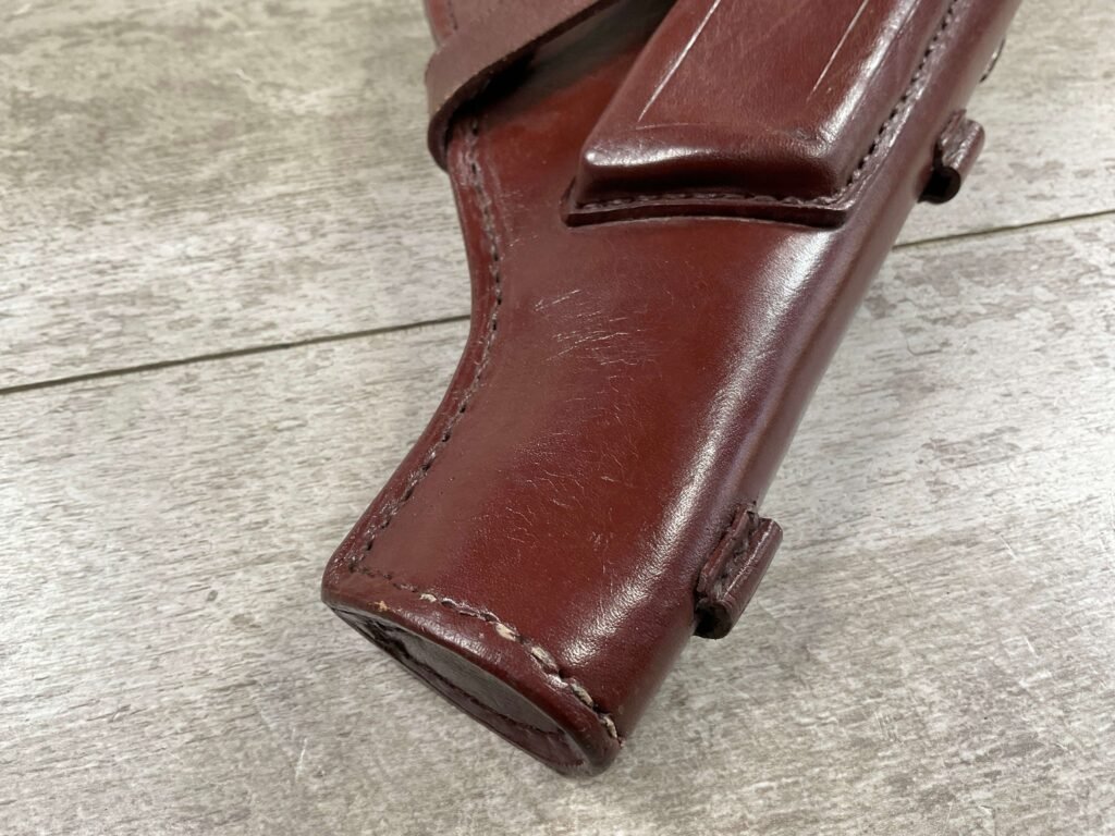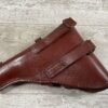 RUSSIAN TT-33 BROWN HOLSTER , “JACKOWSKI” HAND WRITTEN INSIDE UNDER THE FLAP, MULTIPLE STAMPS INSIDE INDER FLAP AS WELL, METAL D RINGS FOR ATTACHING TO SHOULDER STRAP, CLEANING ROD LOOPS, EXC STITCHING AND OVERALL CONDITION