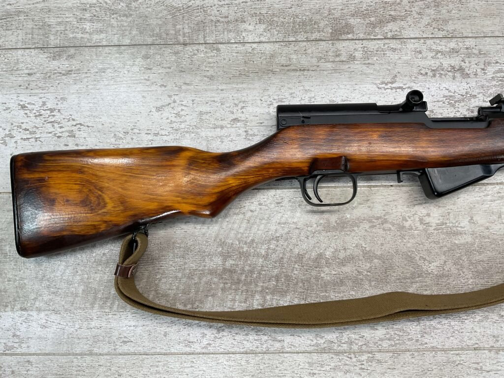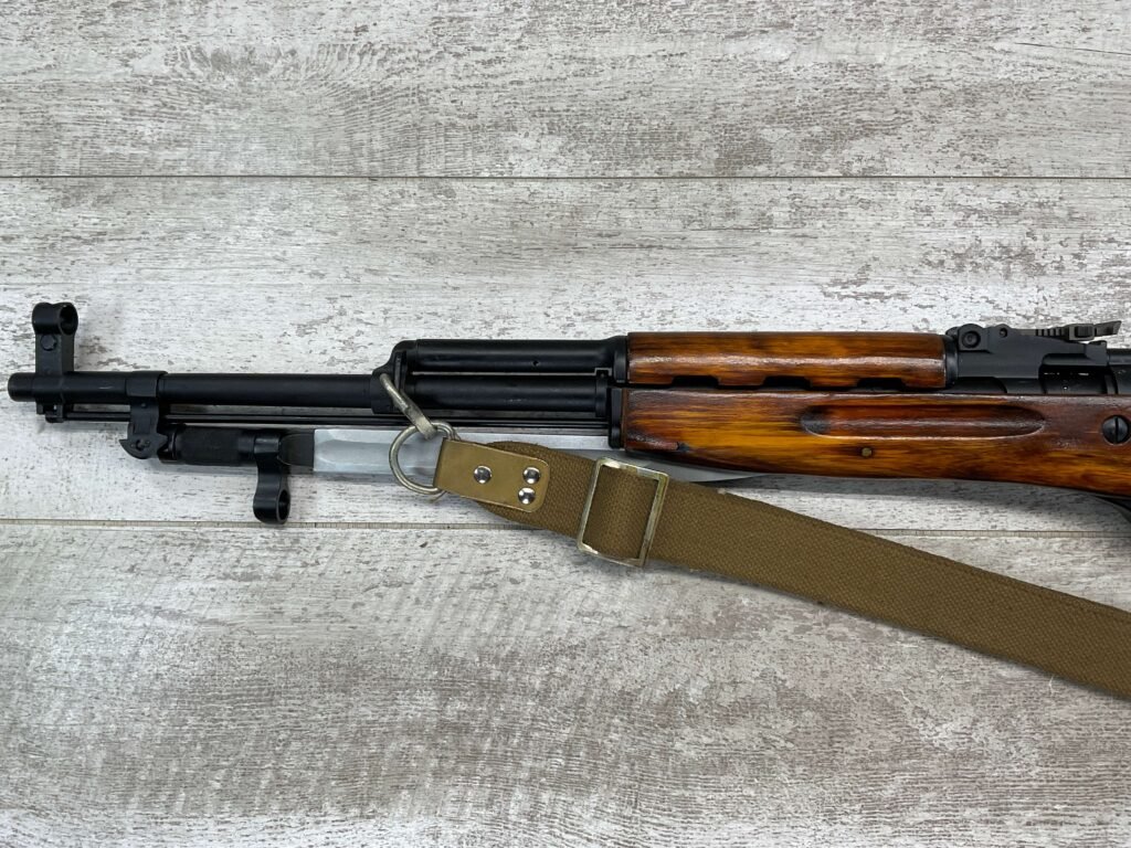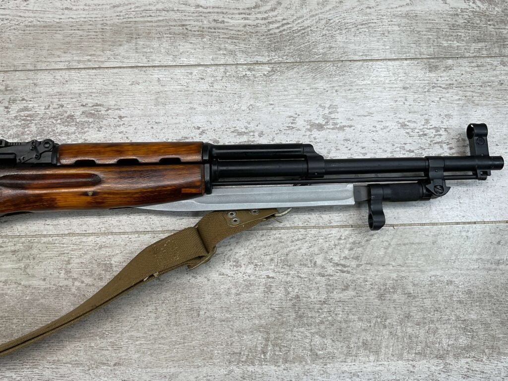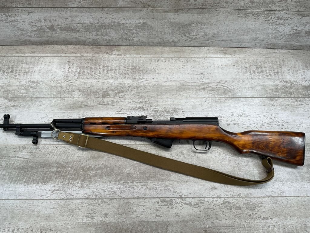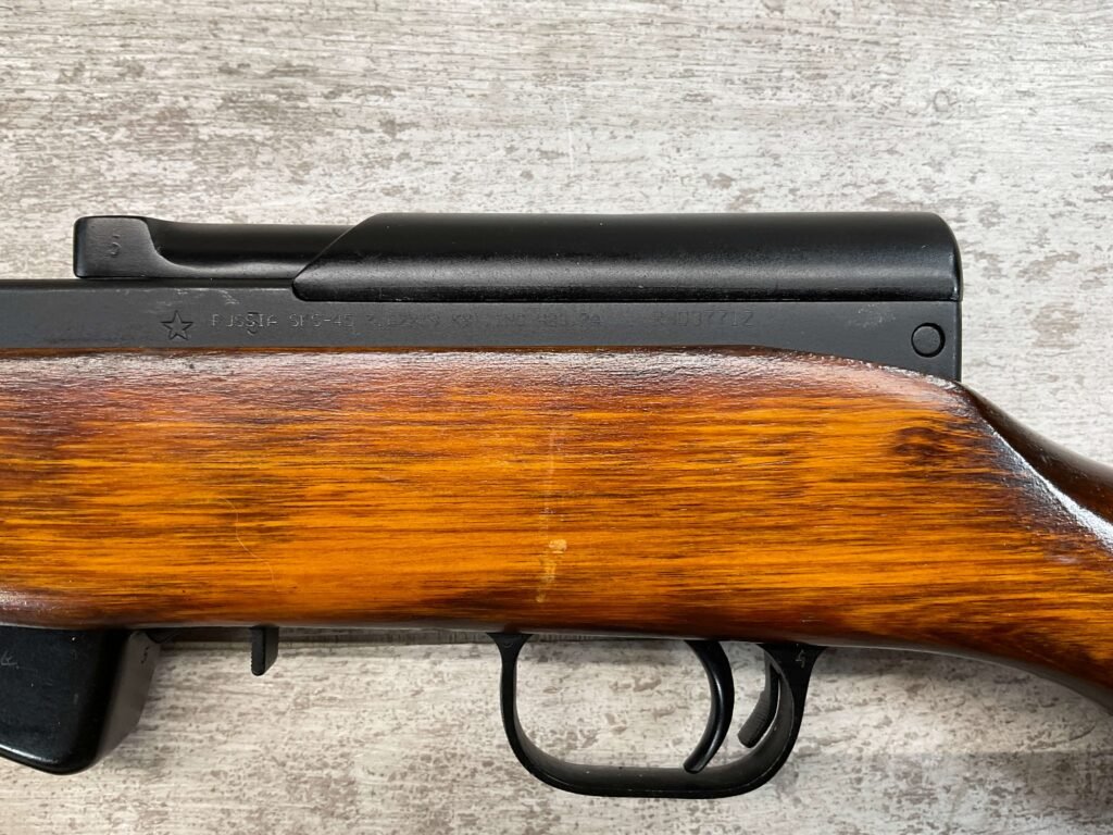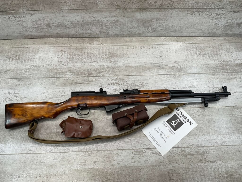 RUSSIAN TULA SKS 7.62X39 RIFLE W/BAYONET, 1955/56 MFR #2357 / RH007712, 7.62X39MM, 20″ BARREL, EXC SOLID BIRCH WOOD STOCK, BLADE BAYONET, TEN ROUND MAGAZINE, EVERYTHING MATCHES, CLEANING ROD, ARSENAL REFINISHED, CLEANING KIT IN TRAPDOOR OF BUTT STOCK, CANVAS SLING, STRIPPER CLIPS, ORIGINAL BOX, KBI INC IMPORT MARK ON LEFT SIDE OF RECEIVER, 98+% OVERALL