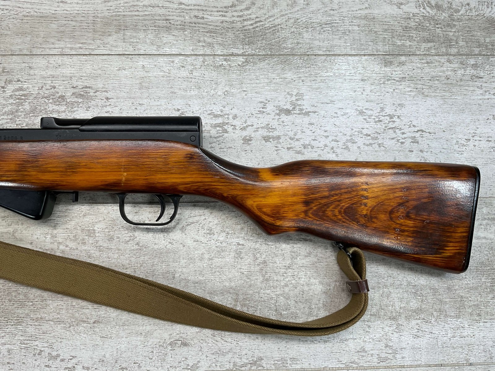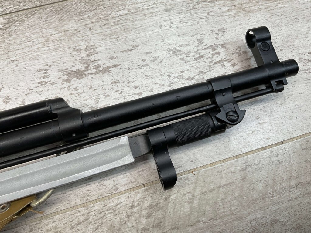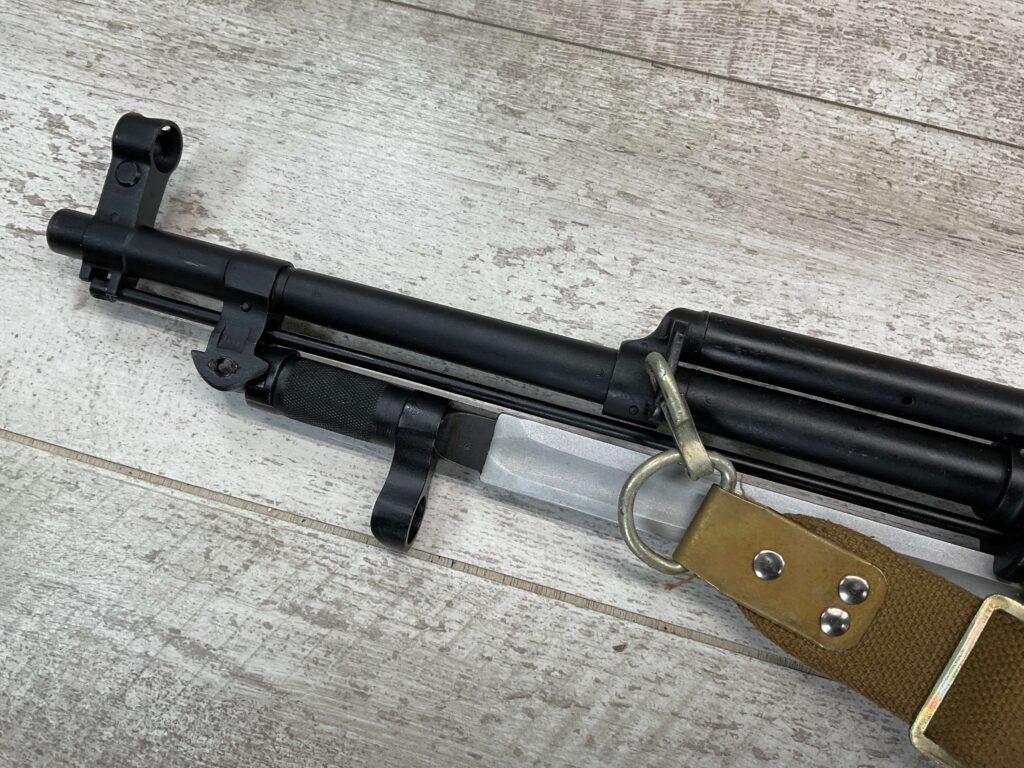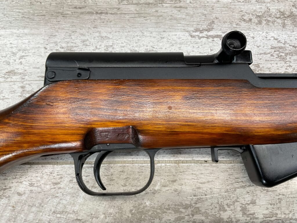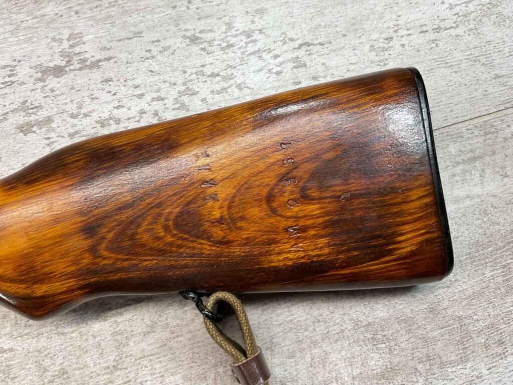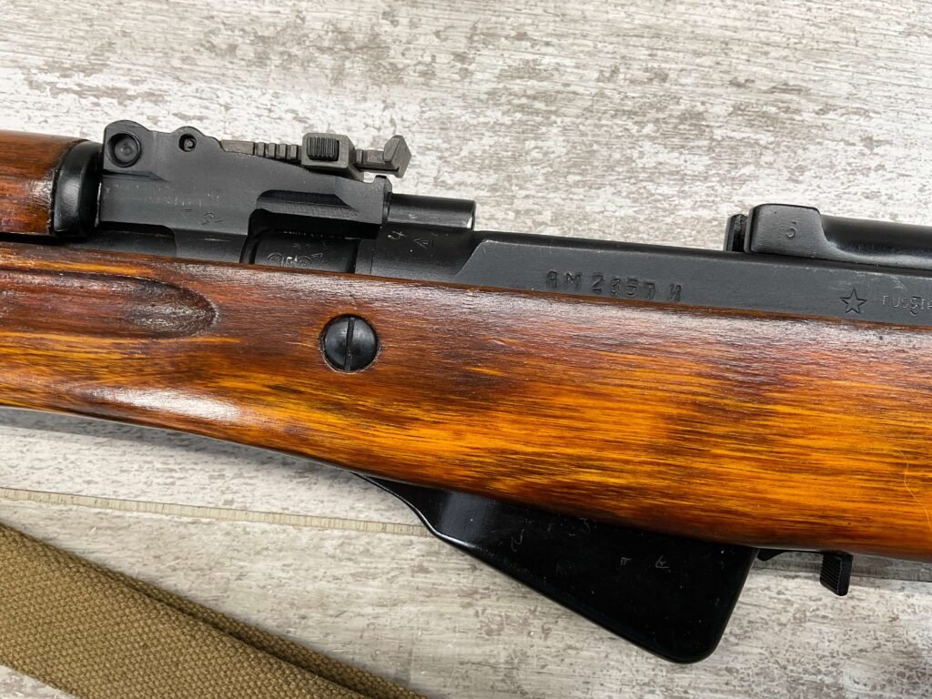 RUSSIAN TULA SKS 7.62X39 RIFLE W/BAYONET, 1955/56 MFR #2357 / RH007712, 7.62X39MM, 20″ BARREL, EXC SOLID BIRCH WOOD STOCK, BLADE BAYONET, TEN ROUND MAGAZINE, EVERYTHING MATCHES, CLEANING ROD, ARSENAL REFINISHED, CLEANING KIT IN TRAPDOOR OF BUTT STOCK, CANVAS SLING, STRIPPER CLIPS, ORIGINAL BOX, KBI INC IMPORT MARK ON LEFT SIDE OF RECEIVER, 98+% OVERALL