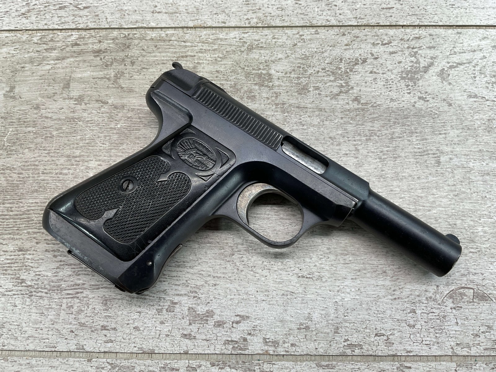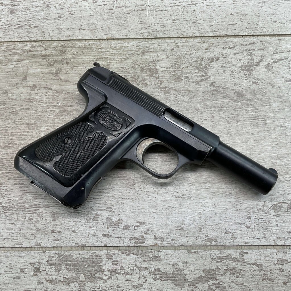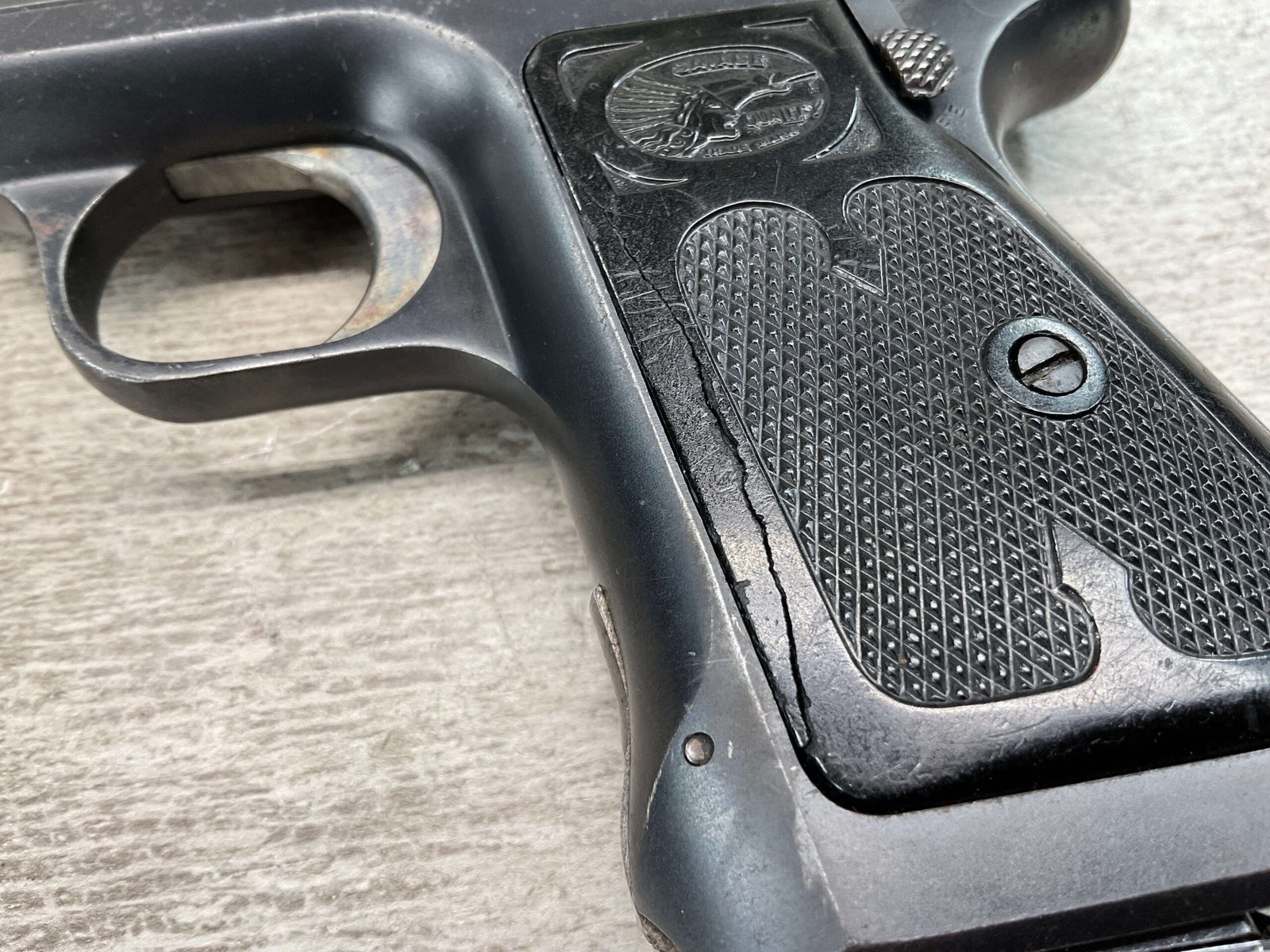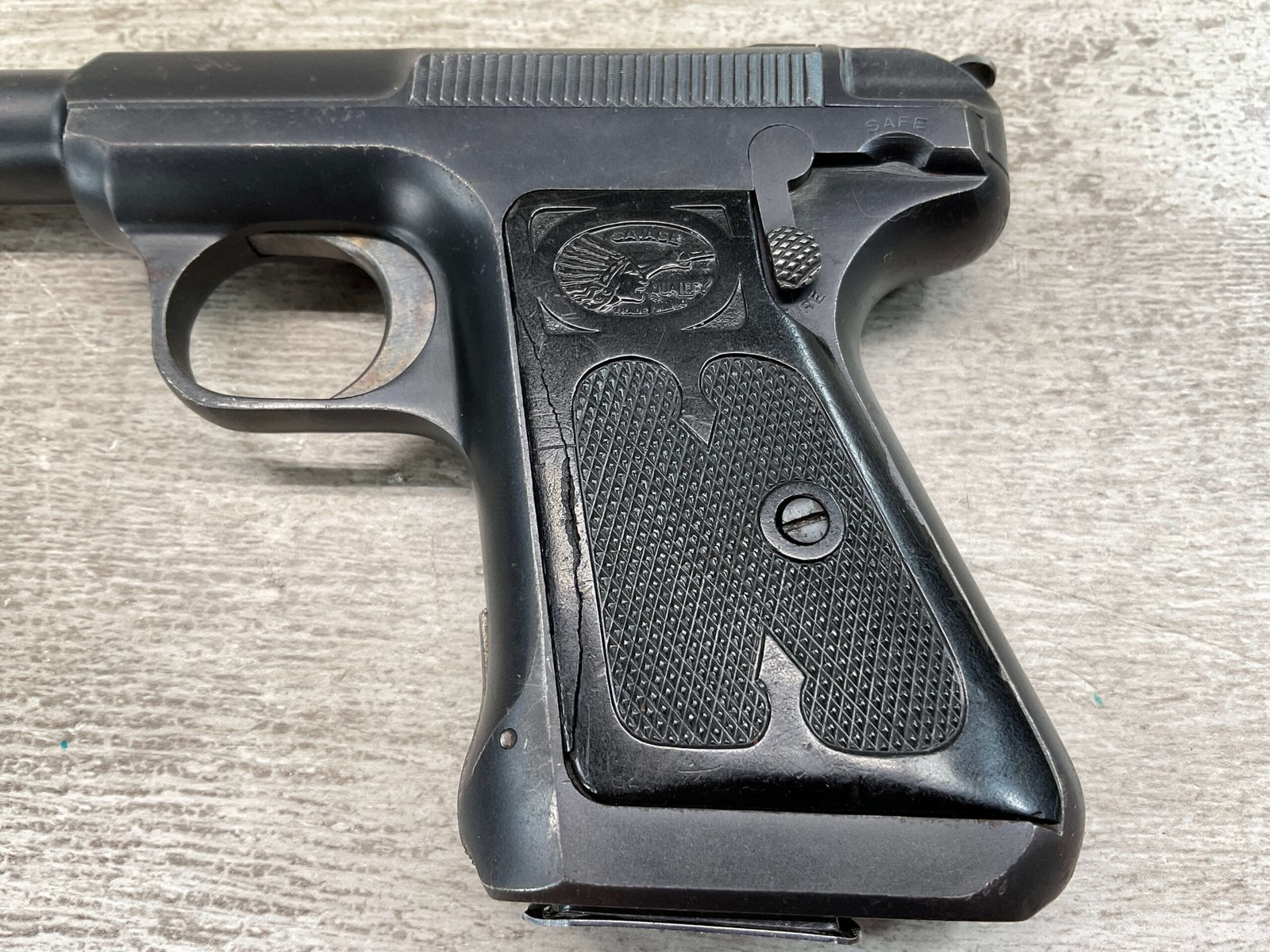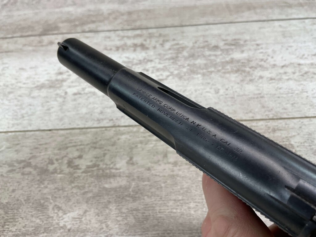 SAVAGE 1917 .32 AUTO SEMI AUTO PISTOL #240523, SPUR COCKING HAMMER, TOP OF SLIDE MARKED “SAVAGE ARMS CORP. UTICA. N.Y. U.S.A. CAL. 32./PATENTED NOVEMBER 21. 1905 -7.65 M-M”, VG TRAPEZOIDAL GRIPS W/SAVAGE QUALITY INDIAN IN OVAL ON TOP LEFT GRIP HAD BEEN REPAIRED (SEE PHOTOS), 3.75″ BARREL, GOOD BORE W/LIGHT FROSTING THROUGHOUT, SOME LIGHT FRECKLING ON BARREL AND RECEIVER, VERY LIGHT SCRATCHES, 10 ROUND MAGAZINE, 95% MATTE BLUE REMAINING, 95+% OVERALL