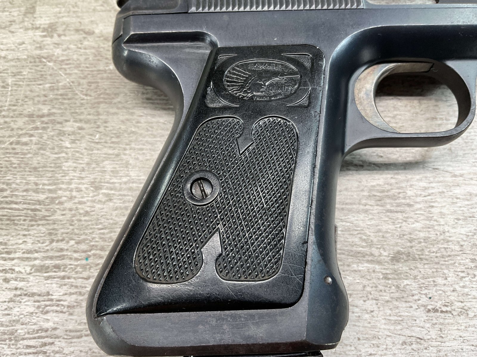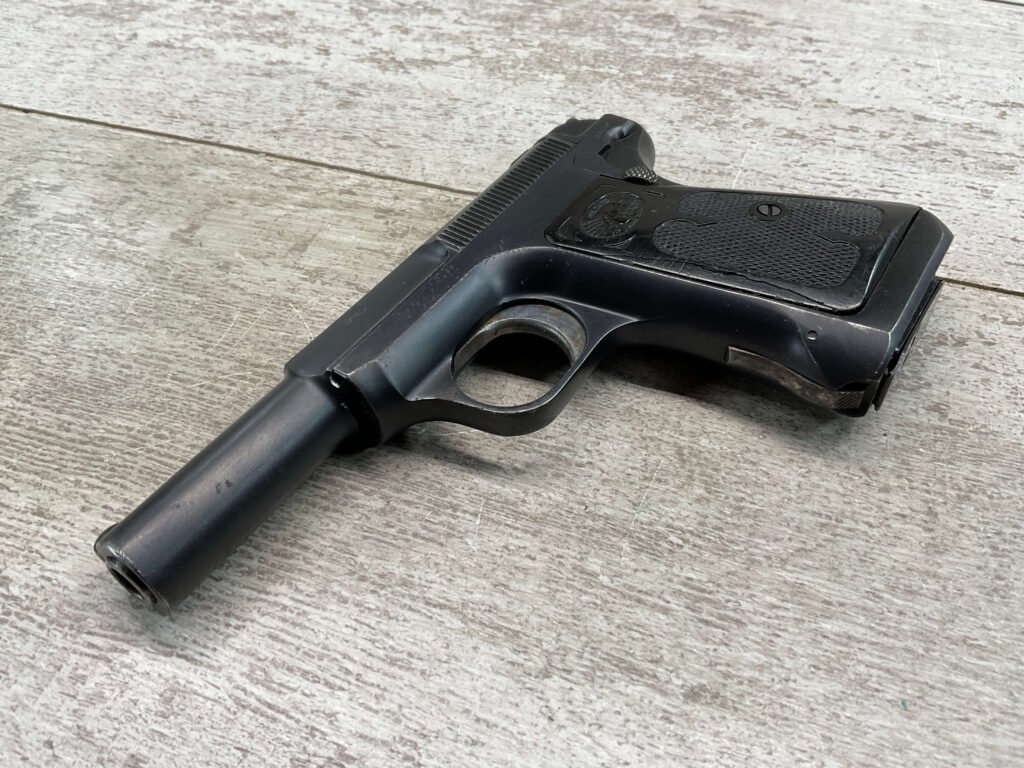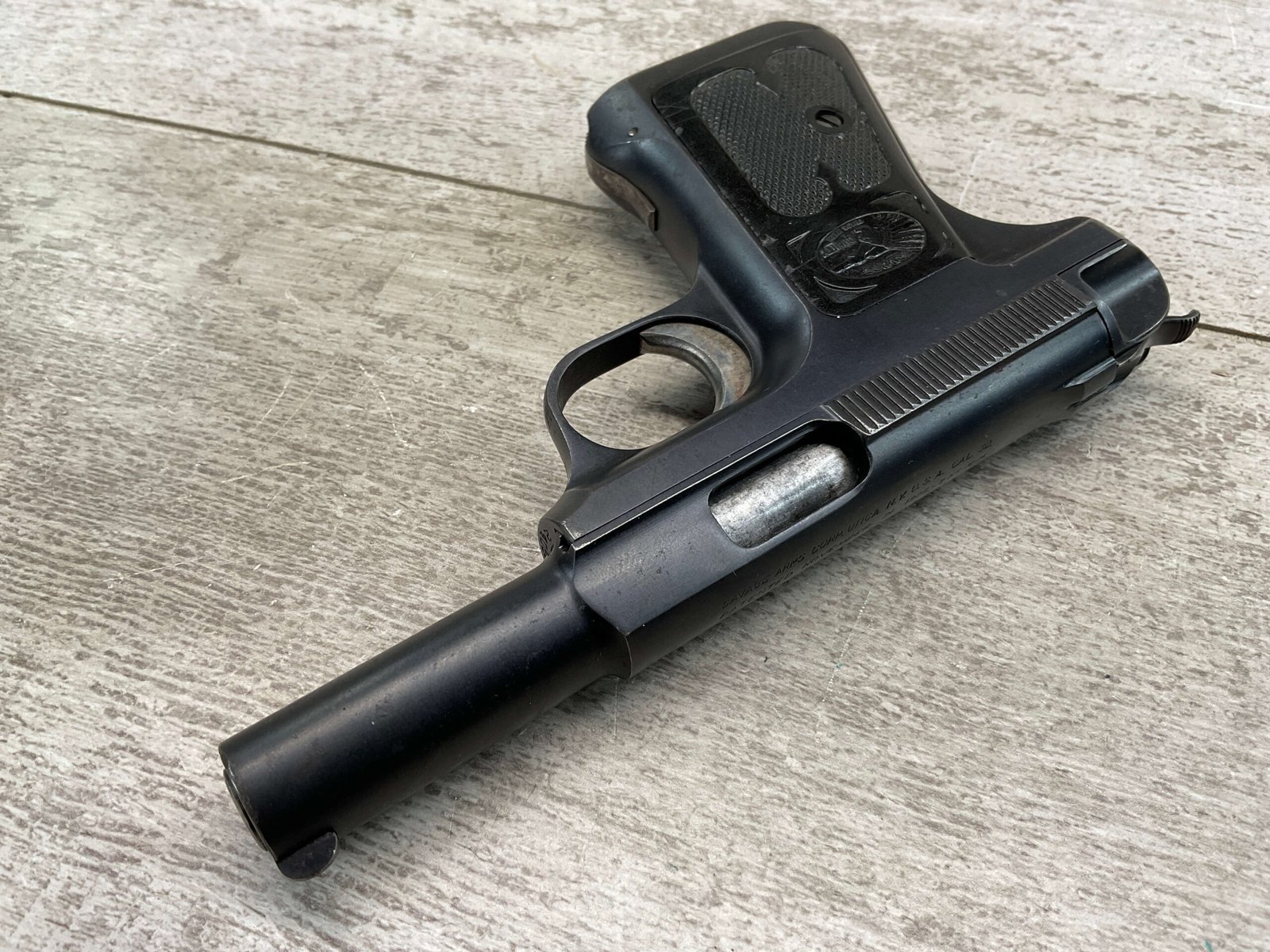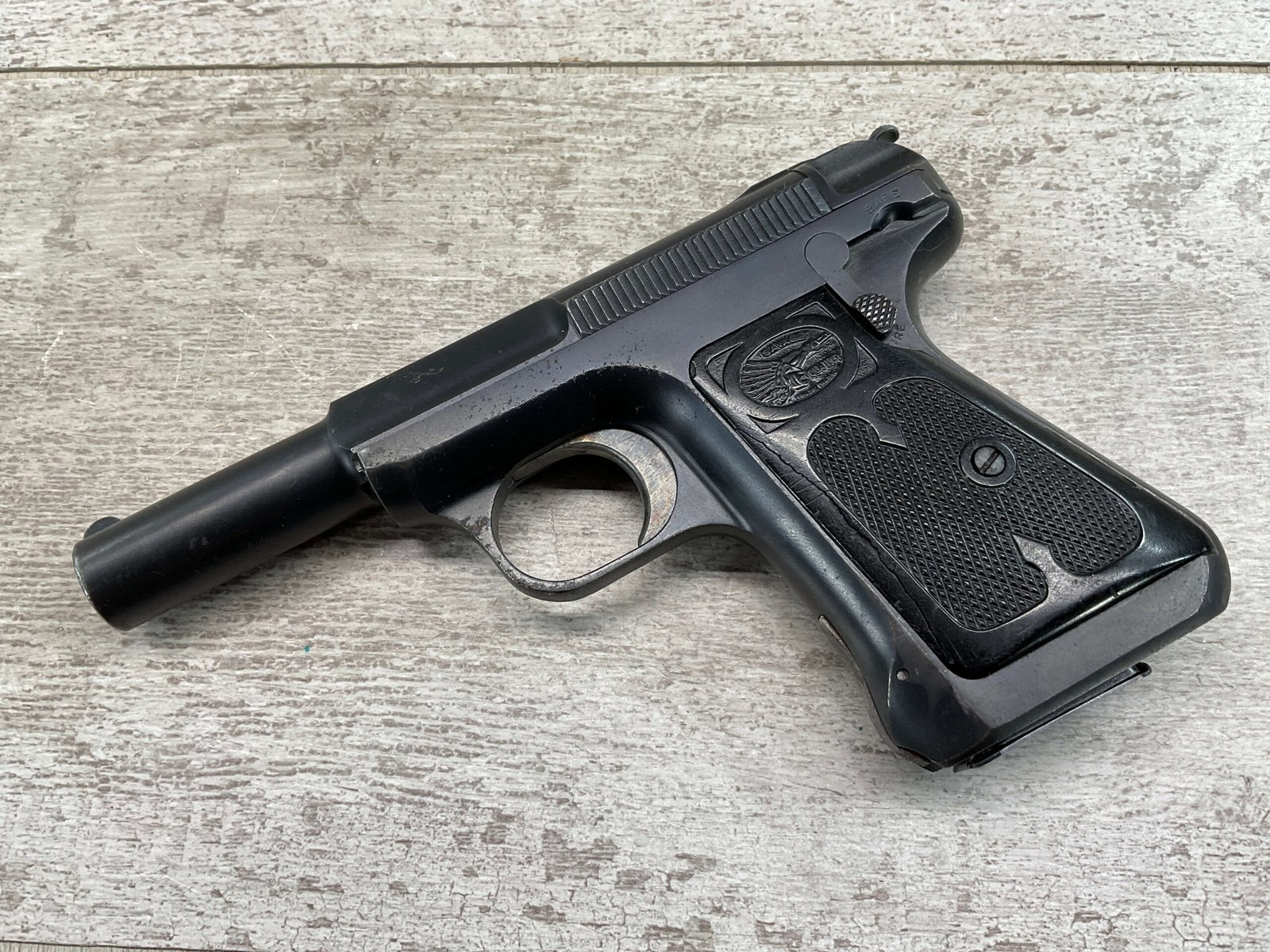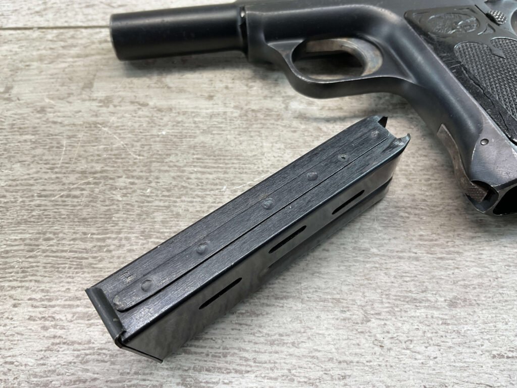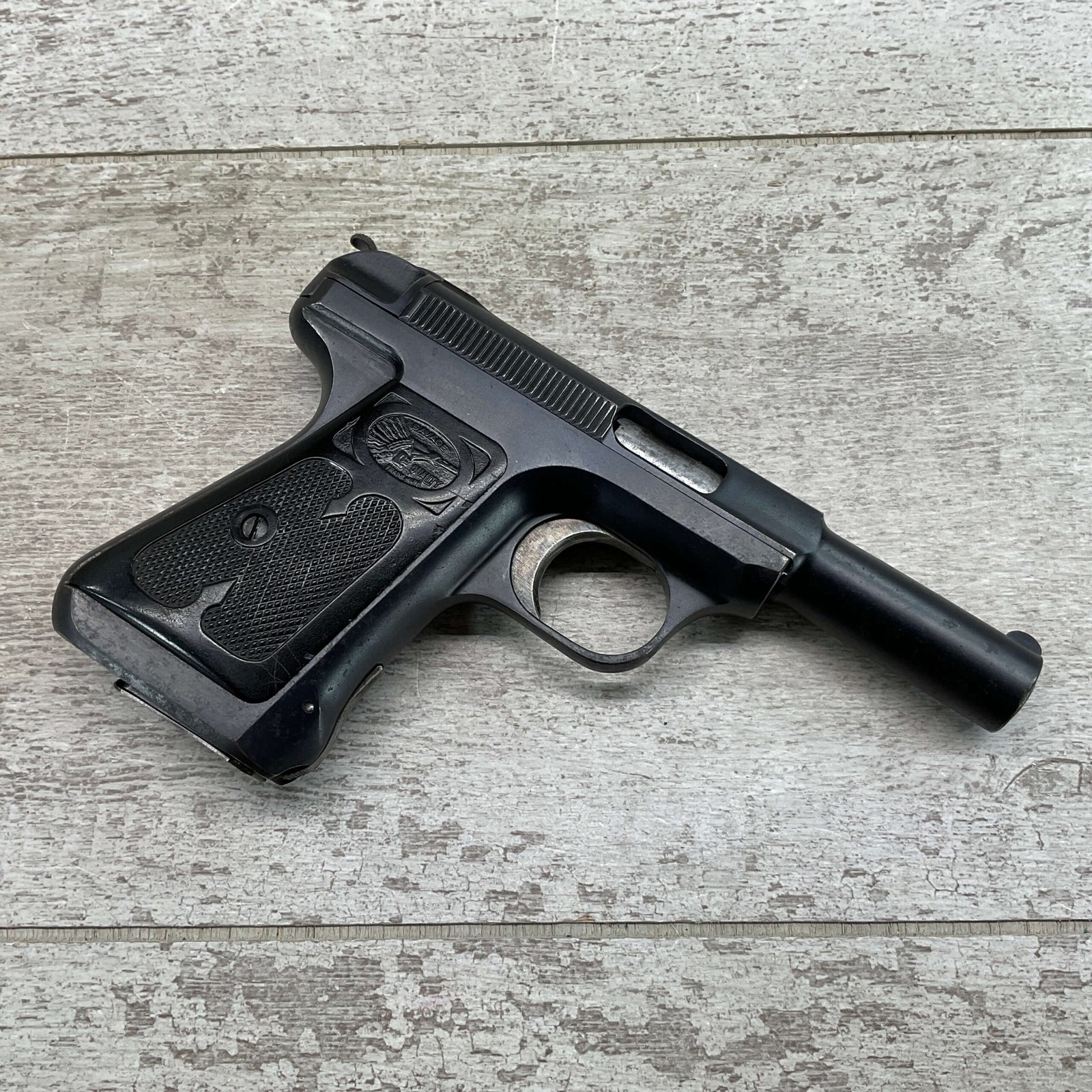 SAVAGE 1917 .32 AUTO SEMI AUTO PISTOL #240523, SPUR COCKING HAMMER, TOP OF SLIDE MARKED “SAVAGE ARMS CORP. UTICA. N.Y. U.S.A. CAL. 32./PATENTED NOVEMBER 21. 1905 -7.65 M-M”, VG TRAPEZOIDAL GRIPS W/SAVAGE QUALITY INDIAN IN OVAL ON TOP LEFT GRIP HAD BEEN REPAIRED (SEE PHOTOS), 3.75″ BARREL, GOOD BORE W/LIGHT FROSTING THROUGHOUT, SOME LIGHT FRECKLING ON BARREL AND RECEIVER, VERY LIGHT SCRATCHES, 10 ROUND MAGAZINE, 95% MATTE BLUE REMAINING, 95+% OVERALL