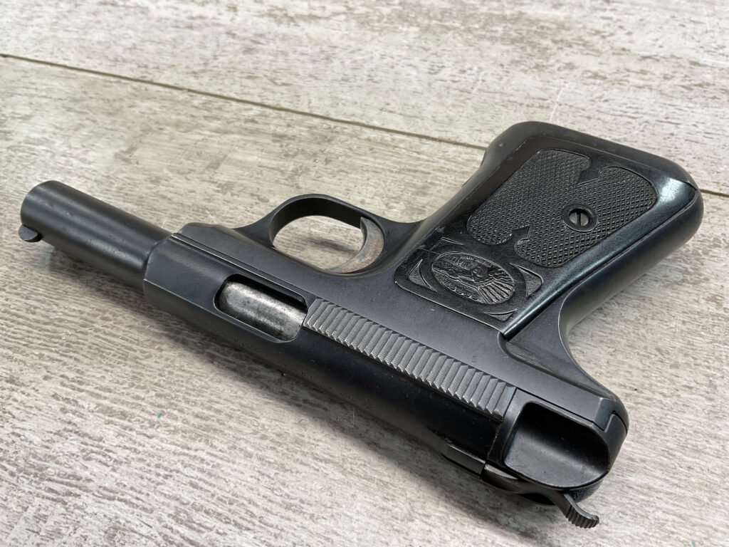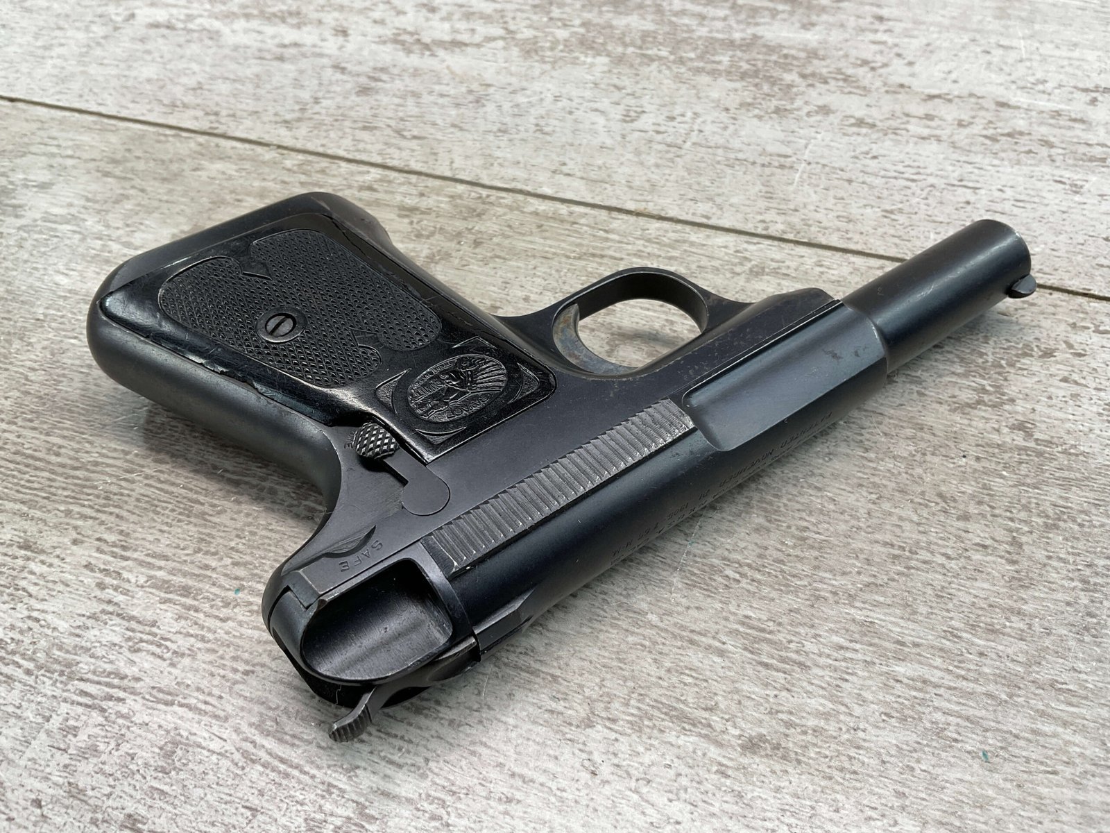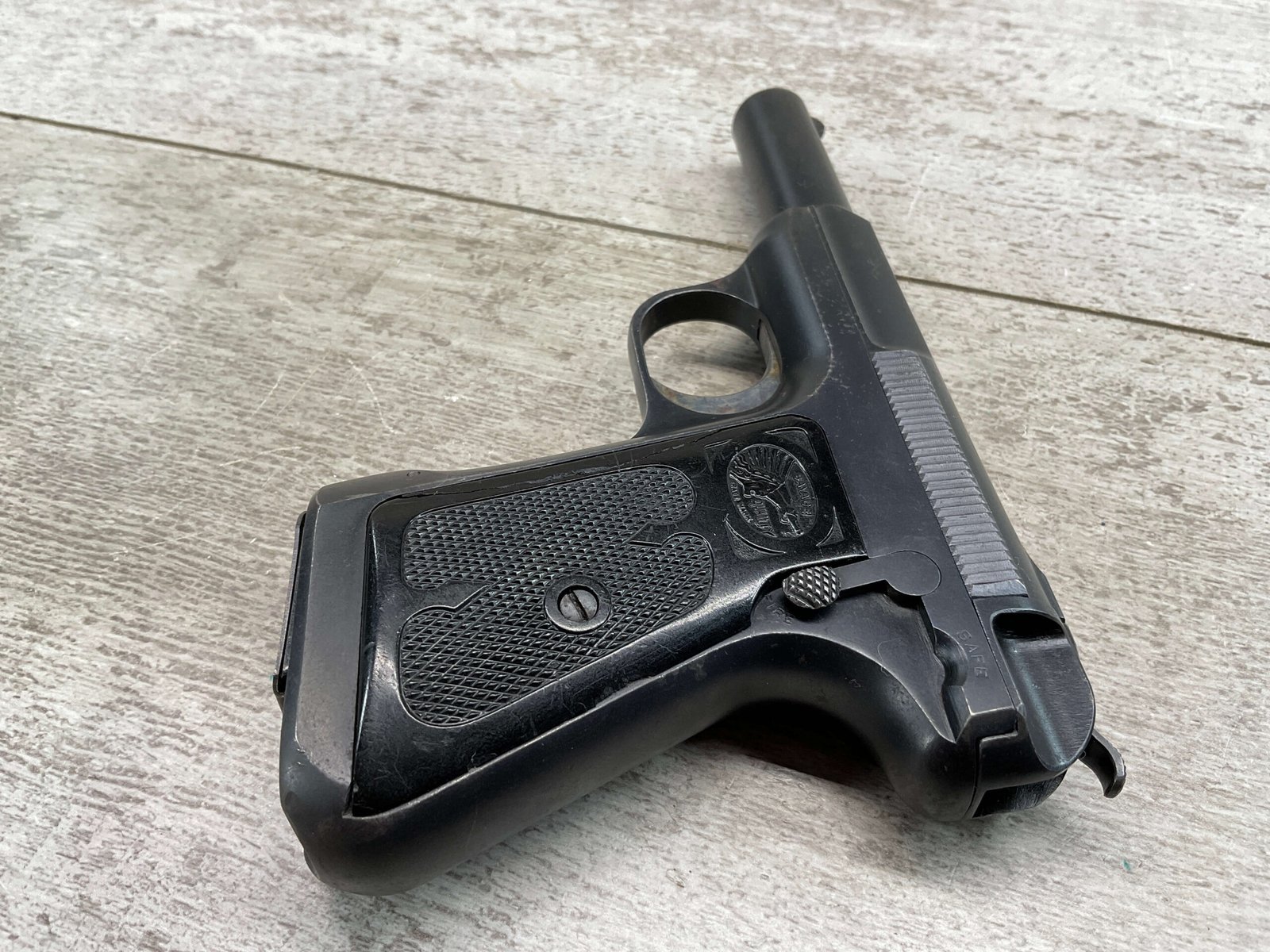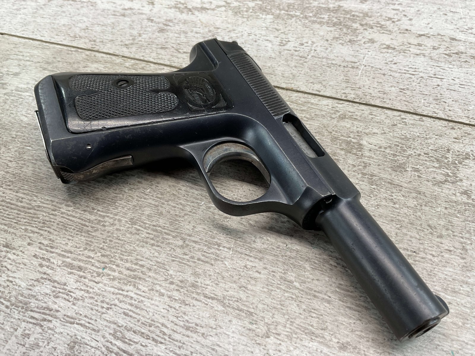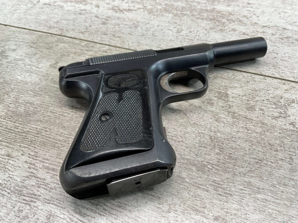 SAVAGE 1917 .32 AUTO SEMI AUTO PISTOL #240523, SPUR COCKING HAMMER, TOP OF SLIDE MARKED “SAVAGE ARMS CORP. UTICA. N.Y. U.S.A. CAL. 32./PATENTED NOVEMBER 21. 1905 -7.65 M-M”, VG TRAPEZOIDAL GRIPS W/SAVAGE QUALITY INDIAN IN OVAL ON TOP LEFT GRIP HAD BEEN REPAIRED (SEE PHOTOS), 3.75″ BARREL, GOOD BORE W/LIGHT FROSTING THROUGHOUT, SOME LIGHT FRECKLING ON BARREL AND RECEIVER, VERY LIGHT SCRATCHES, 10 ROUND MAGAZINE, 95% MATTE BLUE REMAINING, 95+% OVERALL
