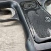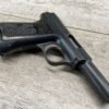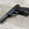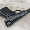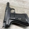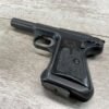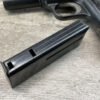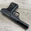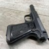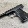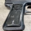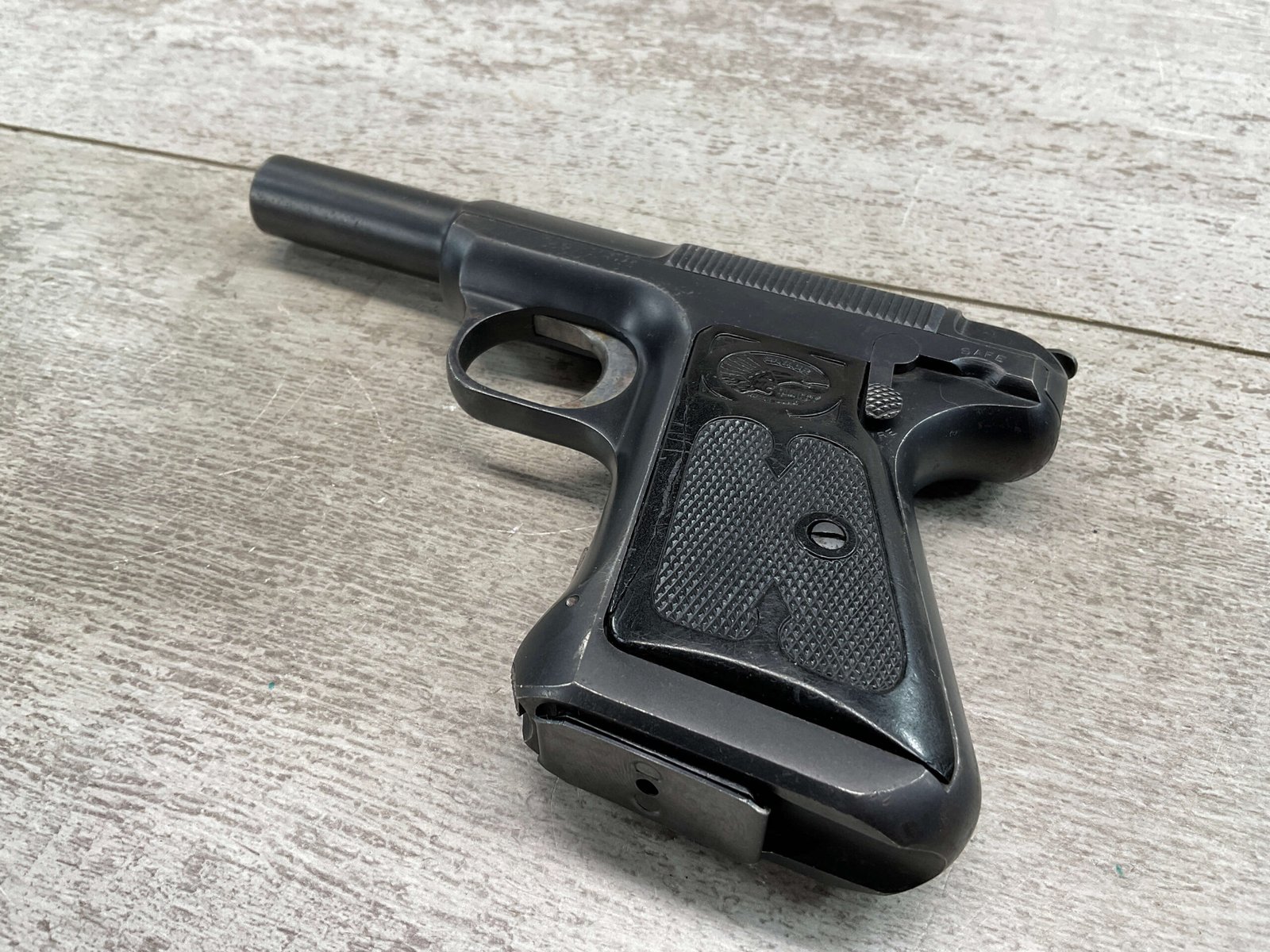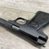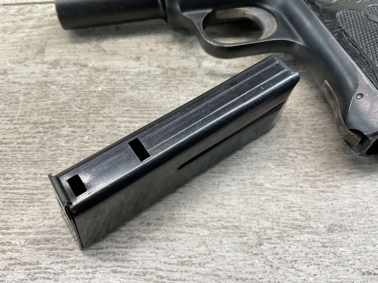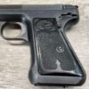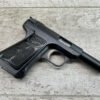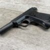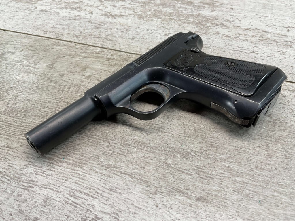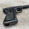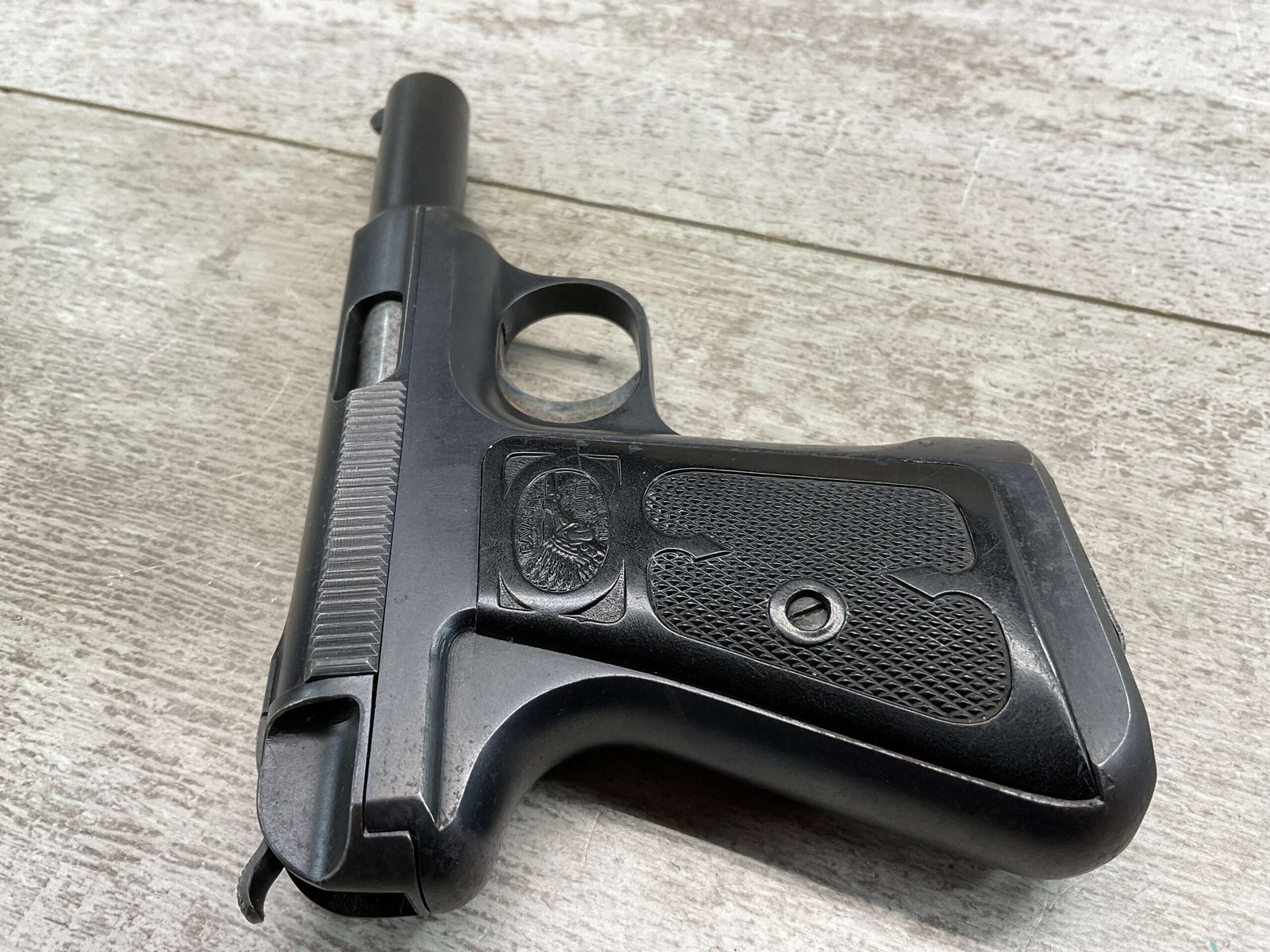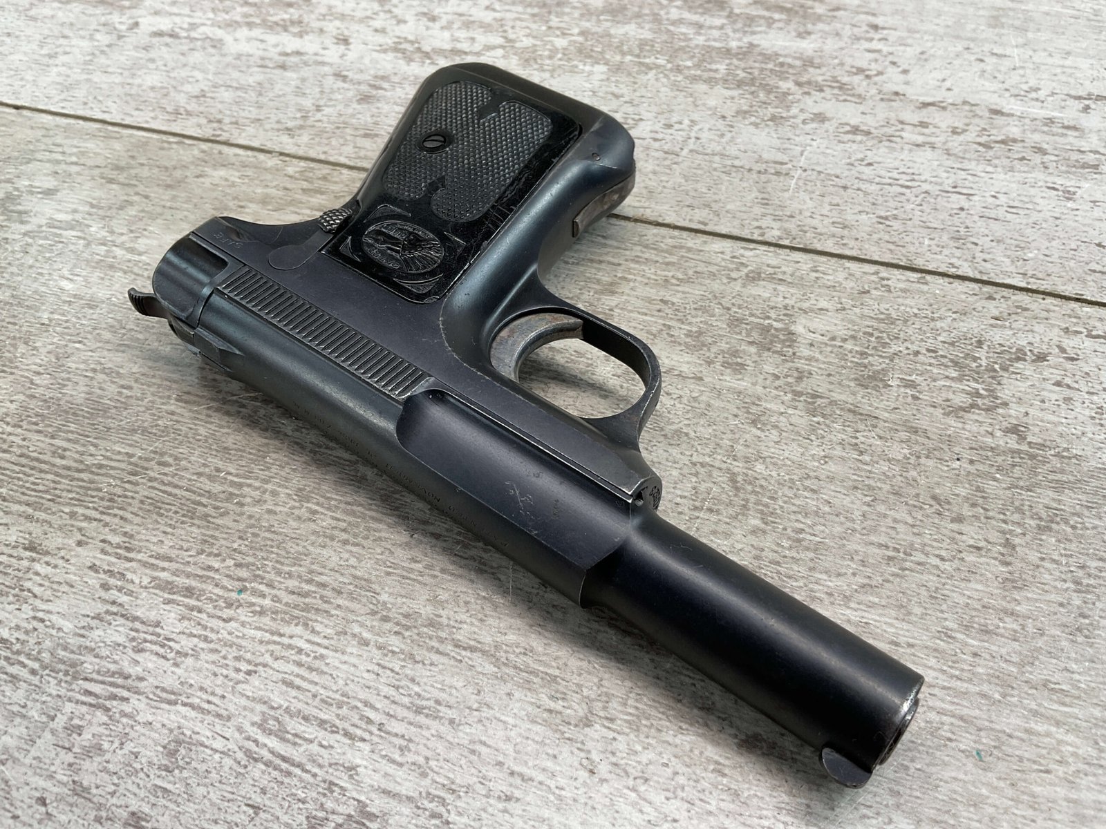 SAVAGE 1917 .32 AUTO SEMI AUTO PISTOL #240523, SPUR COCKING HAMMER, TOP OF SLIDE MARKED “SAVAGE ARMS CORP. UTICA. N.Y. U.S.A. CAL. 32./PATENTED NOVEMBER 21. 1905 -7.65 M-M”, VG TRAPEZOIDAL GRIPS W/SAVAGE QUALITY INDIAN IN OVAL ON TOP LEFT GRIP HAD BEEN REPAIRED (SEE PHOTOS), 3.75″ BARREL, GOOD BORE W/LIGHT FROSTING THROUGHOUT, SOME LIGHT FRECKLING ON BARREL AND RECEIVER, VERY LIGHT SCRATCHES, 10 ROUND MAGAZINE, 95% MATTE BLUE REMAINING, 95+% OVERALL
