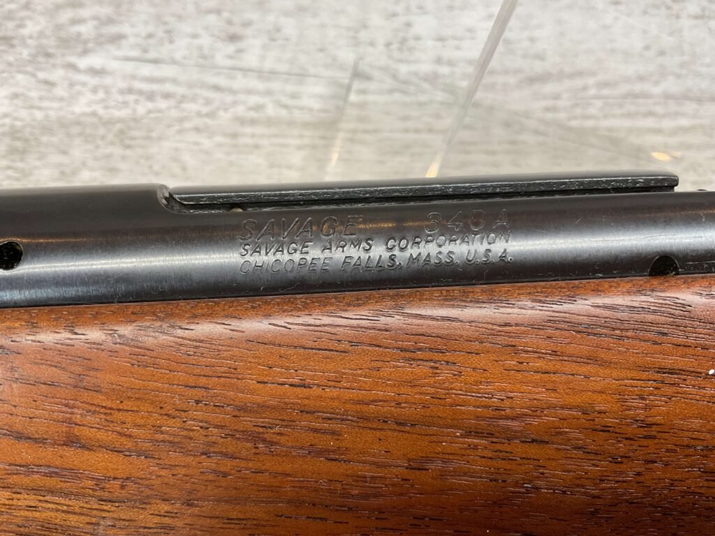 SAVAGE 340A .30-30 BOLT ACTION RIFLE #NSN 22″ BARREL, .30-30 WIN, 4 SHOT MAGAZINE, EXC PLAIN PISTOL GRIP STOCK, 14 1/8″ LOP, PACHMAYR BUTT PAD, ALLEN SLING SWIVELS & LEATHER SLING, EXC BLUE 98%+, EXC BRIGHT BORE & RIFLING, ADJ REAR SIGHT W/HOODED FRONT SIGHT, GREAT SHOOTER!