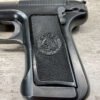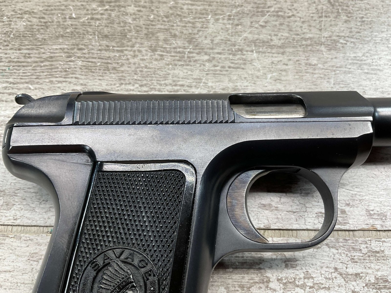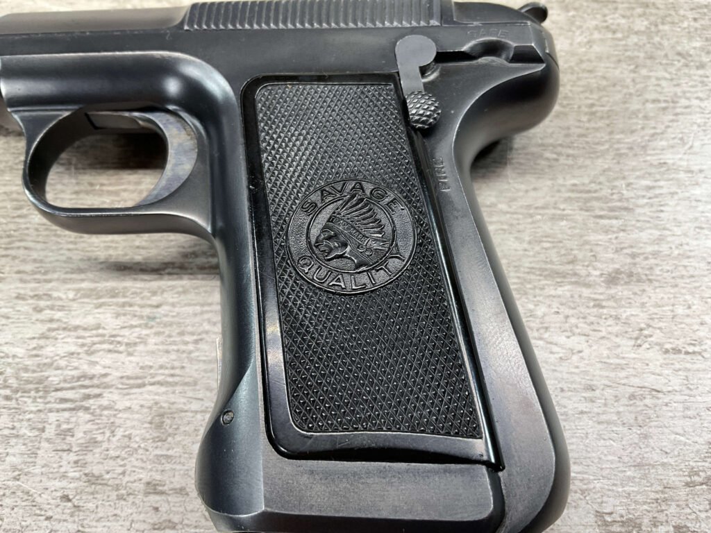 SAVAGE MODEL 1907 .32ACP PISTOL IN ORIGINAL KRAFT BOX #213903, 1919 MFR, BOX MARKED “SAVAGE PISTOL” / “.32 CAL” / AUTOMATIC SMOKELESS RIMLESS”, 10 SHOT MAG, 3 13/16″ BBL, MINTY ORIGINAL BLUE, EXC BRIGHT BORE & RIFLING, EXC BLACK HARD GRIPS, CASE COLOR HARDENED TRIGGER, 98+% OVERALL, RARE IN THIS ORIGINAL MINTY CONDITION!!
