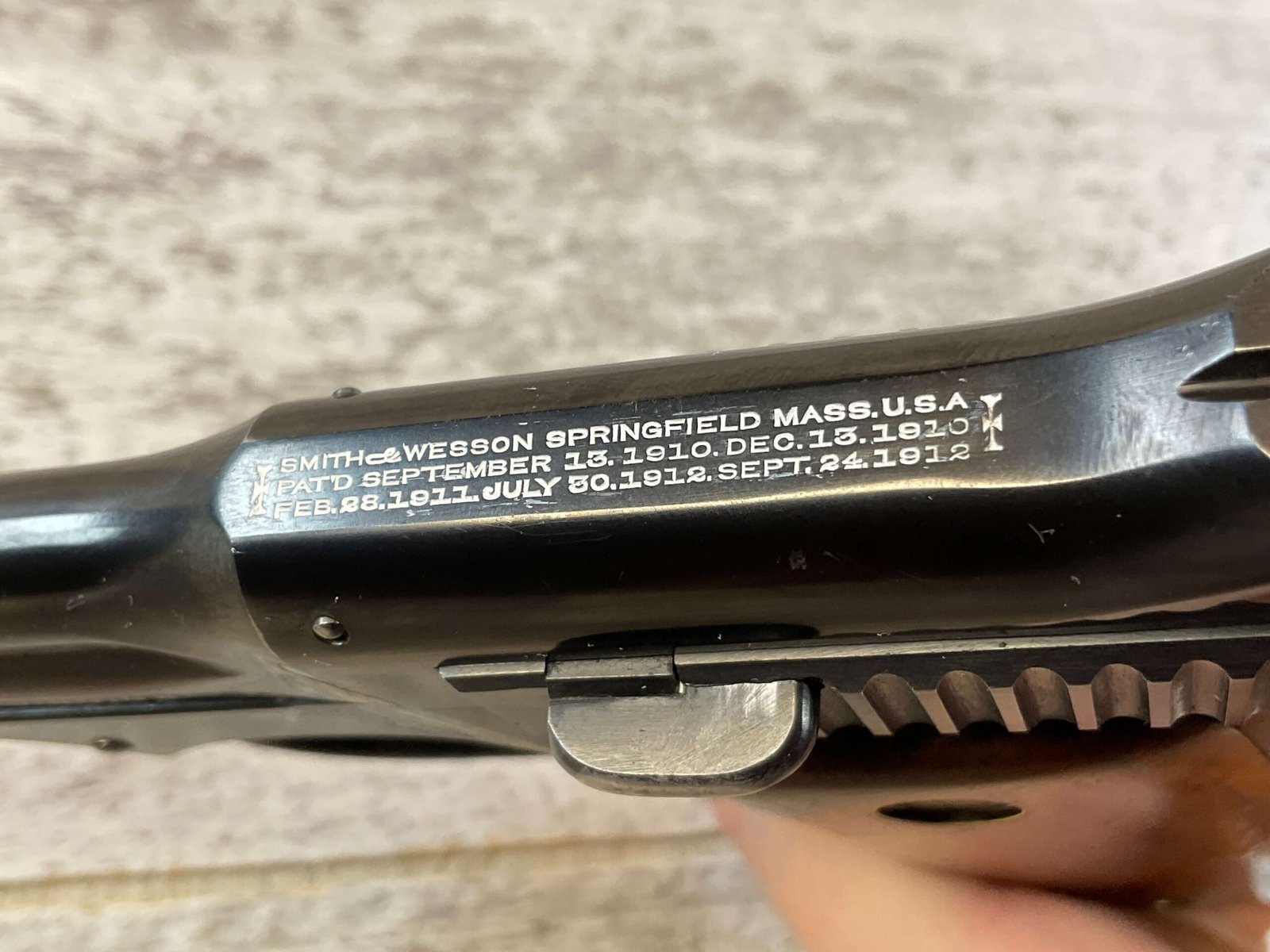 SCARCE SMITH & WESSON S&W M35 / MODEL 1913 35 S&W CAL SEMI AUTO PISTOL #6518, EXC ORIGINAL BLUE, EXC SMOOTH WALNUT GRIPS, EXC BORE & RIFLING, 1 7 SHOT MAGAZINE, CROSS BOLT RELEASE, “FINGER GRIP SAFETY”, 1913-1921 PRODUCTION, RARE MINTY CONDITION, CONDITION AS SHOWN IN PICTURES