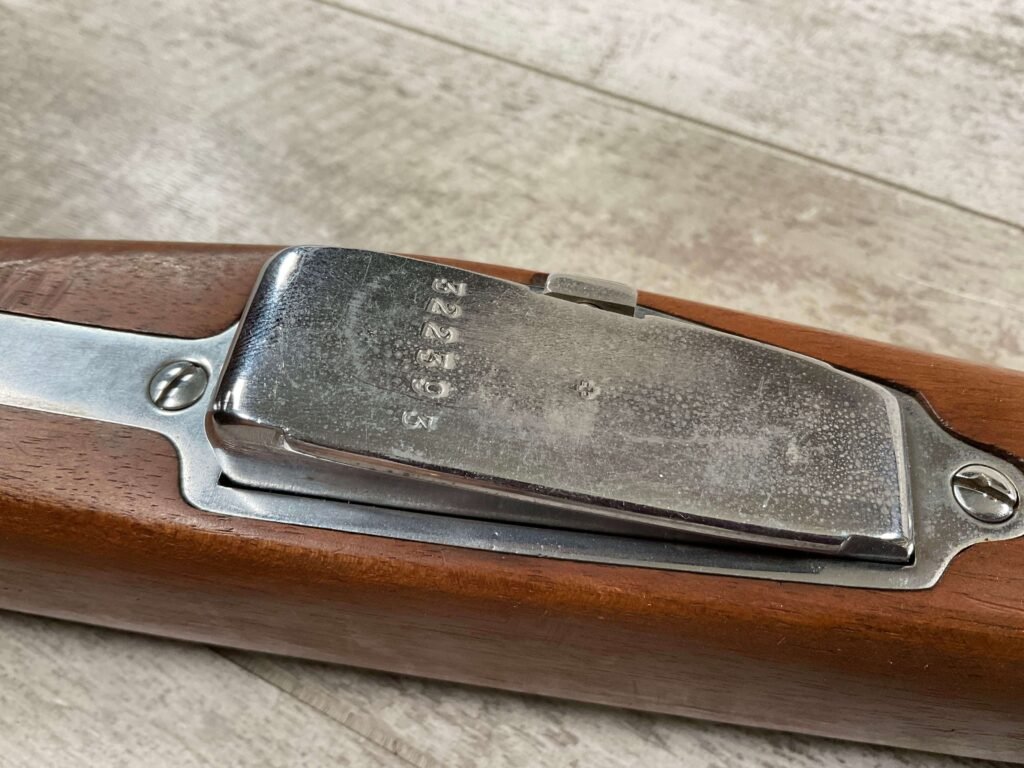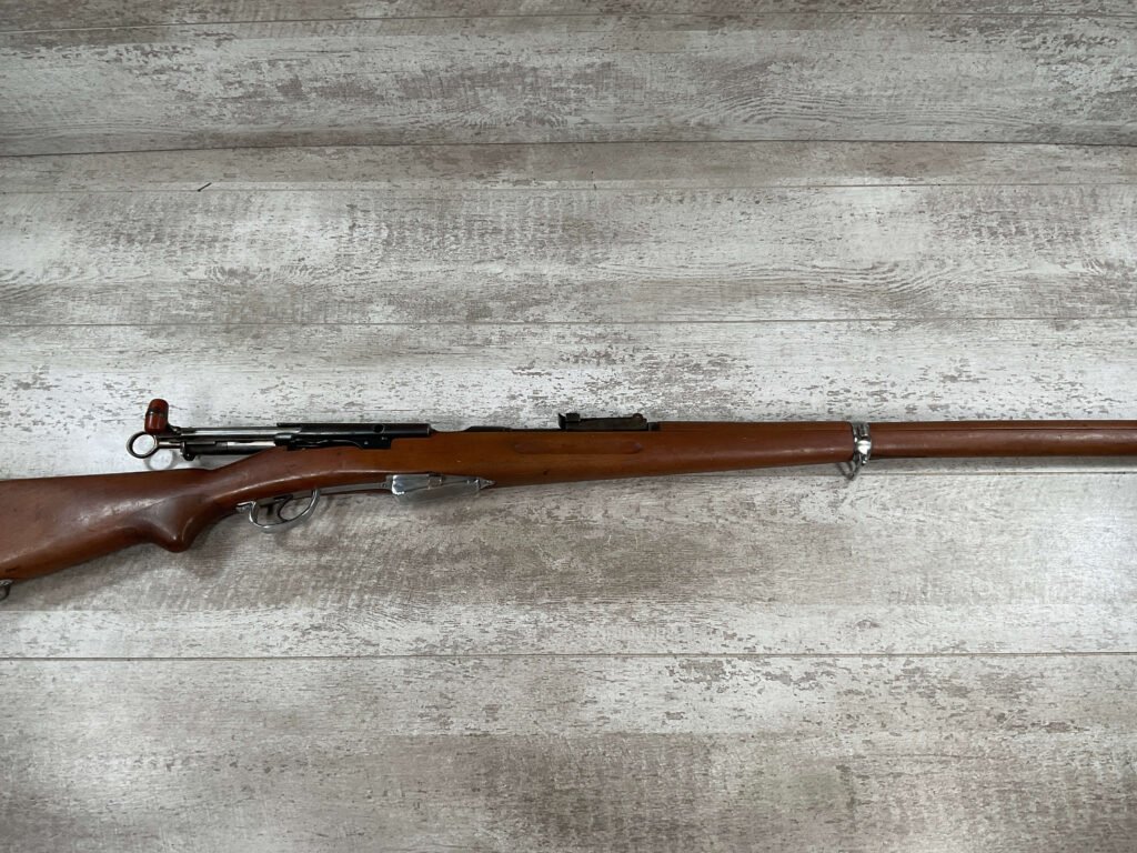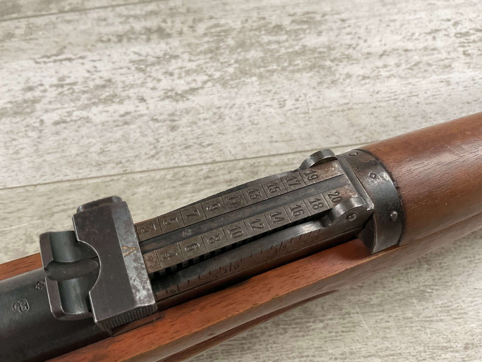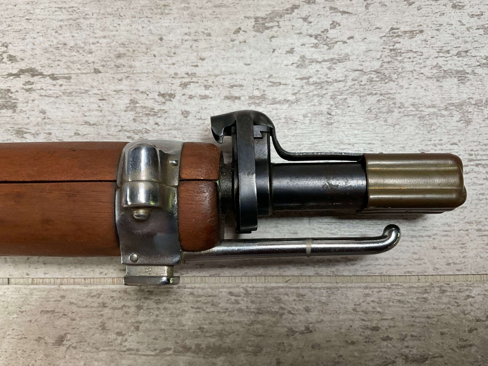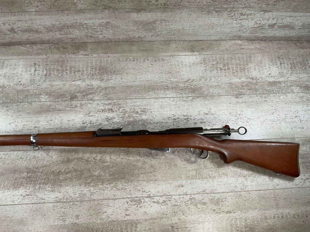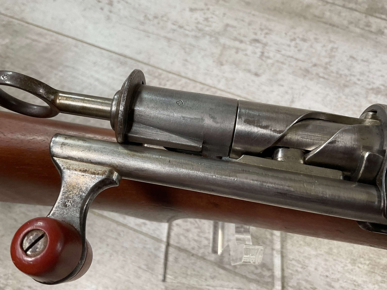 SCHMIDT-RUBIN STRAIGHT PULL 7.5×55 1896/11 LONG RIFLE, 1907 MFR #322393, 30.7″ BARREL, REAR TANGENT LEAF SIGHT TO 2000M, 6 ROUND DETACHABLE MAG, RECEIVER IS TURNING BROWN PATINA W/SCATTERED FRECKLING, BOLT KNOBS ARE NOT CRACKED & IN EXC CONDITION, EXC MIRROR BORE & RIFLING (10/10), BBL BANDS/TRIGGER GUARD/MAGAZINE & BUTT PLATE ARE NICKEL PLATED, PISTOL GRIP HAS BEEN INLETTED INTO THE ORIGIANL M96 STOCK, EXC STOCK W/LIGHT HANDLING MARKS, MUZZLE CAP, NO IMPORT MARK, 90+% OVERALL