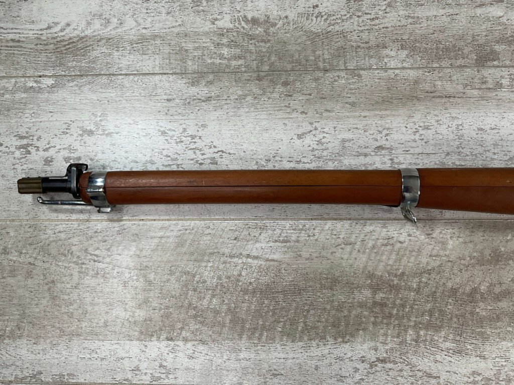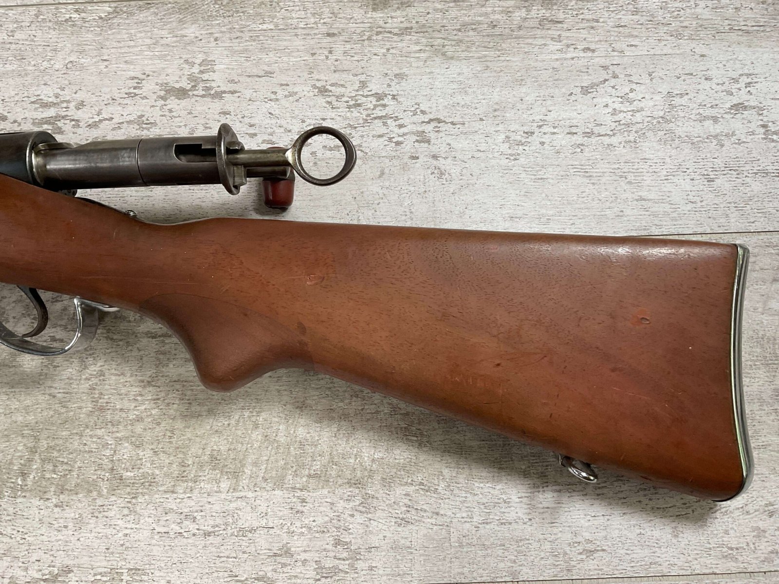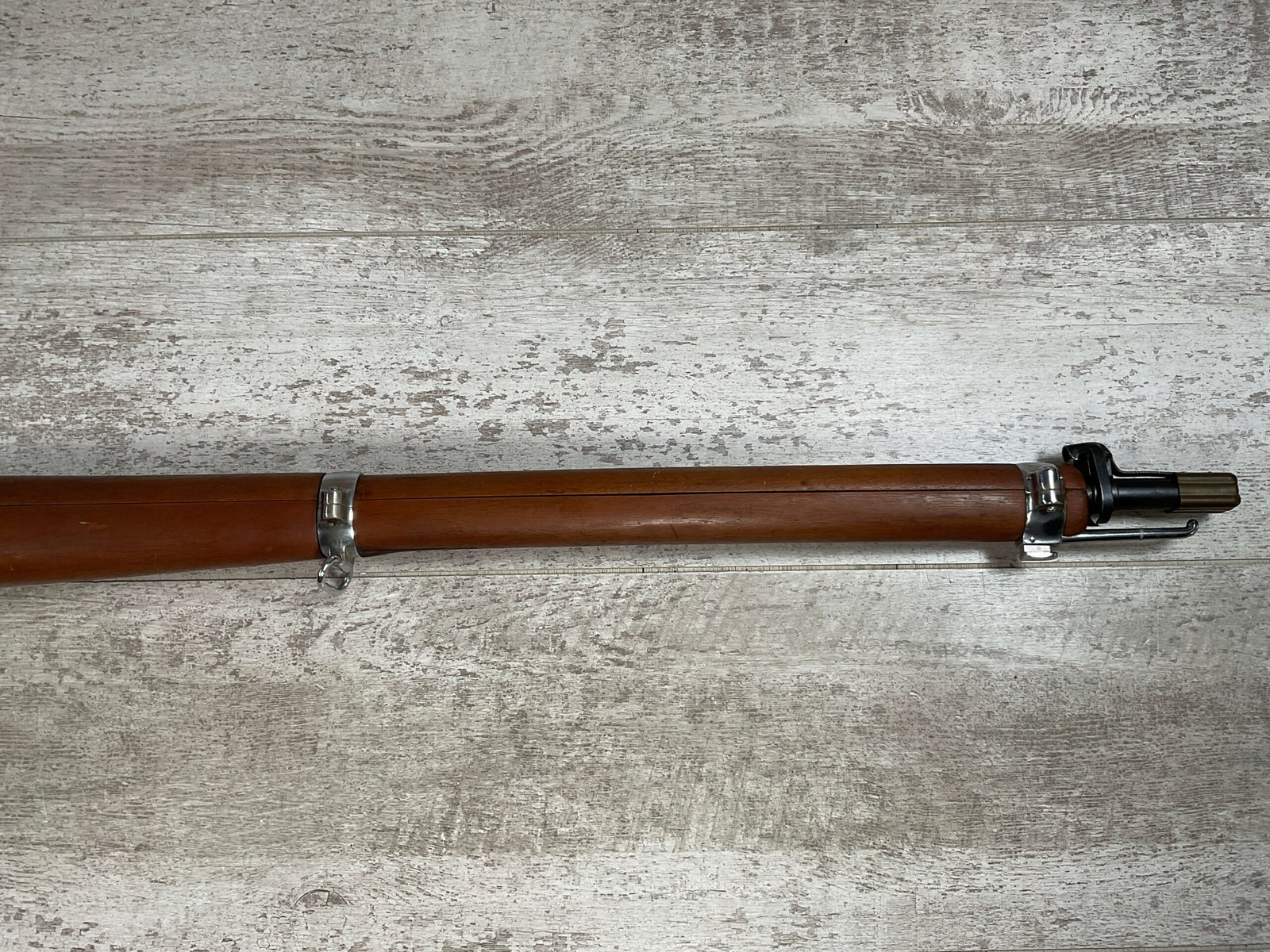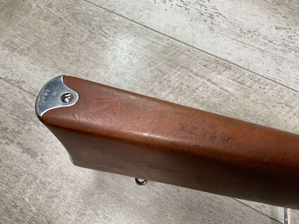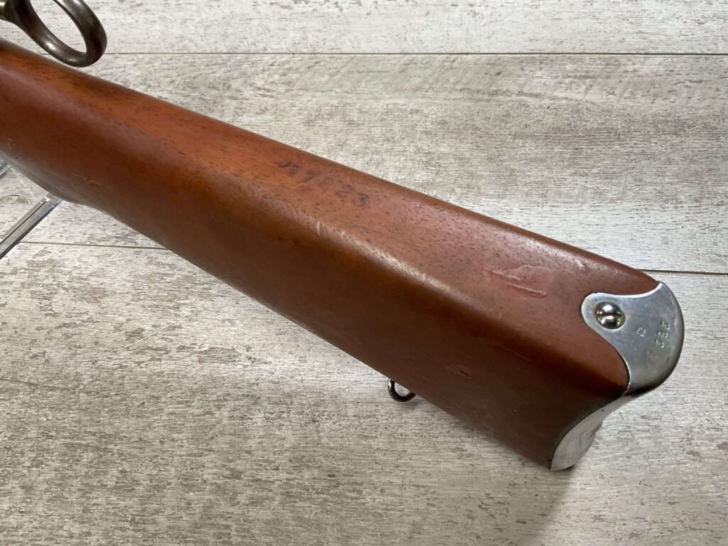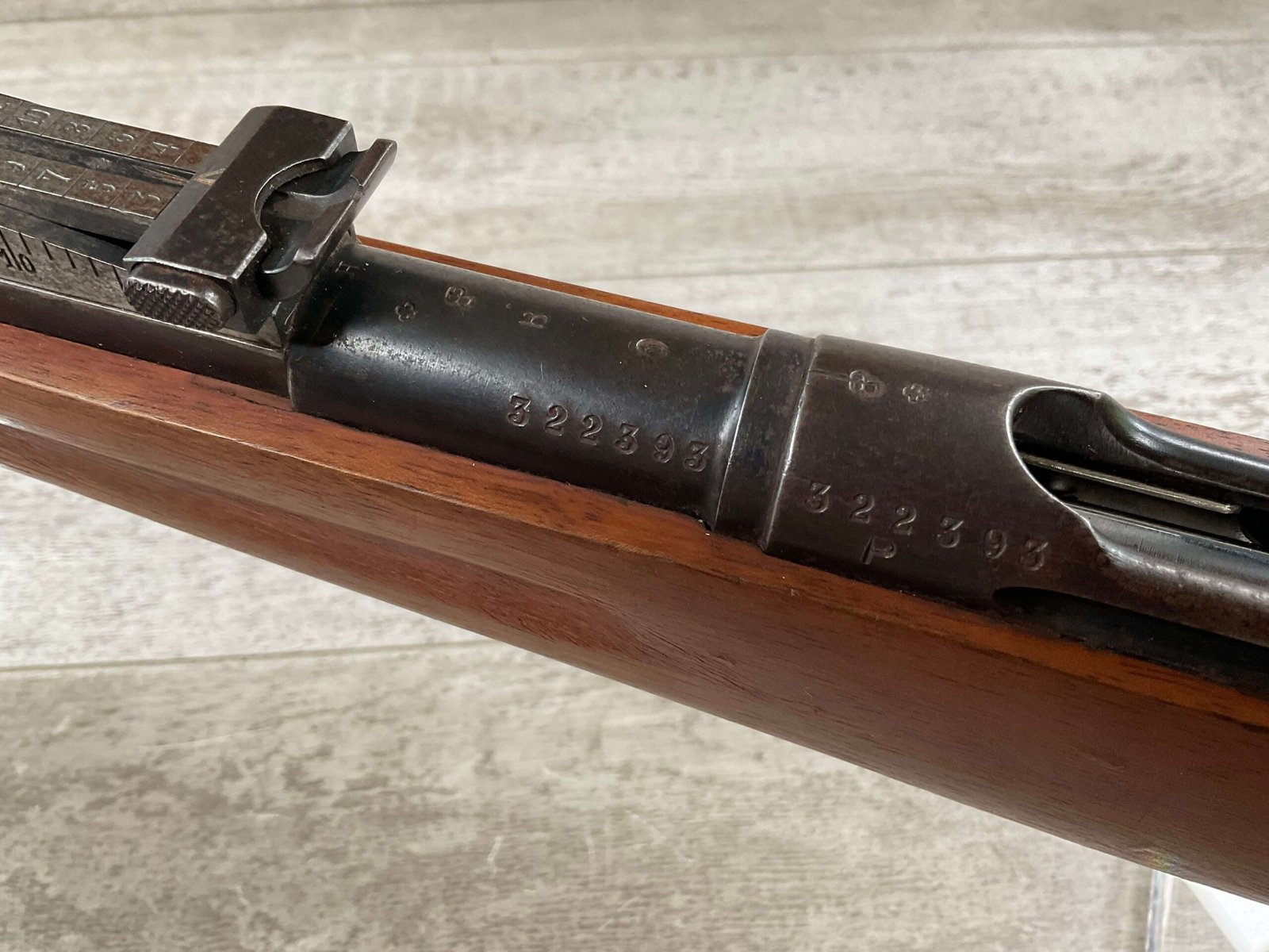 SCHMIDT-RUBIN STRAIGHT PULL 7.5×55 1896/11 LONG RIFLE, 1907 MFR #322393, 30.7″ BARREL, REAR TANGENT LEAF SIGHT TO 2000M, 6 ROUND DETACHABLE MAG, RECEIVER IS TURNING BROWN PATINA W/SCATTERED FRECKLING, BOLT KNOBS ARE NOT CRACKED & IN EXC CONDITION, EXC MIRROR BORE & RIFLING (10/10), BBL BANDS/TRIGGER GUARD/MAGAZINE & BUTT PLATE ARE NICKEL PLATED, PISTOL GRIP HAS BEEN INLETTED INTO THE ORIGIANL M96 STOCK, EXC STOCK W/LIGHT HANDLING MARKS, MUZZLE CAP, NO IMPORT MARK, 90+% OVERALL