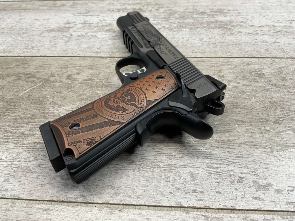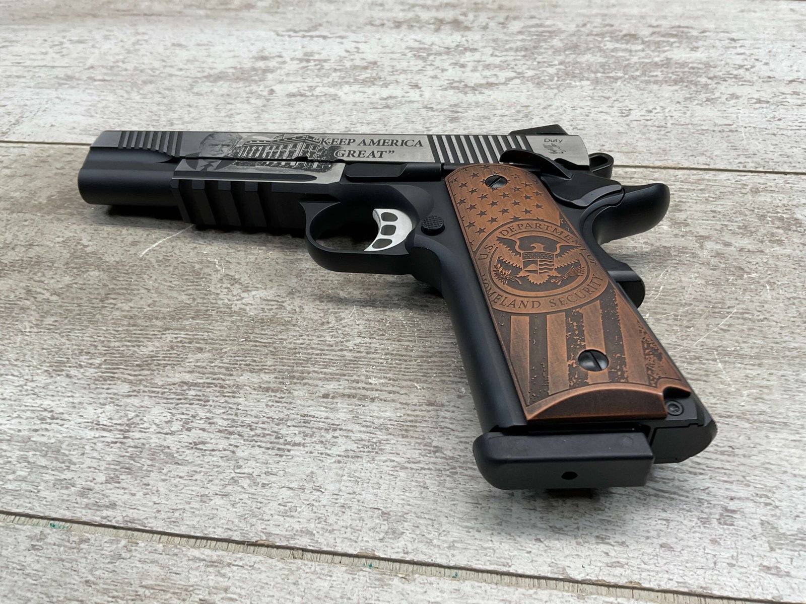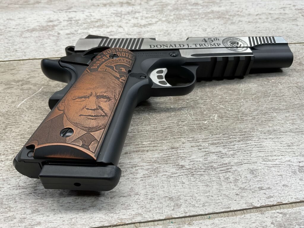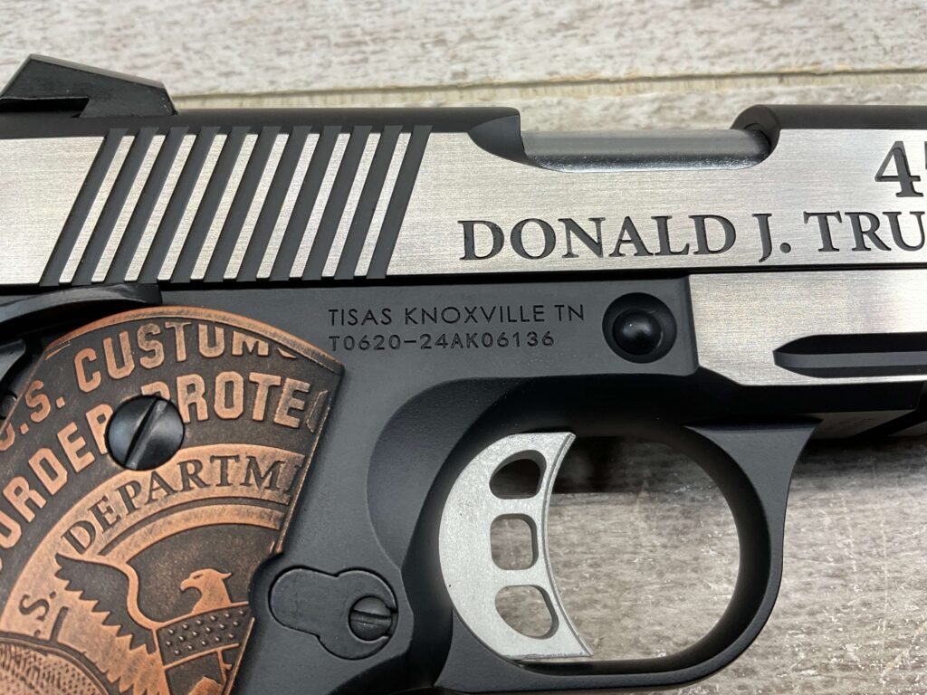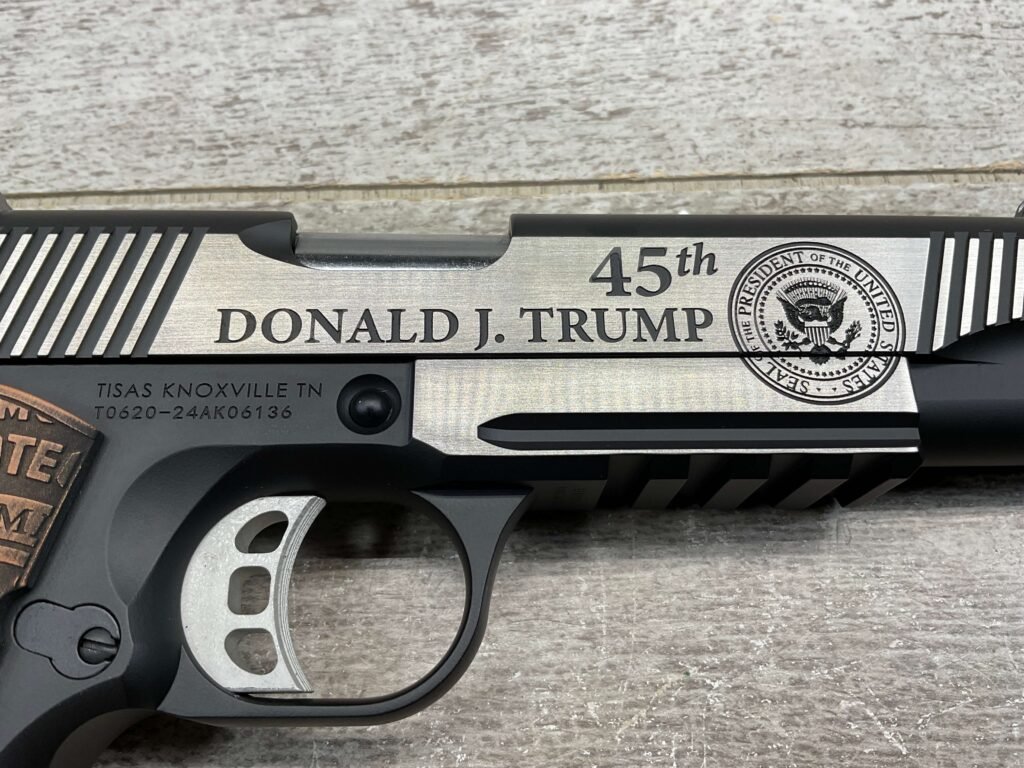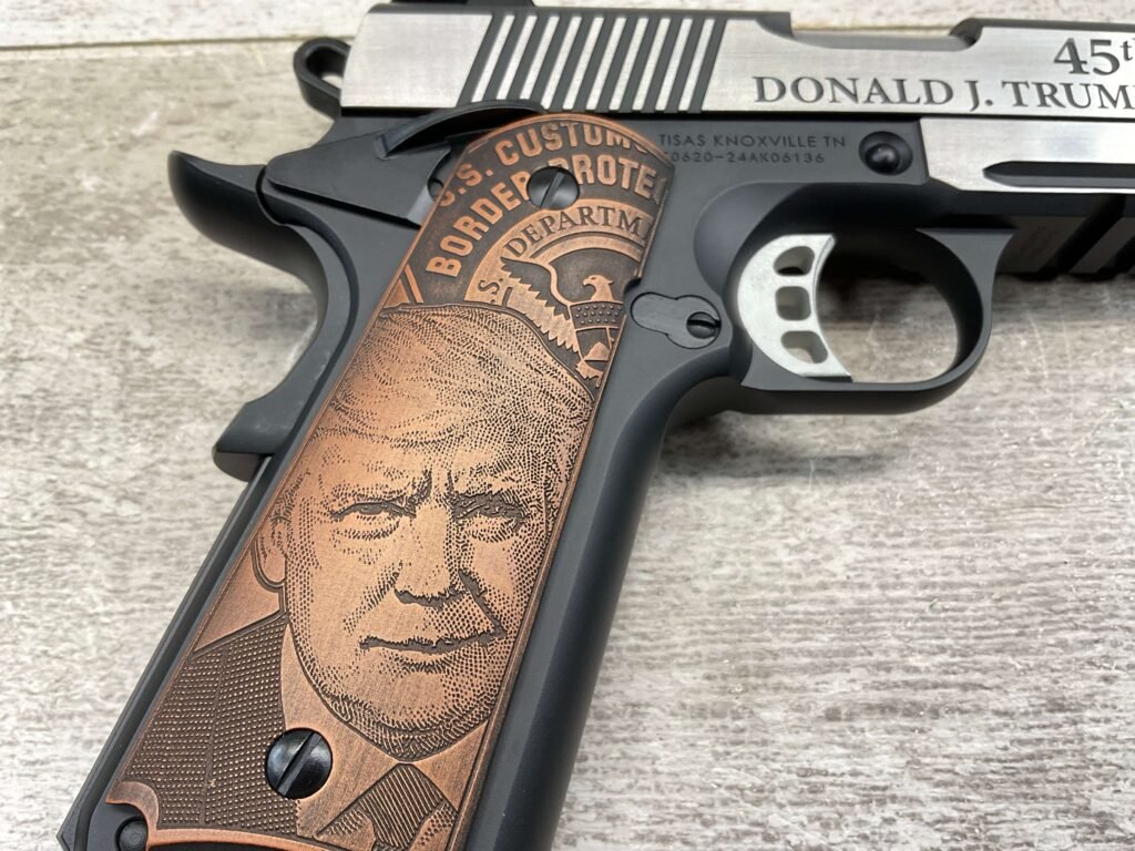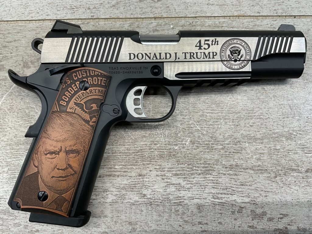 SDS IMPORTS TISAS EXCLUSIVE “TRUMP” 1911 DUTY SS45R HANDGUN, .45 ACP, NEW IN BOX AND INCLUDES 2 MAGS, OWNERS MANUALS, CLEANING BRUSH, AND EXTRA BLACK GRIPS.