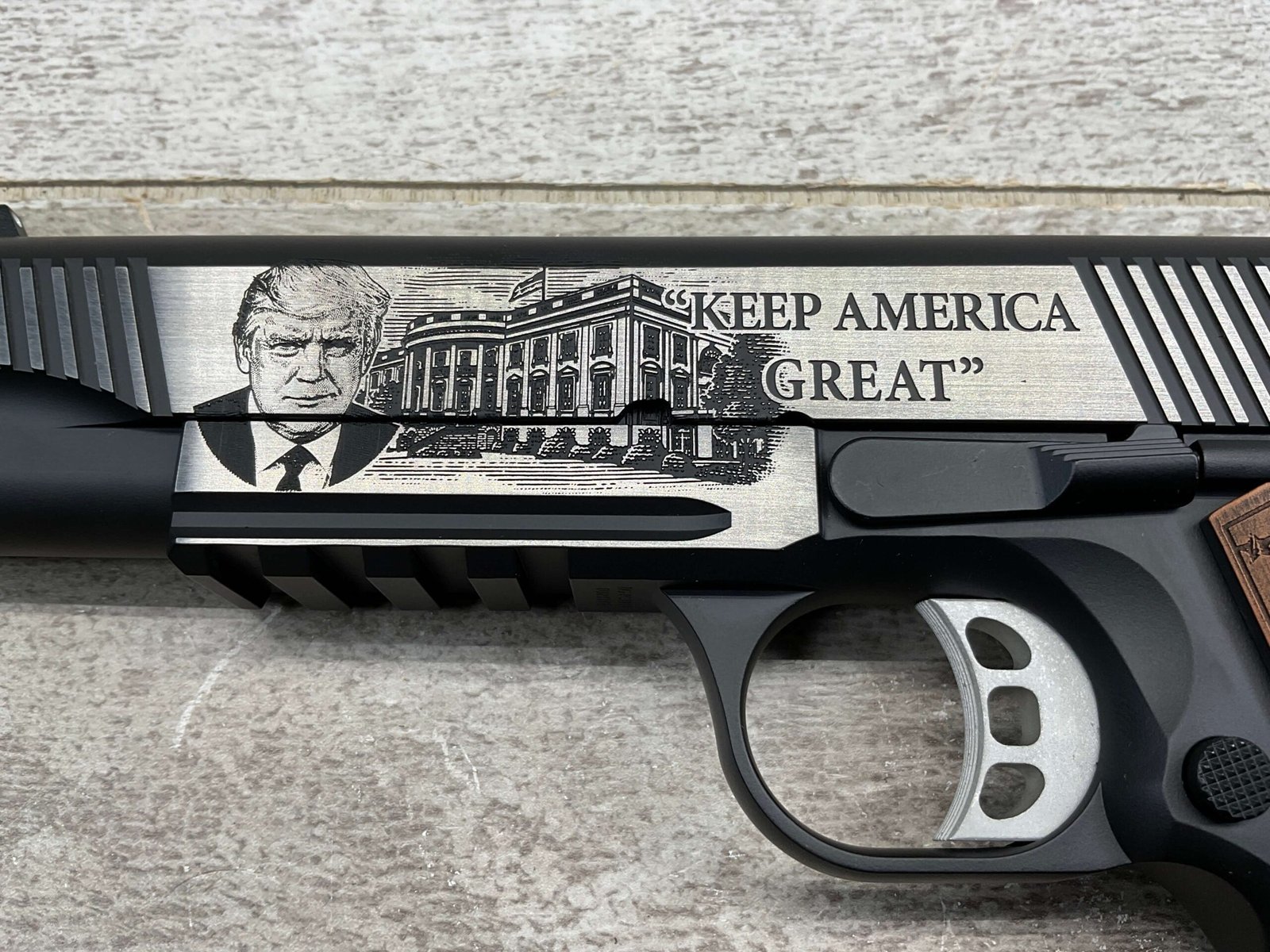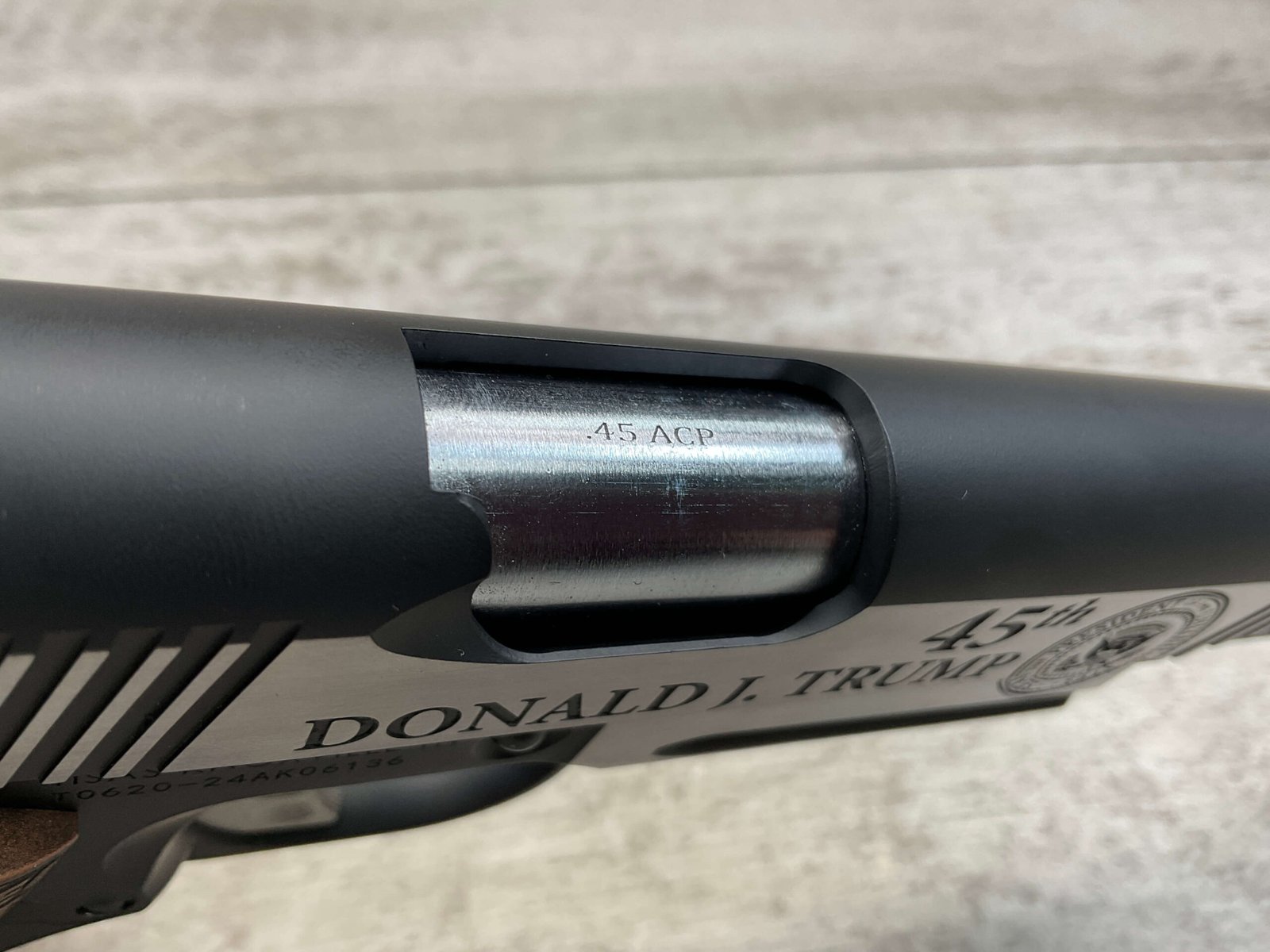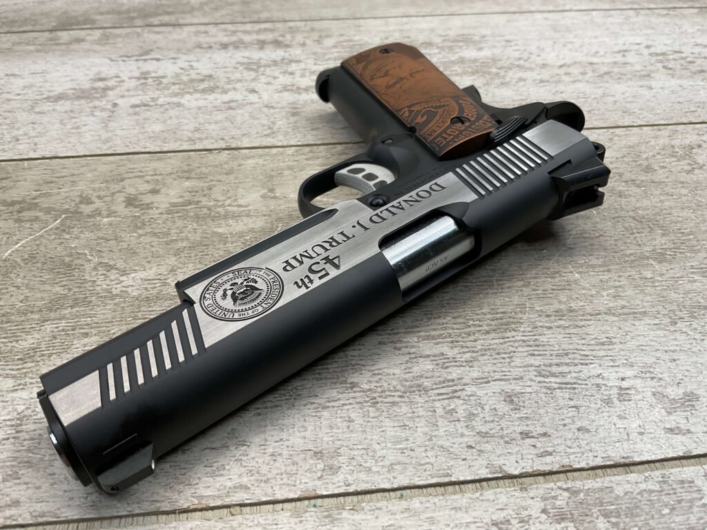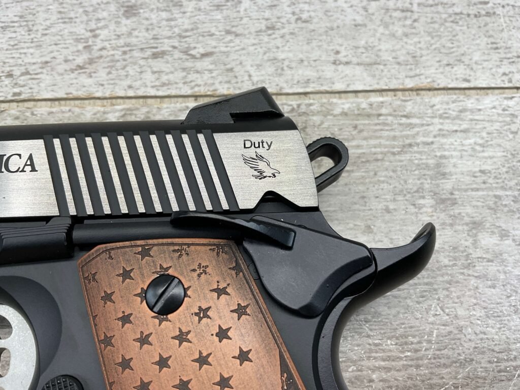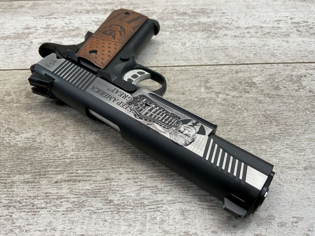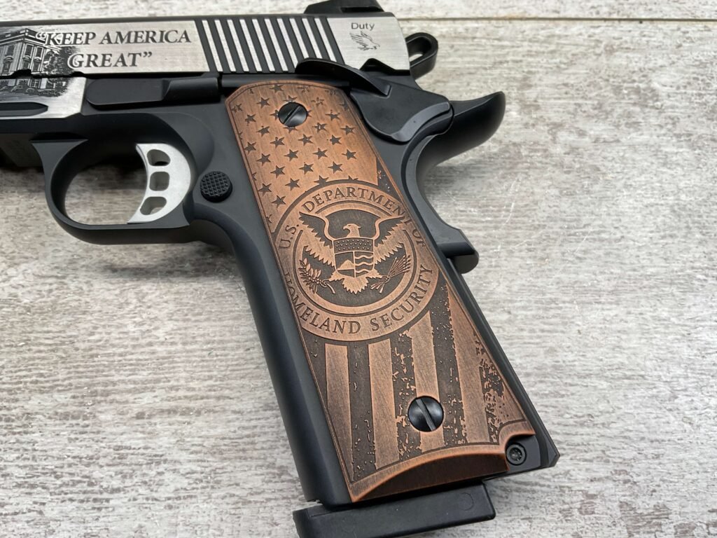 SDS IMPORTS TISAS EXCLUSIVE “TRUMP” 1911 DUTY SS45R HANDGUN, .45 ACP, NEW IN BOX AND INCLUDES 2 MAGS, OWNERS MANUALS, CLEANING BRUSH, AND EXTRA BLACK GRIPS.