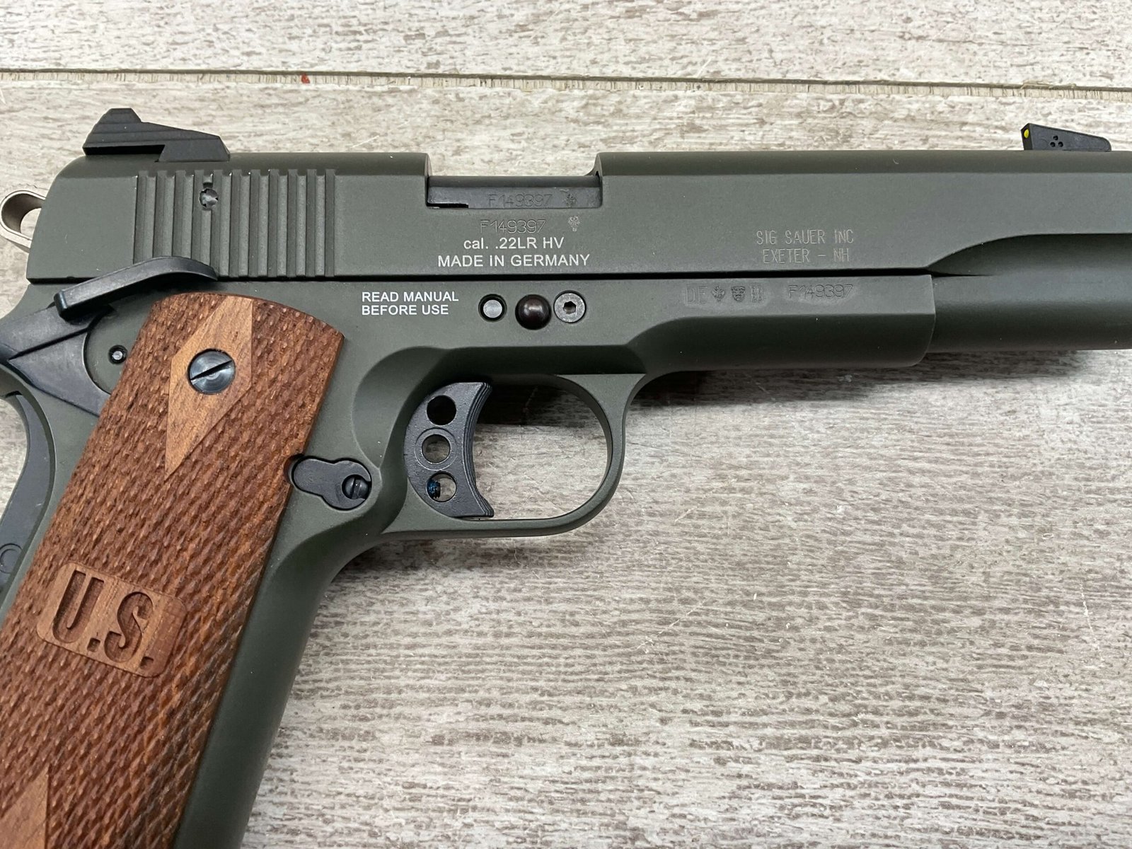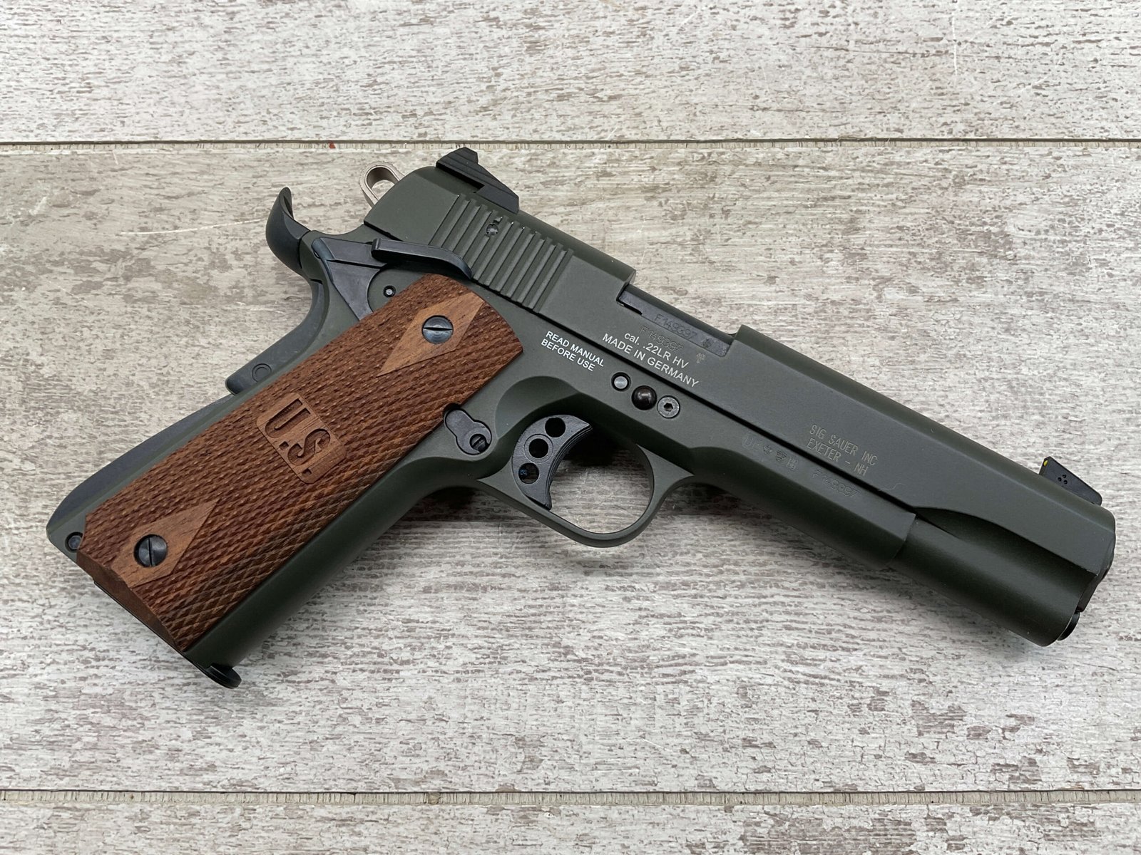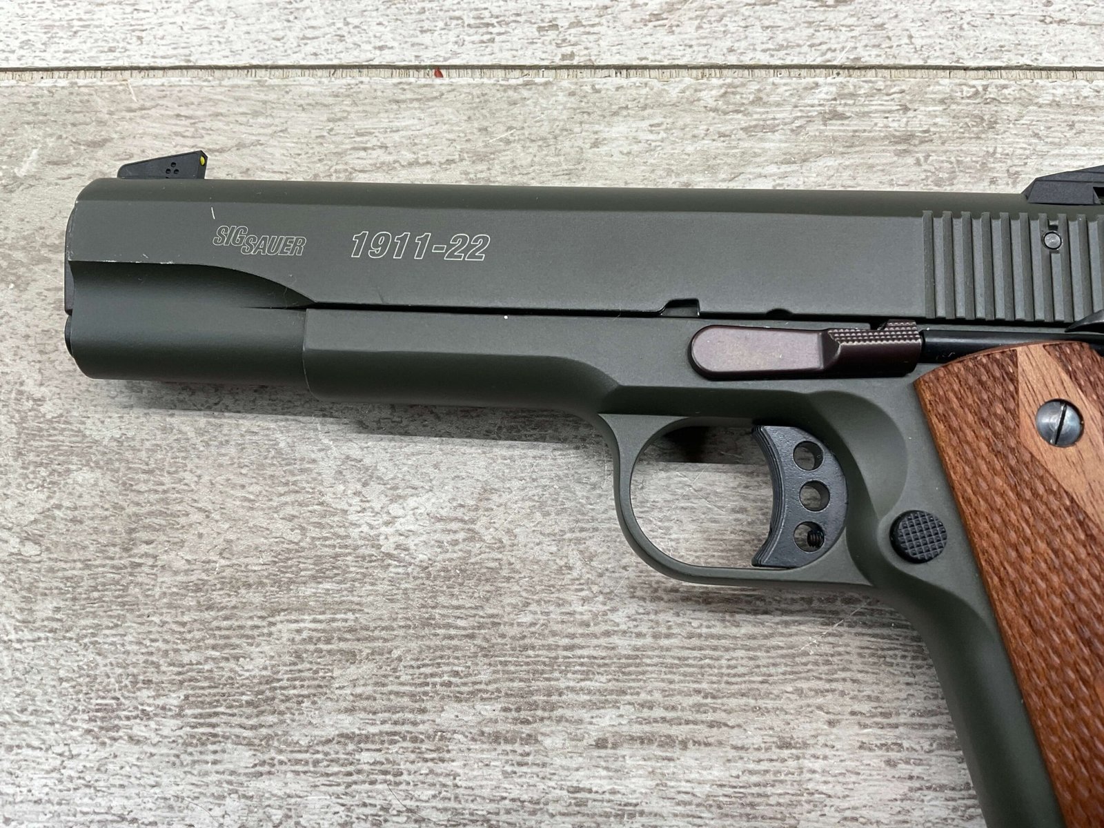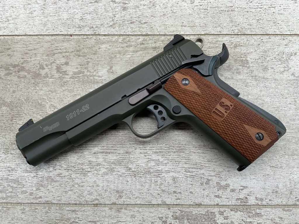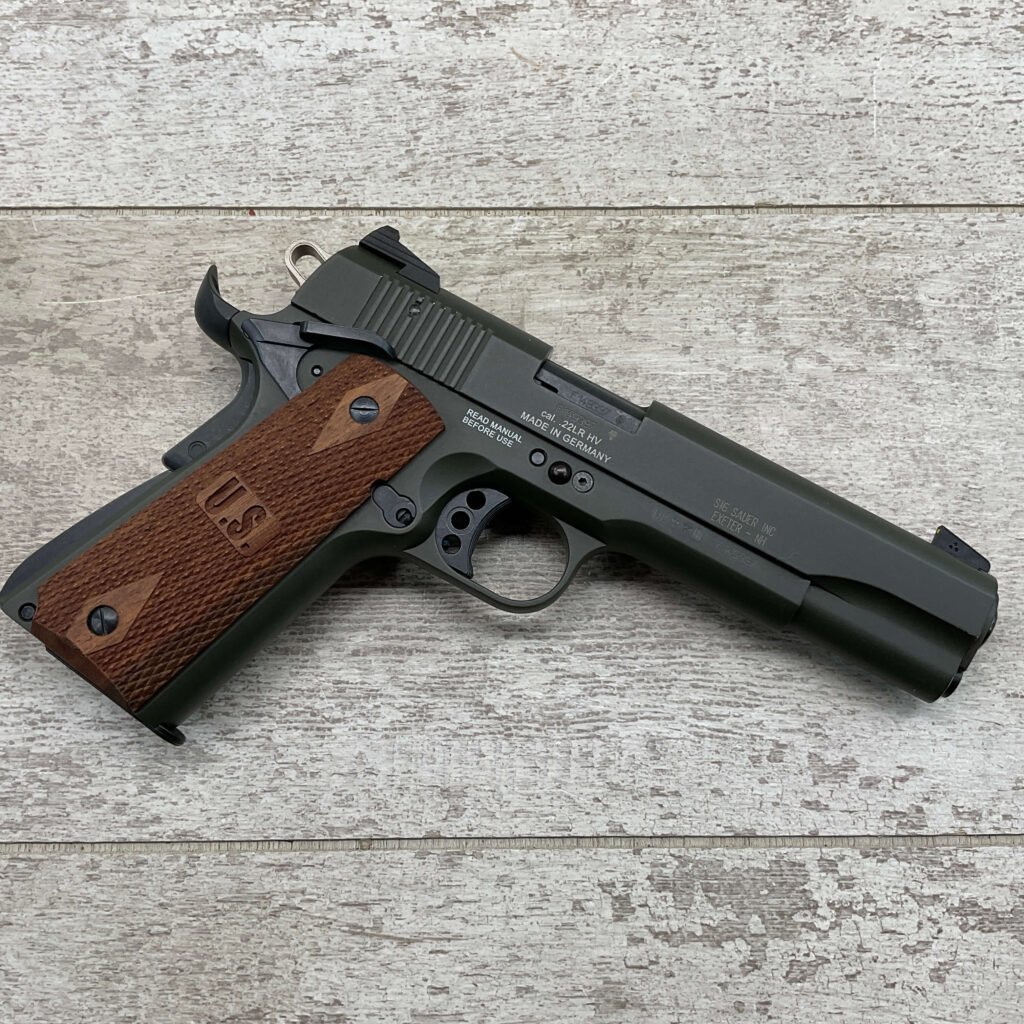 SIG SAUER 1911-22 .22LR SEMI AUTO PISTOL #F149397, MADE IN GERMANY, LIKE NEW/NEVER FIRED, 10+1 CAPACITY, OD GREEN ANODIZED FINISH, FULL SIZE, 5″ BARREL, 3 HOLE TRIGGER, HOGUE CUSTOM ROSEWOOD GRIPS, LOW PROFILE 3-DOT CONTRAST SIGHTS, 99+%