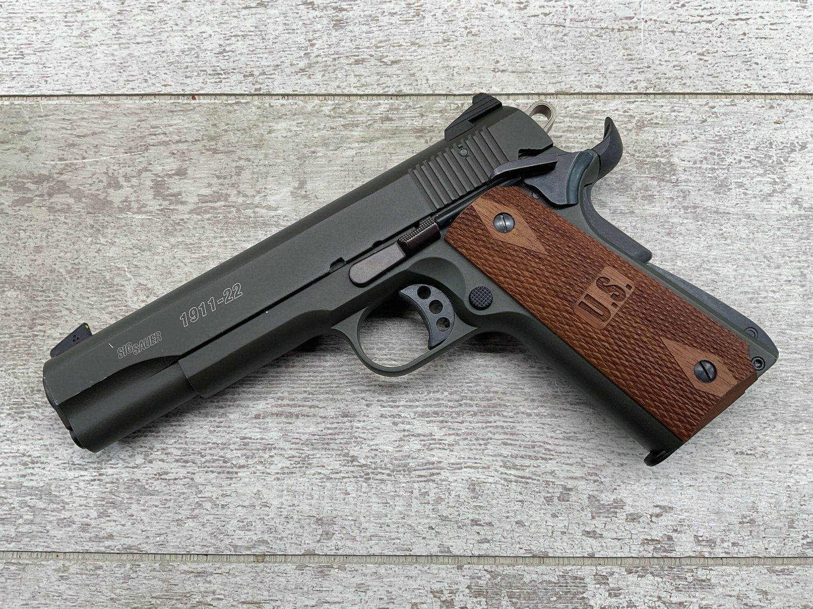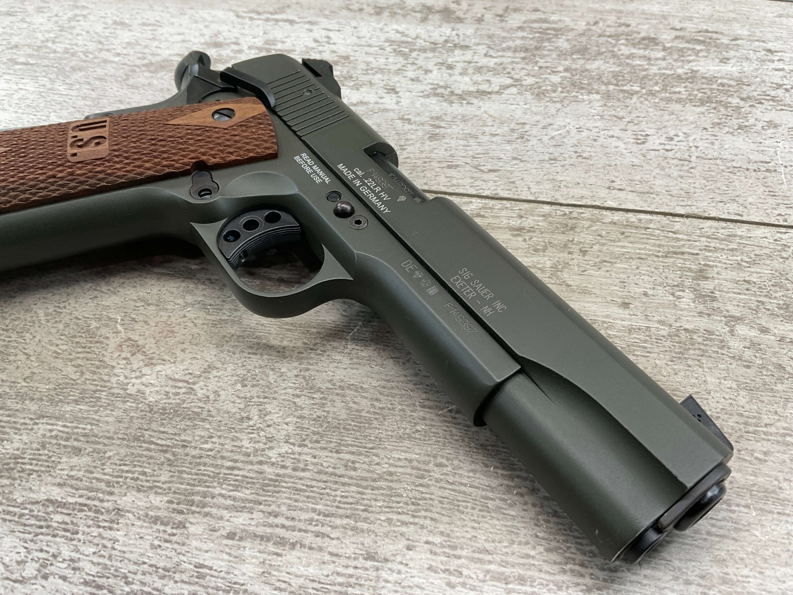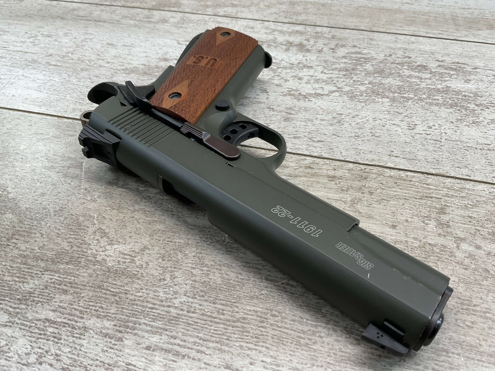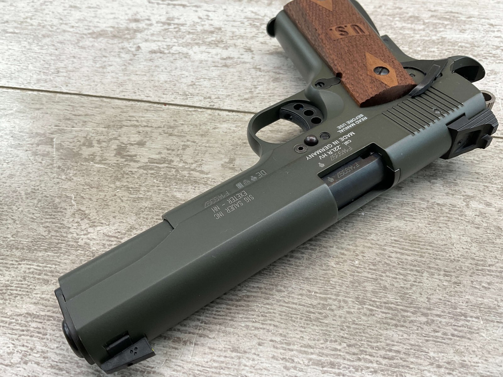 SIG SAUER 1911-22 .22LR SEMI AUTO PISTOL #F149397, MADE IN GERMANY, LIKE NEW/NEVER FIRED, 10+1 CAPACITY, OD GREEN ANODIZED FINISH, FULL SIZE, 5″ BARREL, 3 HOLE TRIGGER, HOGUE CUSTOM ROSEWOOD GRIPS, LOW PROFILE 3-DOT CONTRAST SIGHTS, 99+%