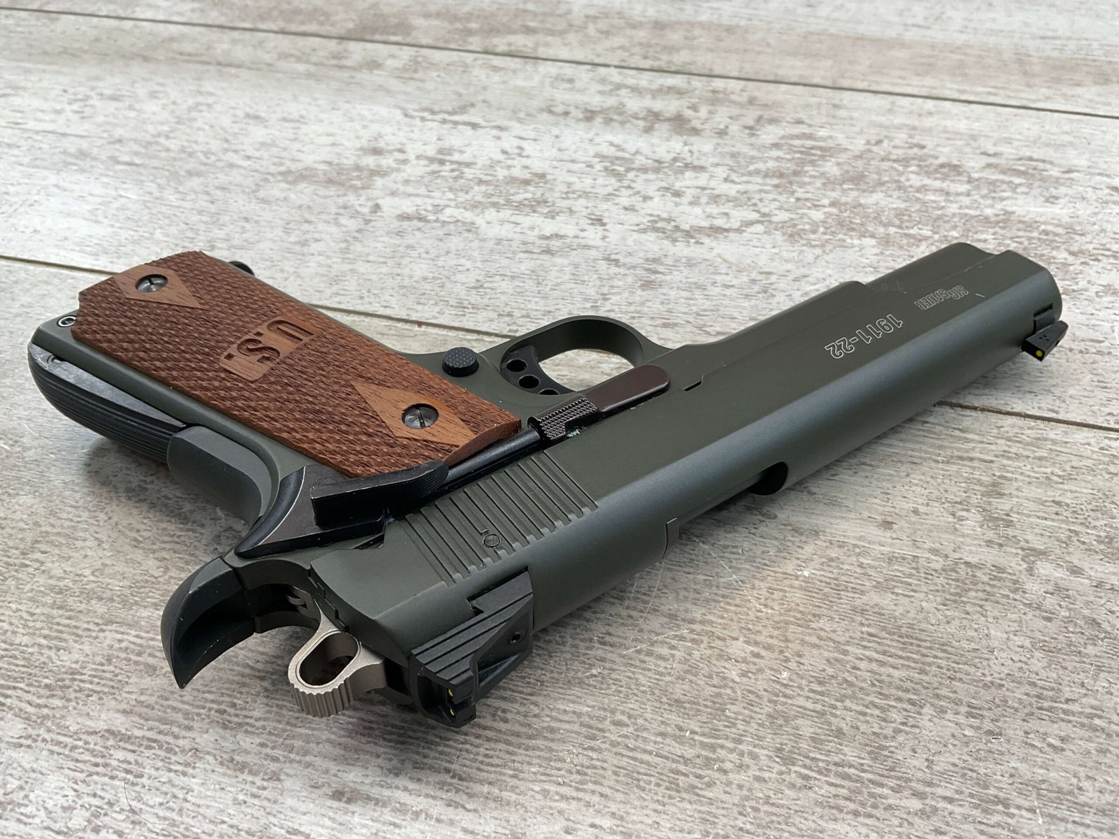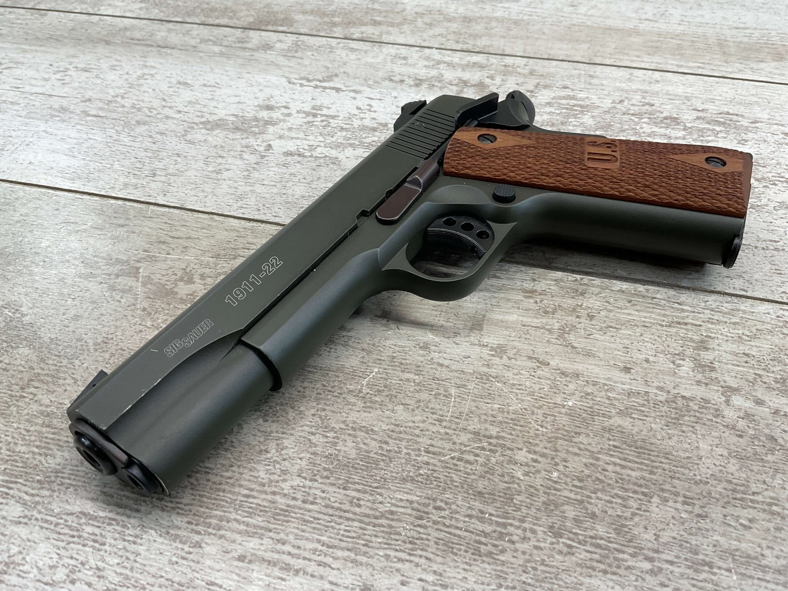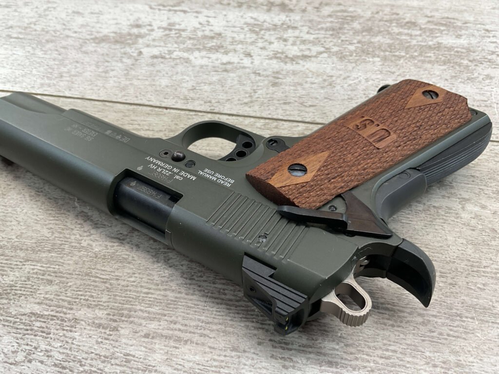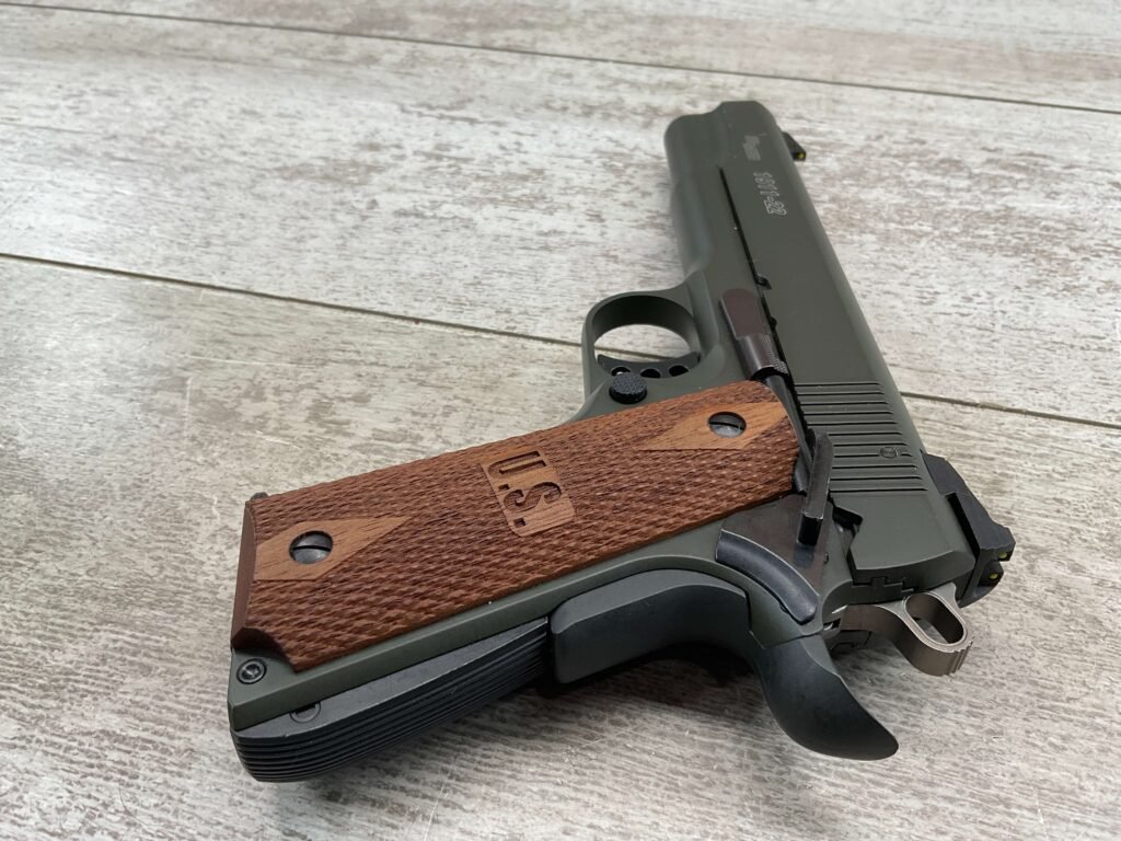 SIG SAUER 1911-22 .22LR SEMI AUTO PISTOL #F149397, MADE IN GERMANY, LIKE NEW/NEVER FIRED, 10+1 CAPACITY, OD GREEN ANODIZED FINISH, FULL SIZE, 5″ BARREL, 3 HOLE TRIGGER, HOGUE CUSTOM ROSEWOOD GRIPS, LOW PROFILE 3-DOT CONTRAST SIGHTS, 99+%