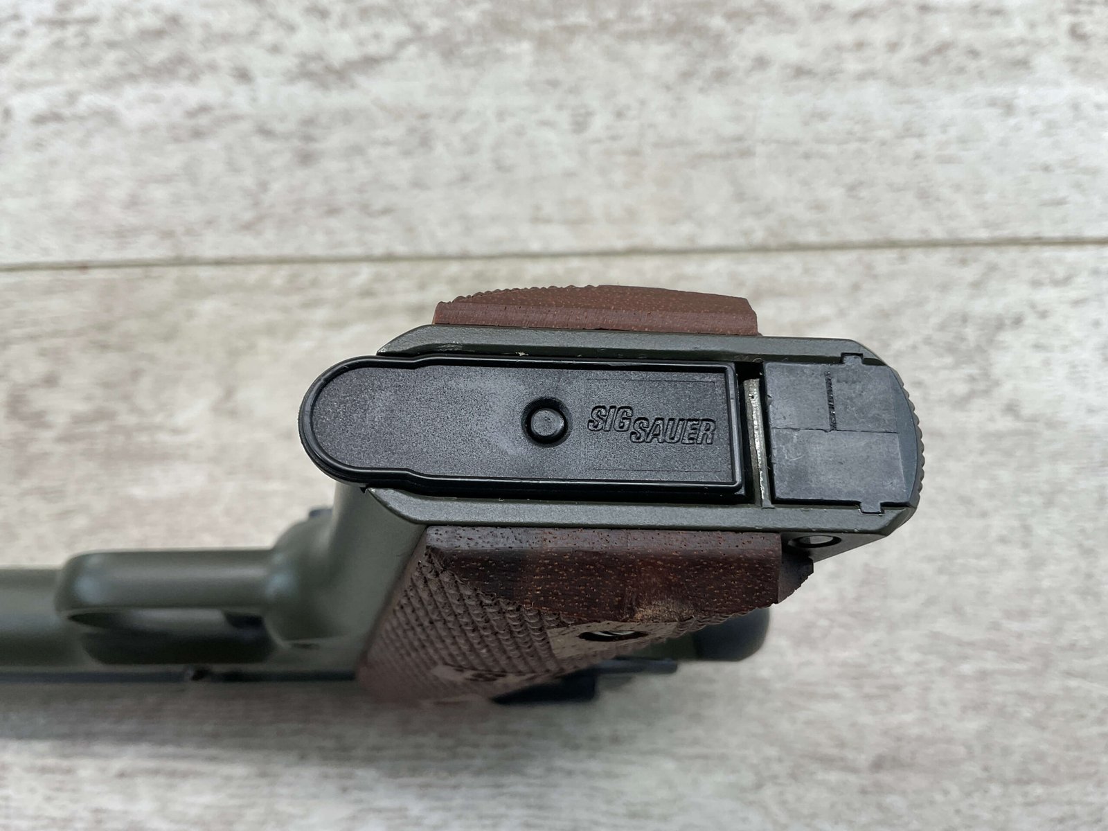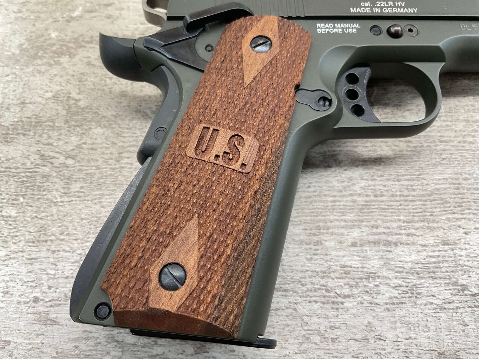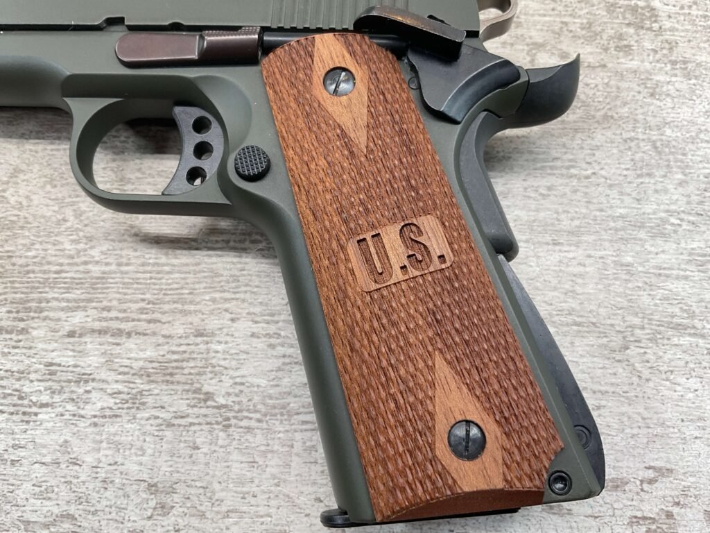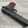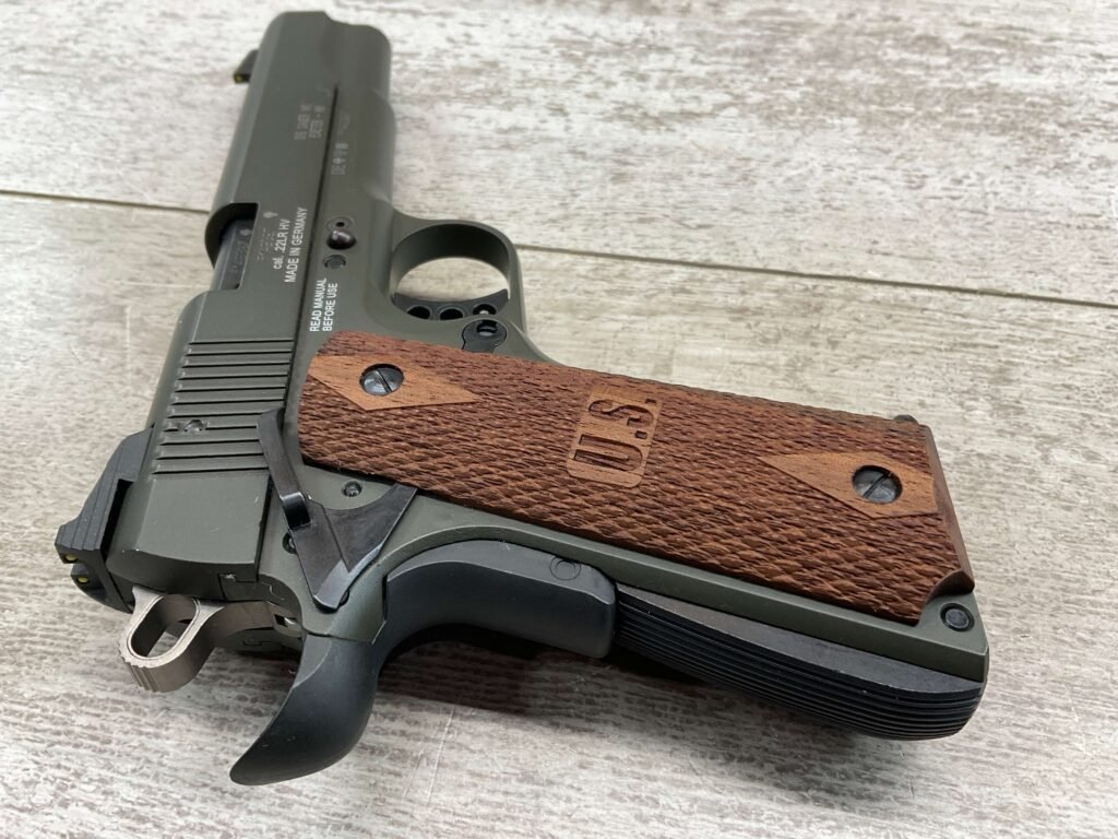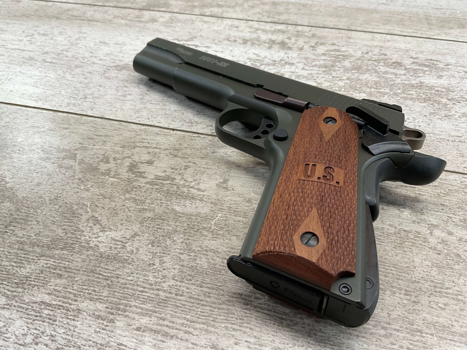 SIG SAUER 1911-22 .22LR SEMI AUTO PISTOL #F149397, MADE IN GERMANY, LIKE NEW/NEVER FIRED, 10+1 CAPACITY, OD GREEN ANODIZED FINISH, FULL SIZE, 5″ BARREL, 3 HOLE TRIGGER, HOGUE CUSTOM ROSEWOOD GRIPS, LOW PROFILE 3-DOT CONTRAST SIGHTS, 99+%