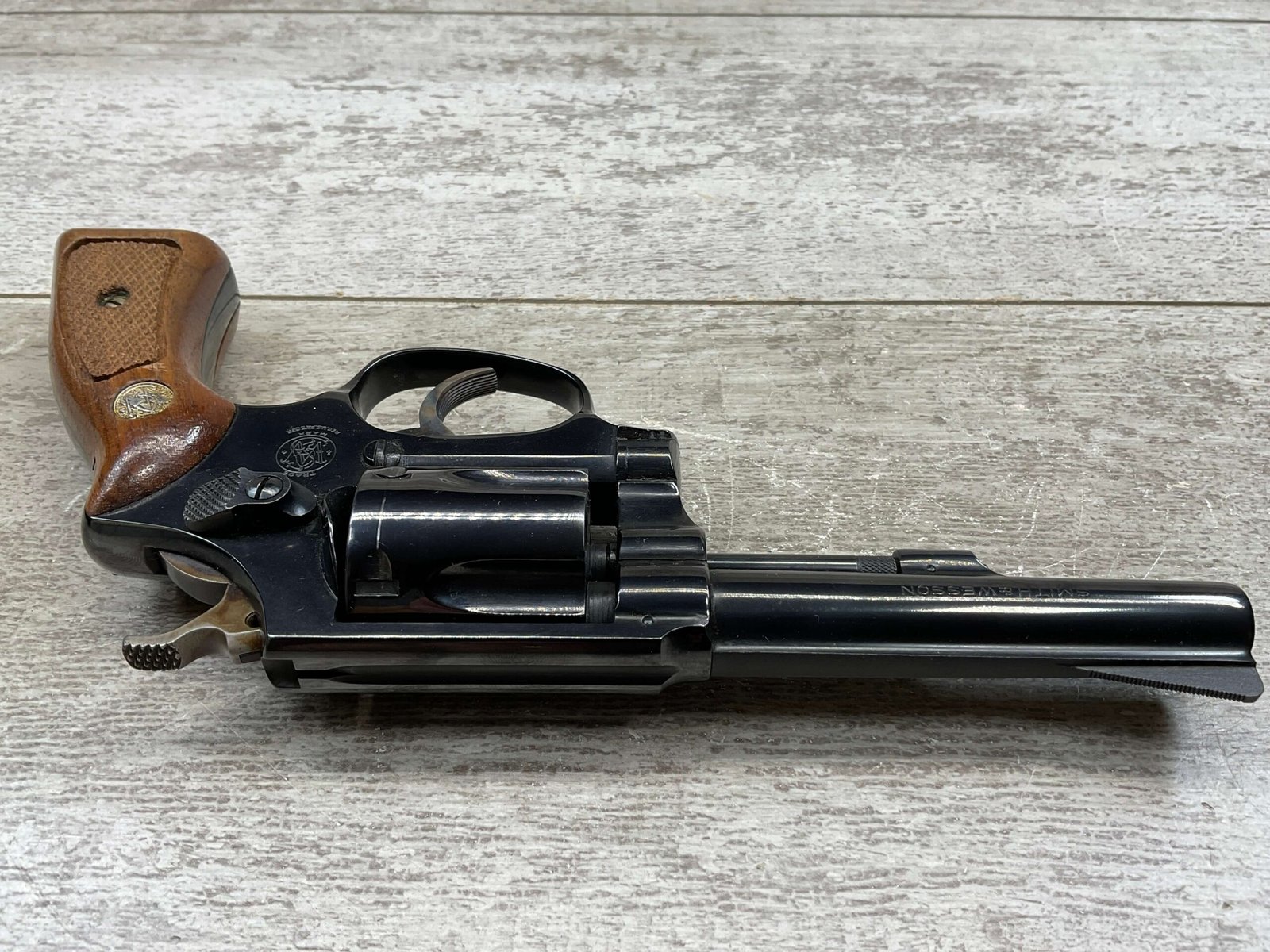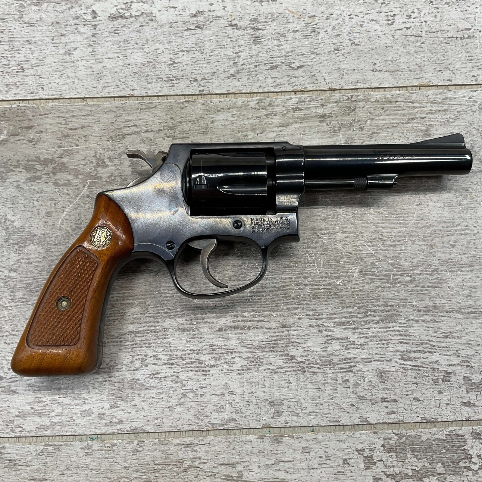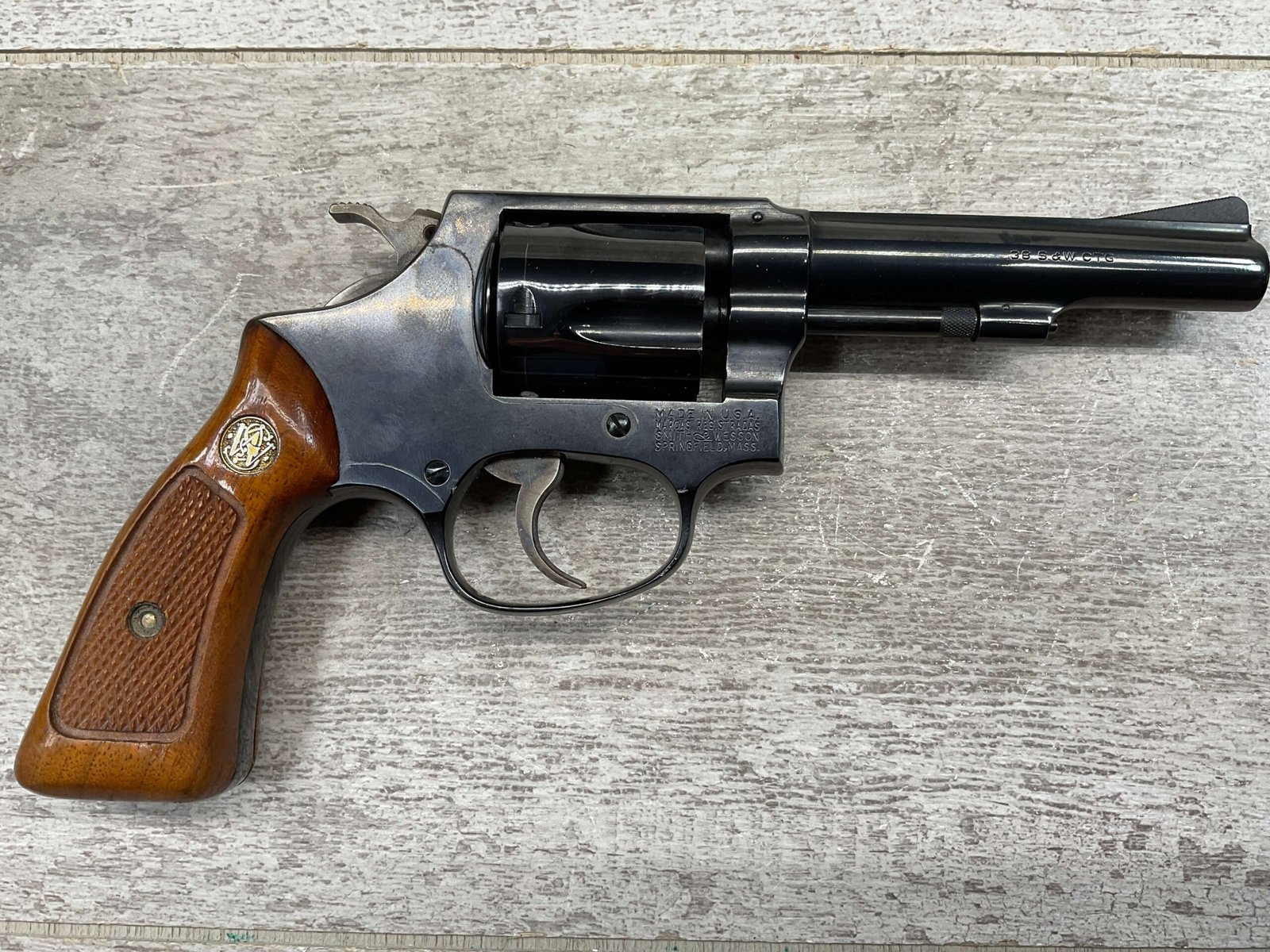 SMITH & WESSON 33-1, 38 S&W CTG REVOLVER, MINTY #R68622, EXC ORIGINAL BLUE FINISH W/ FAINT DRAGLINE ON CYLINDER, EXC CHECKERED WALNUT GRIPS, EXC BORE & RIFLNG (9.9/10), LEFT SIDE OF BBL MARKED “SMITH & WESSON”, RIGHT SIDE OF BBL MARKED “38 S&W CTG”, RIGHT SIDE OF FRAME IS MARKED “MADE IN U.S.A.”, LEFT SIDE OF FRAME IS MARKED W/ TRADEMARK CARTOUCHE, VERY NICE 98%+ LIKE NEW REVOLVER