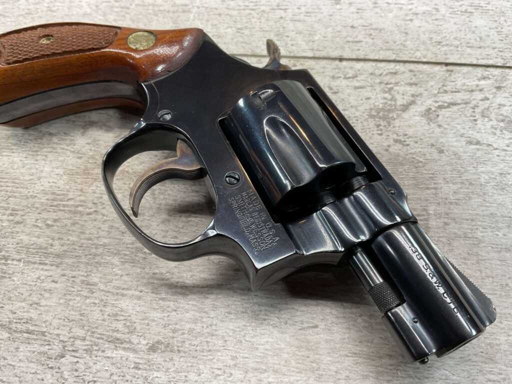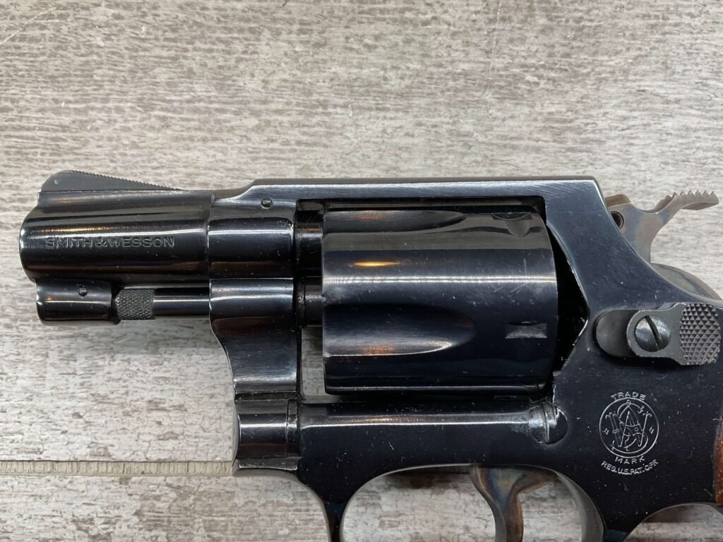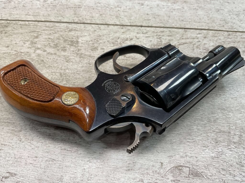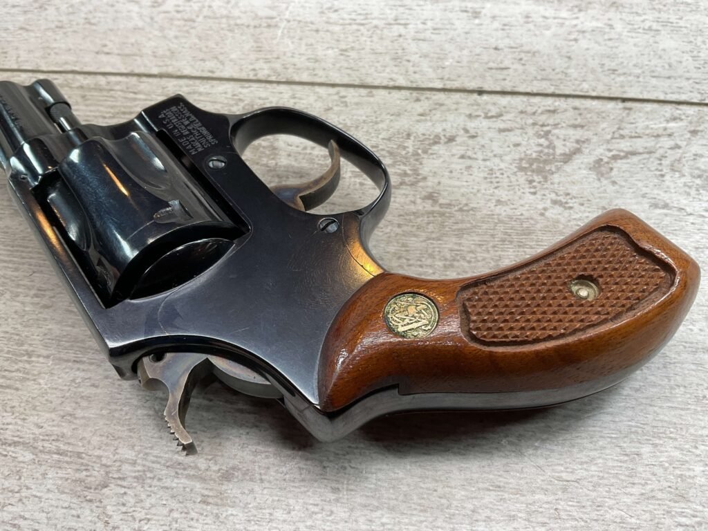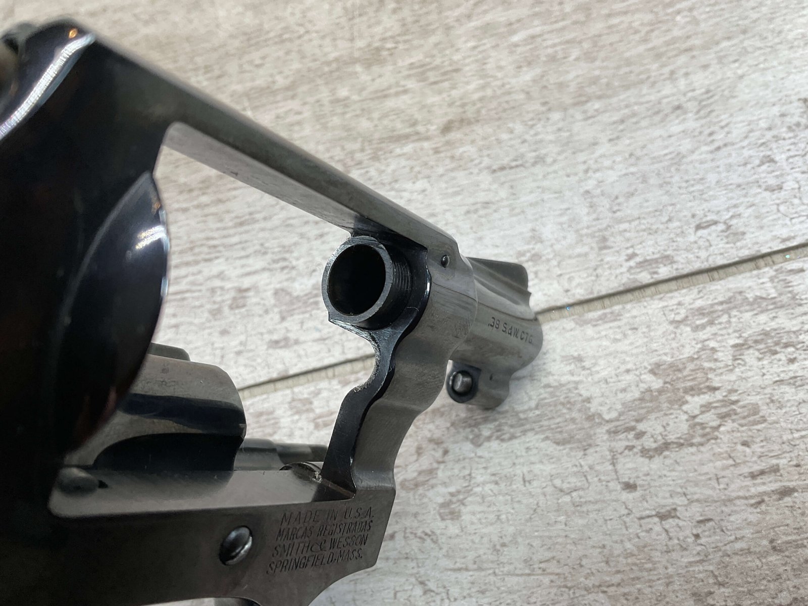 SMITH & WESSON .38S&W DA TERRIER MODEL REVOLVER #R45912, 5 SHOT, 2″ BARREL, 95+% ORIGINAL BLUE FINISH, VERY LIGHT HANDLING MARKS, EXC BORE & RIFLING (9.5+/10), EXCELLENT STRONG ACTION/LOCKUP, AUTO EJECTING, EXC S&W TRADEMARKED CHECKERED WALNUT GRIPS, CASE COLOR HARDENED TRIGGER AND HAMMER, PINNED BARREL, 95+% OVERALL