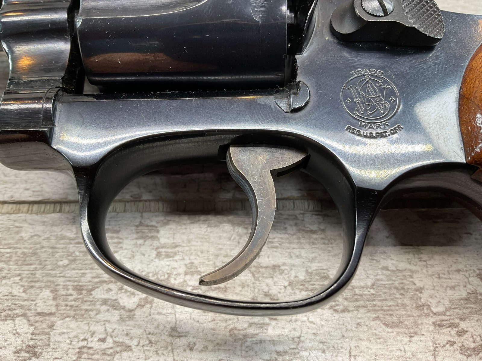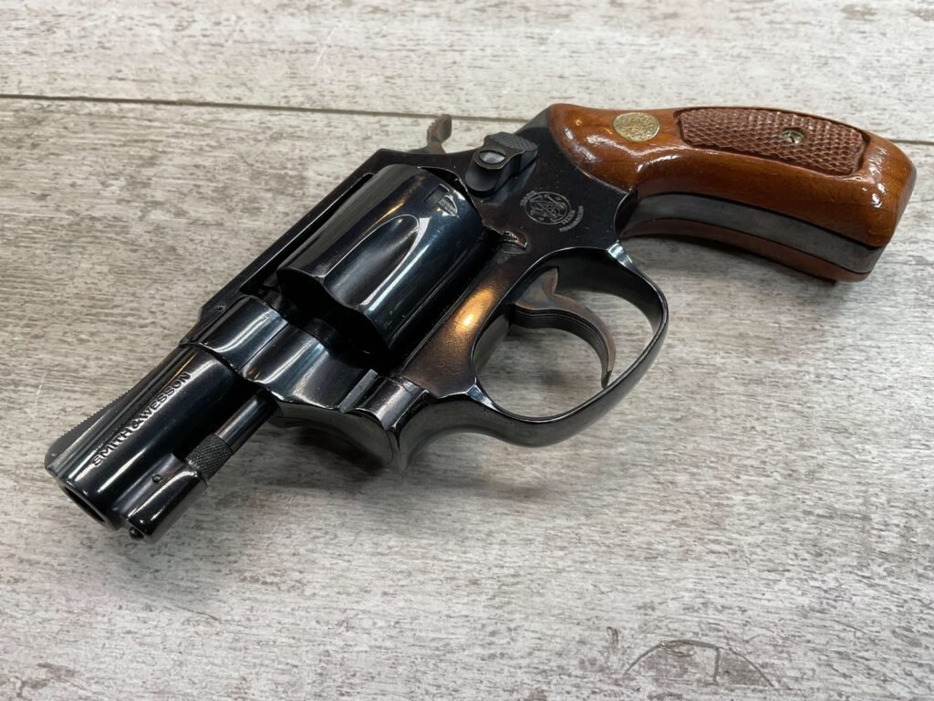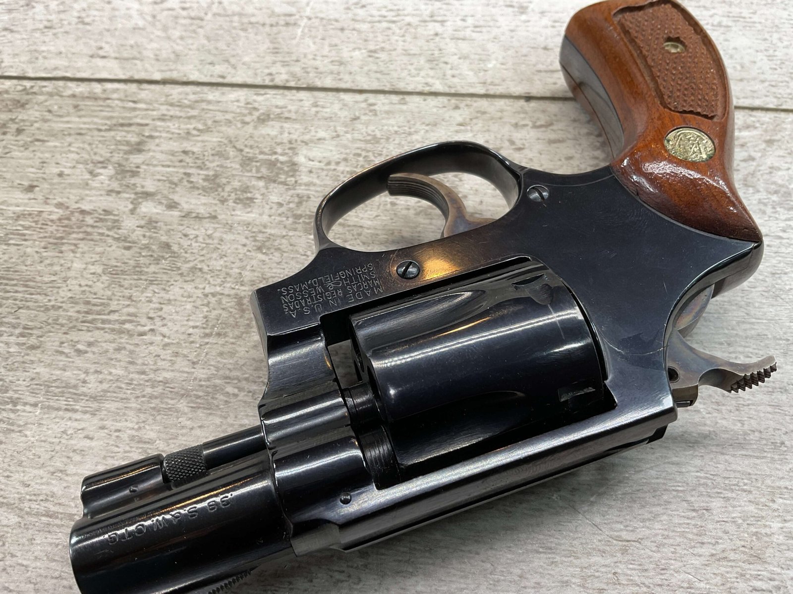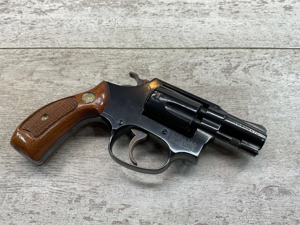 SMITH & WESSON .38S&W DA TERRIER MODEL REVOLVER #R45912, 5 SHOT, 2″ BARREL, 95+% ORIGINAL BLUE FINISH, VERY LIGHT HANDLING MARKS, EXC BORE & RIFLING (9.5+/10), EXCELLENT STRONG ACTION/LOCKUP, AUTO EJECTING, EXC S&W TRADEMARKED CHECKERED WALNUT GRIPS, CASE COLOR HARDENED TRIGGER AND HAMMER, PINNED BARREL, 95+% OVERALL