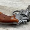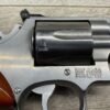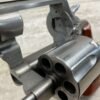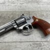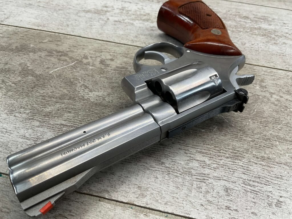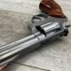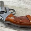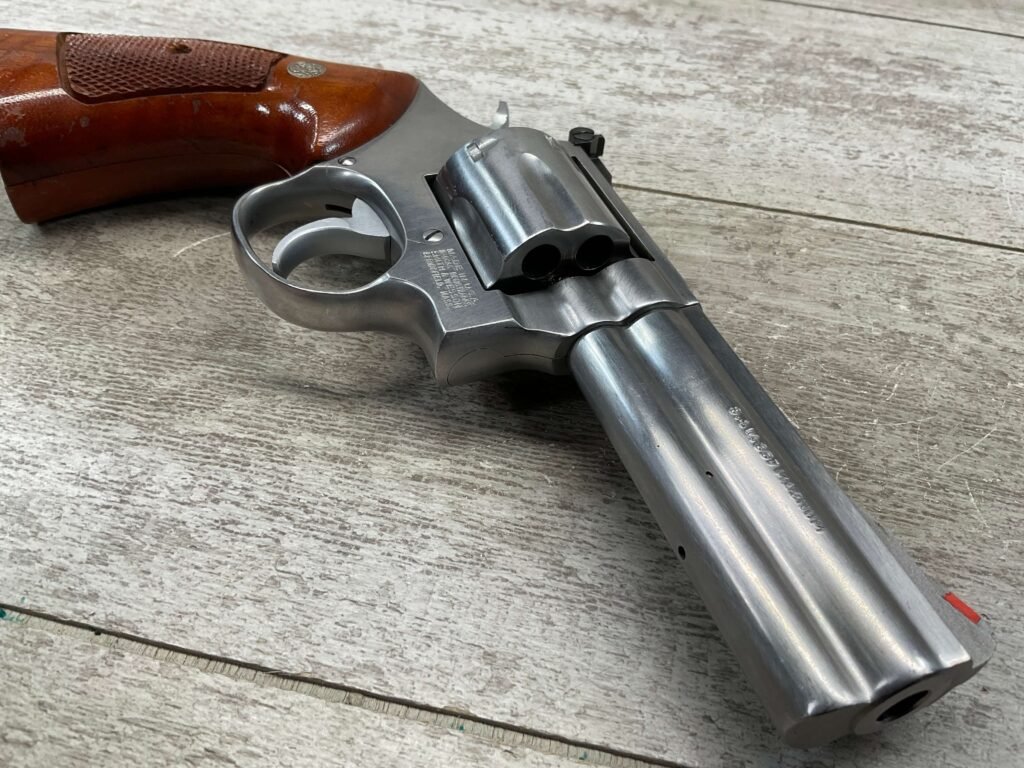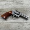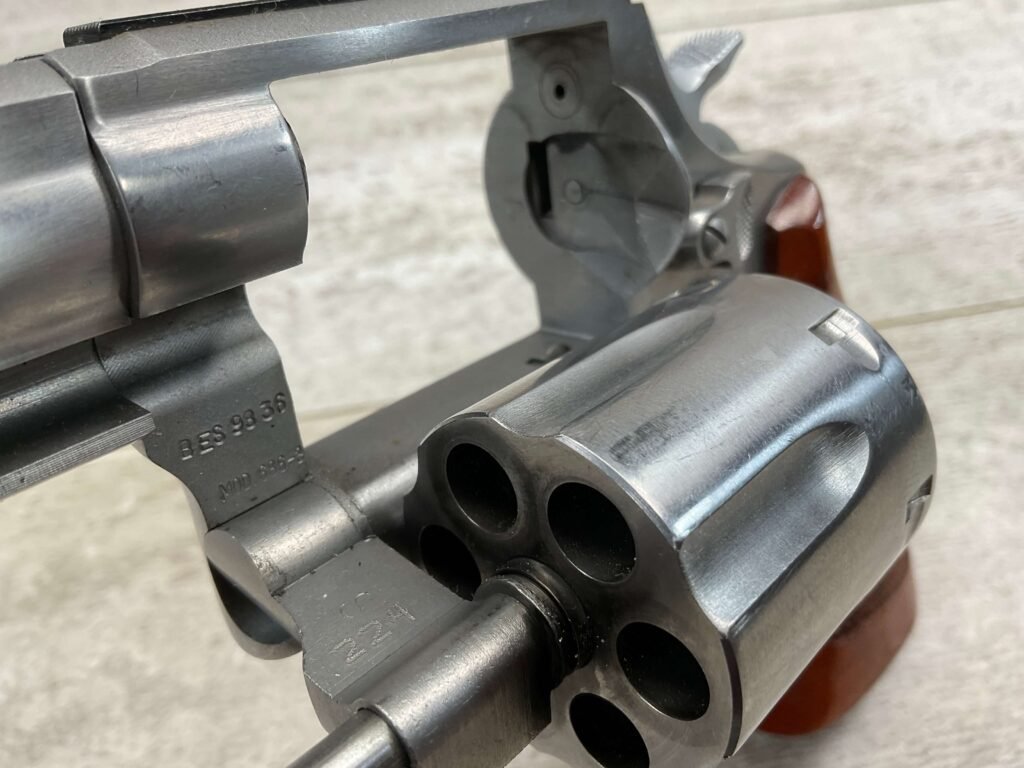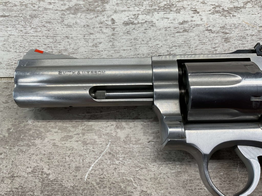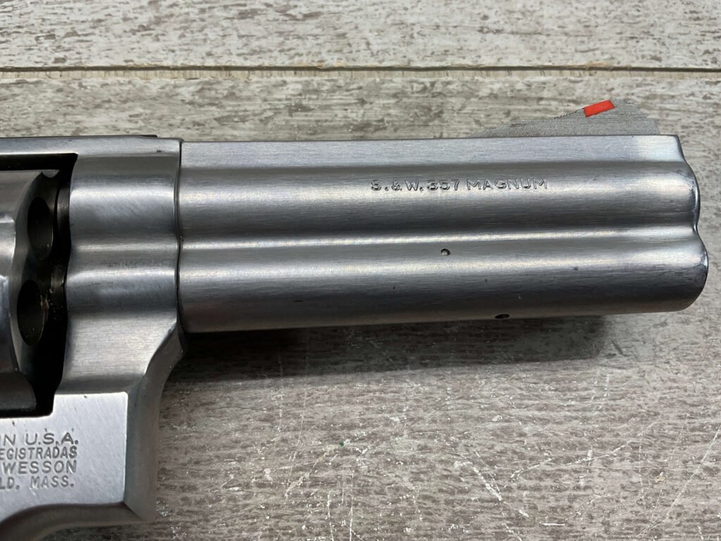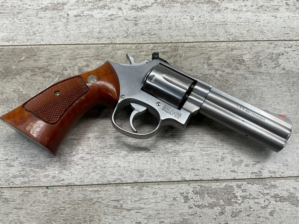 SMITH & WESSON S&W 686-3 .357 MAGNUM STAINLESS STEEL REVOLVER #BES9836, 4 1/8″ BARREL, EXC STAINLESS STEEL FINISH W/VERY LIGHT HANDLING MARKS, EXC BORE & RIFLING, VG CHECKERED WALNUT GRIPS W/LIGHT WEAR & PIECE MISSING ON BACKSTRAP, REAR ADJ SIGHT, BLADE FRONT SIGHT, TIGHT LOCK UP, 90%+ OVERALL
