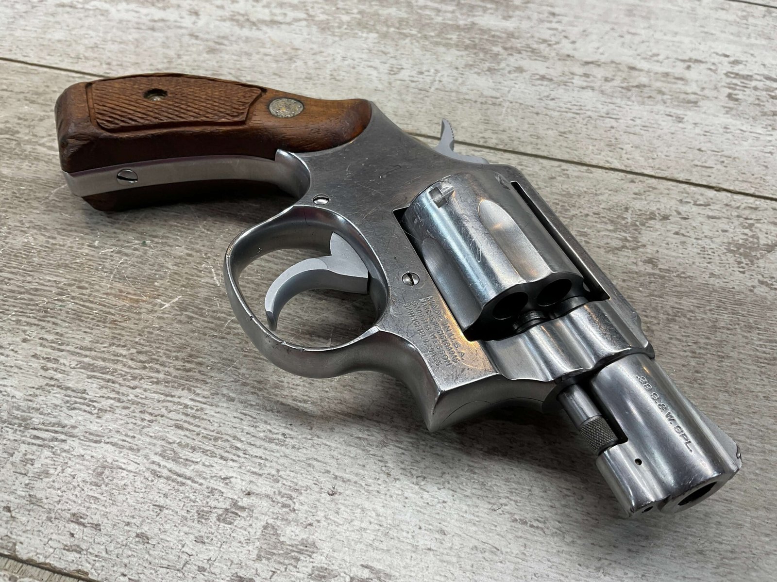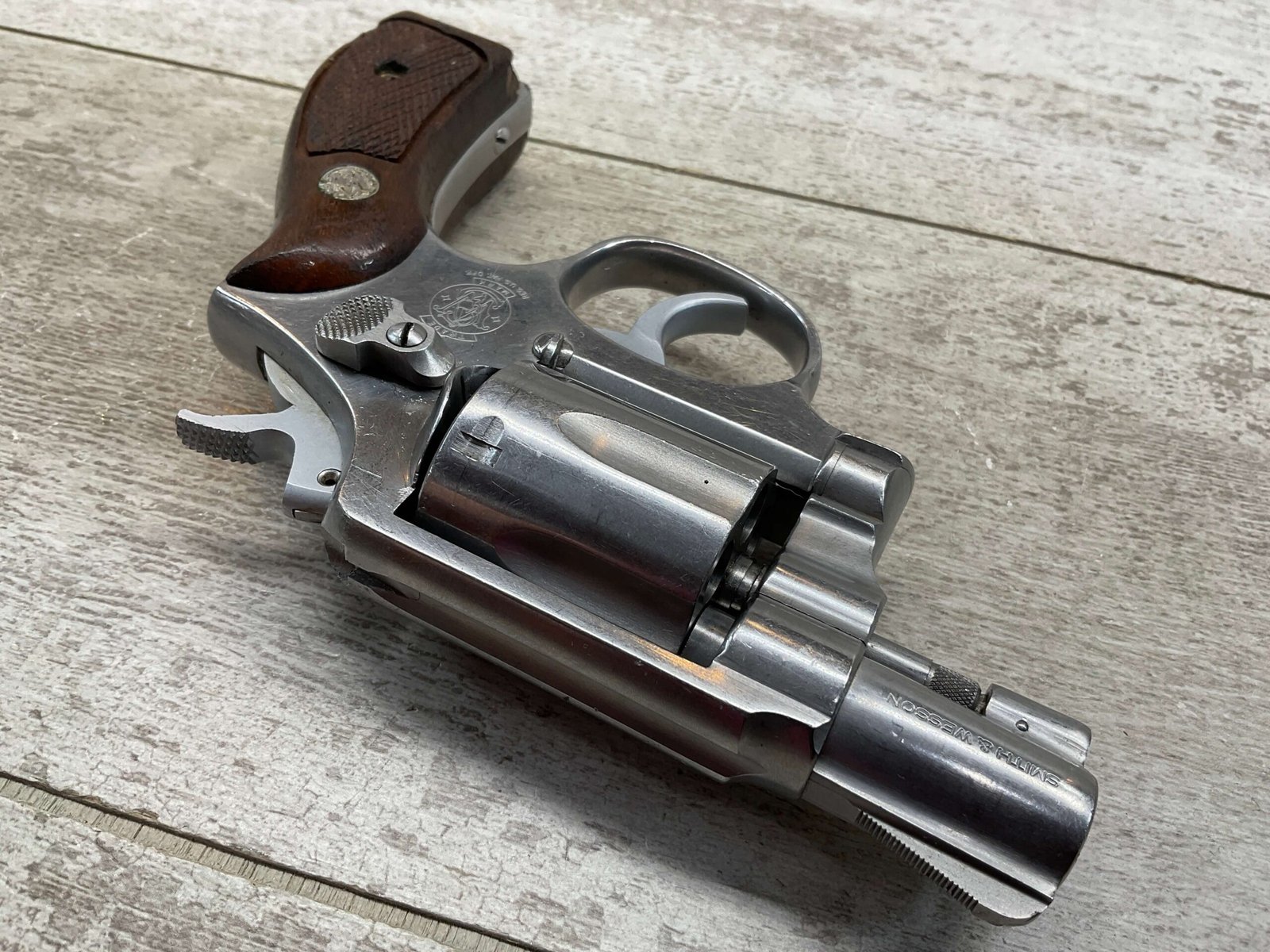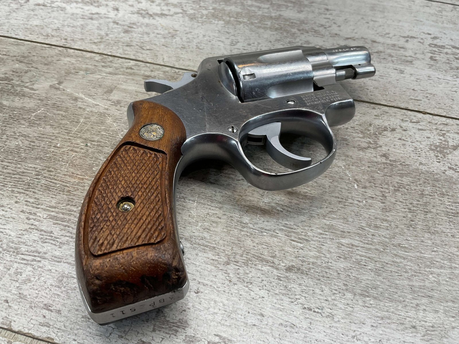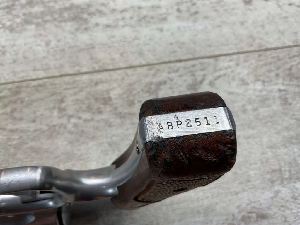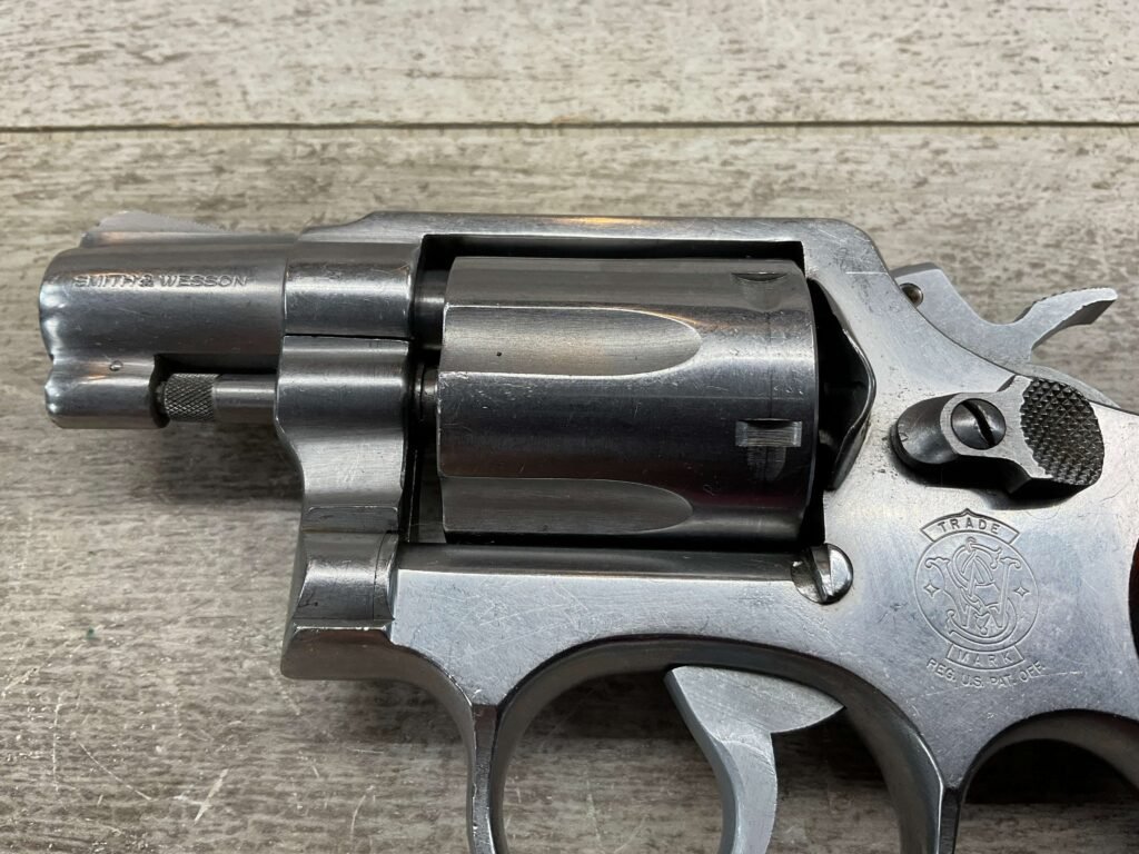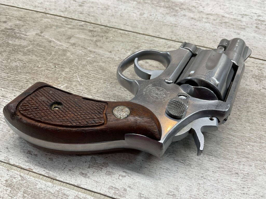 SMITH & WESSON S&W MODEL 64-2 .38 SPECIAL REVOLVER #ABP2511, K-FRAME, ROUND BUTT, SATIN STAINLESS STEEL FINISH, 2″ BARREL, EXCELLENT BRIGHT BORE & EXC RIFLING, LIGHT-HEAVY HANDLING/USE MARKS, SMALL CHIP ON LEFT GRIP & OTHER SCRATCHES & DINGS FROM USE, TIGHT LOCK UP, WAS A GLOVE COMPARTMENT BACKUP, 85% OVERALL
