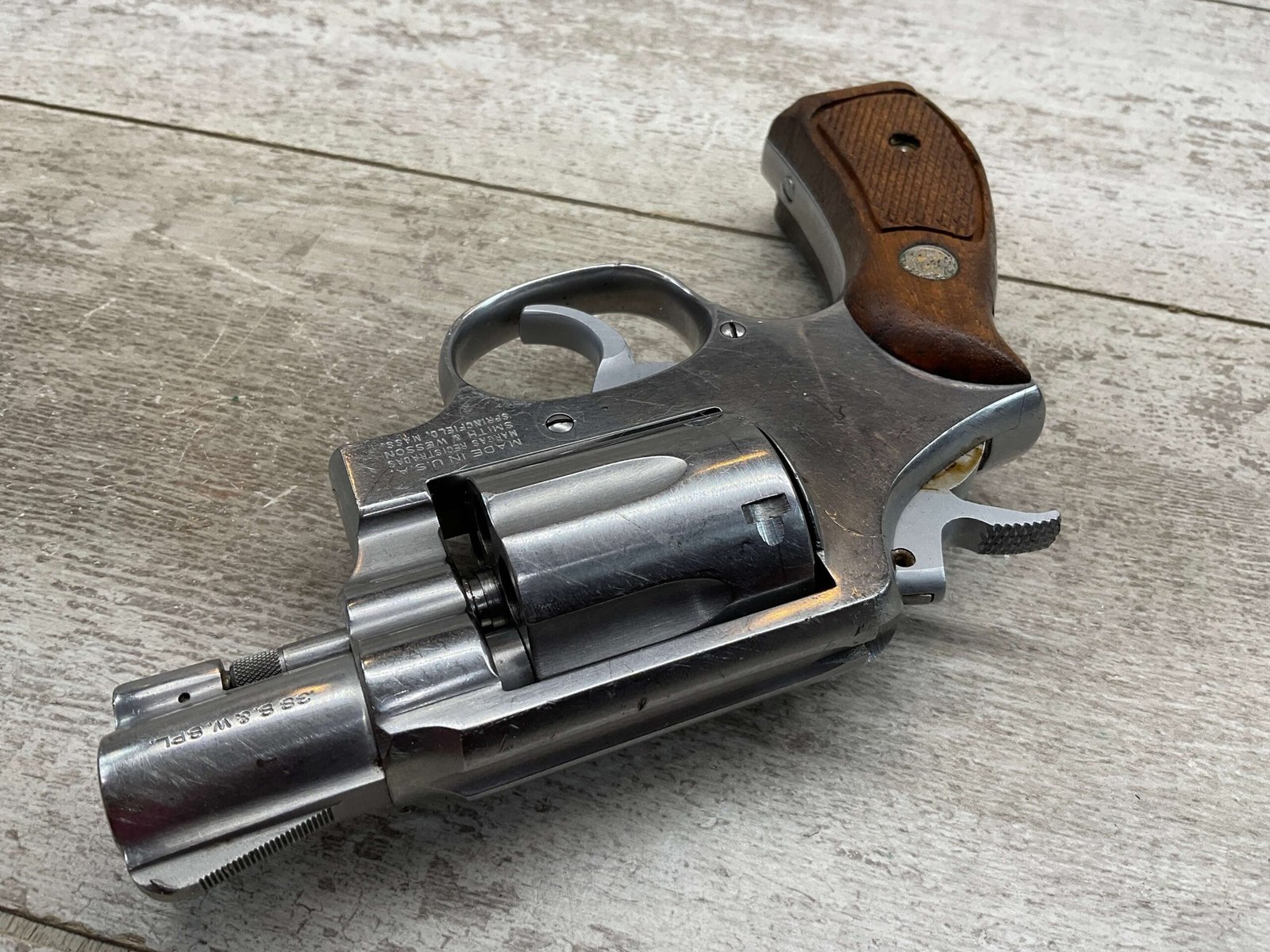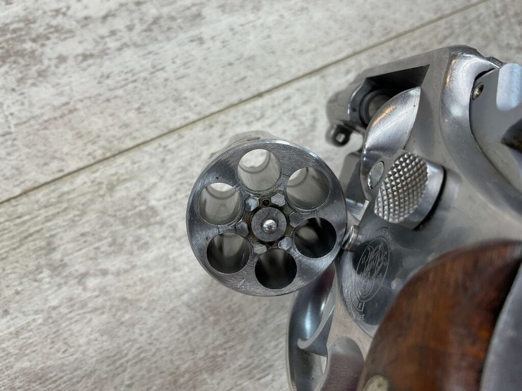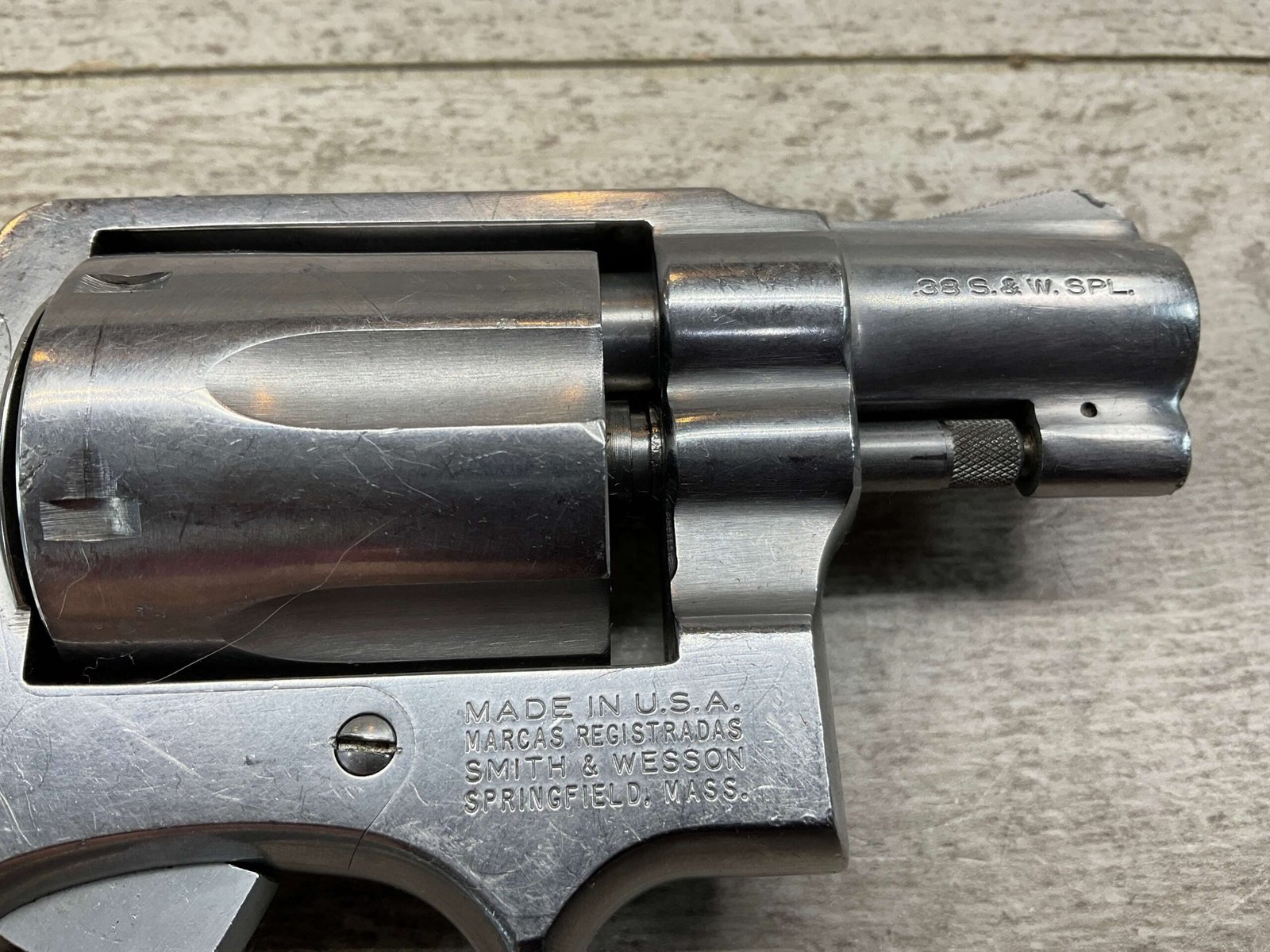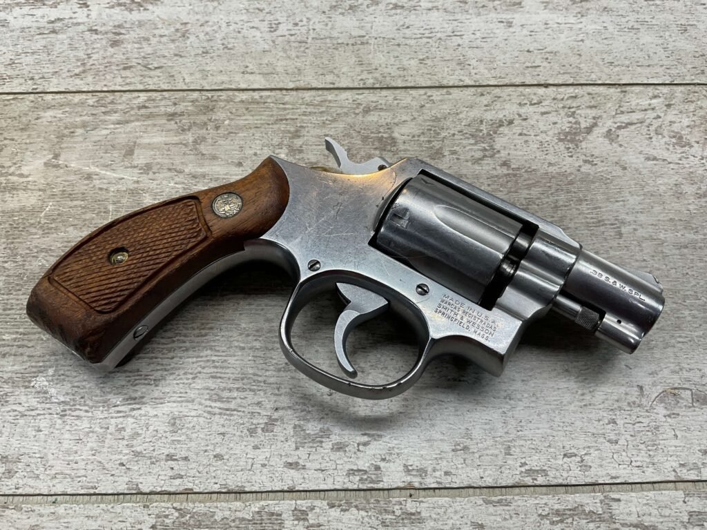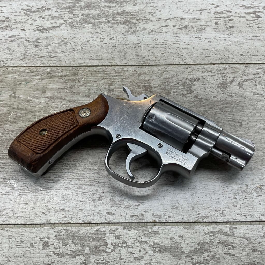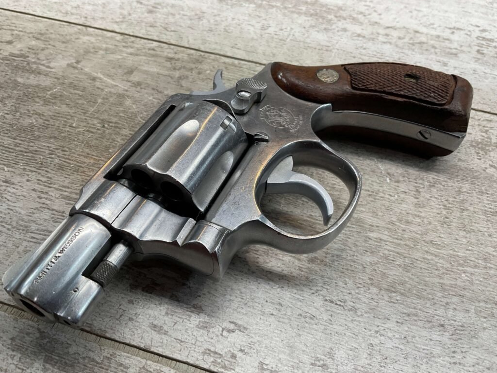 SMITH & WESSON S&W MODEL 64-2 .38 SPECIAL REVOLVER #ABP2511, K-FRAME, ROUND BUTT, SATIN STAINLESS STEEL FINISH, 2″ BARREL, EXCELLENT BRIGHT BORE & EXC RIFLING, LIGHT-HEAVY HANDLING/USE MARKS, SMALL CHIP ON LEFT GRIP & OTHER SCRATCHES & DINGS FROM USE, TIGHT LOCK UP, WAS A GLOVE COMPARTMENT BACKUP, 85% OVERALL