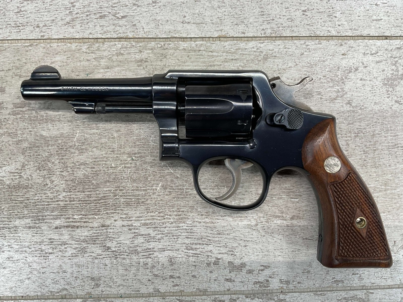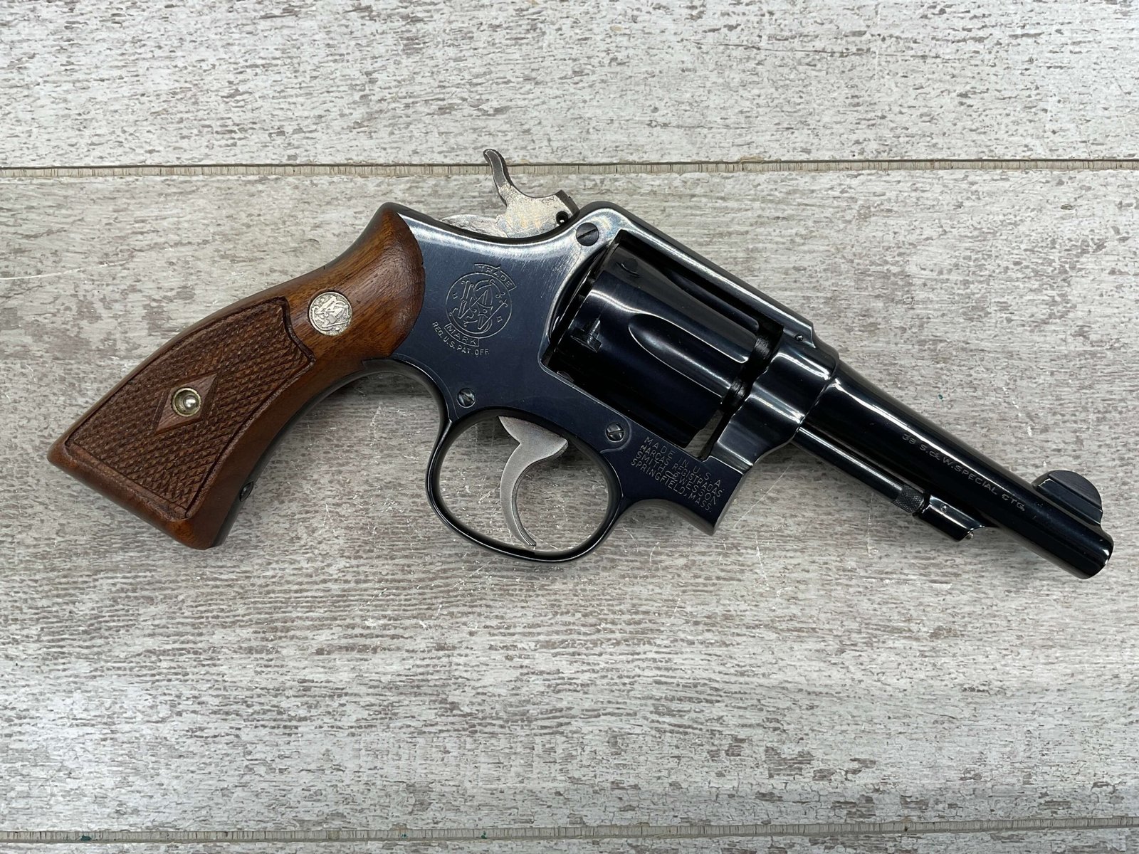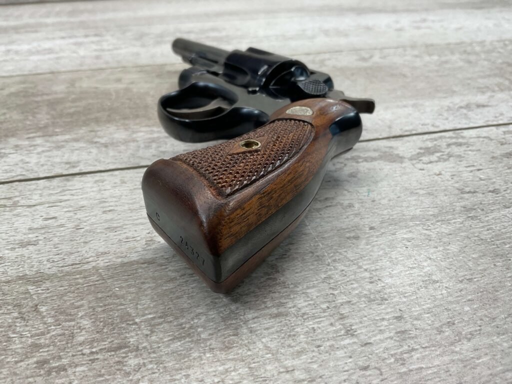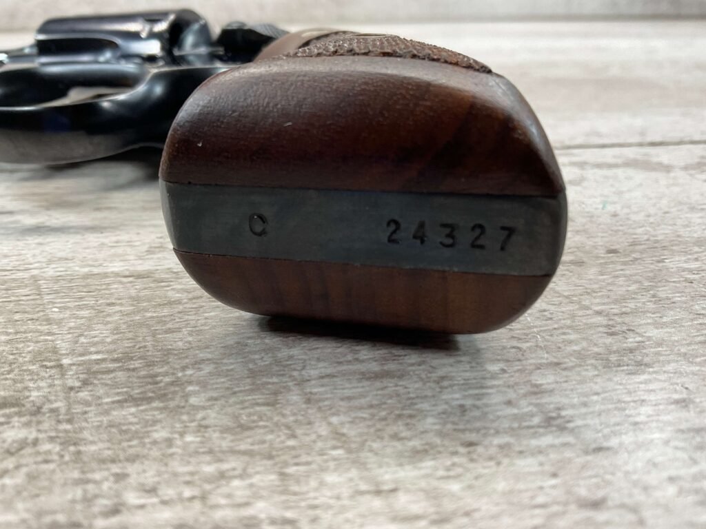 SMITH & WESSON S&W PRE-MODEL 10 .38 SPECIAL REVOLVER, 1953 MFR #C 24327(9), THE 9 IS MISSING ON THE BUTT (IS CORRECT EVERYWHERE ELSE), ALL MATCHING, 4″ PINNED & TAPPERED BARREL, JULY OF 1953 MFR, EXCELLENT HIGH POLISH BLUE, EXC CHECKERED WALNUT GRIPS W/S&W MEDALLIONS, VERY FAINT CYLINDER MARK, MINTY BORE & RIFLING, UNIT MARKING ON FRAME BELOW CYLINDER (ONCE YOU OPEN CYLINDER YOU WILL SEE IT, 4221-42), ORIGINAL BOX W/SERIAL # AND UNIT MARKING, 98%+ OVERALL