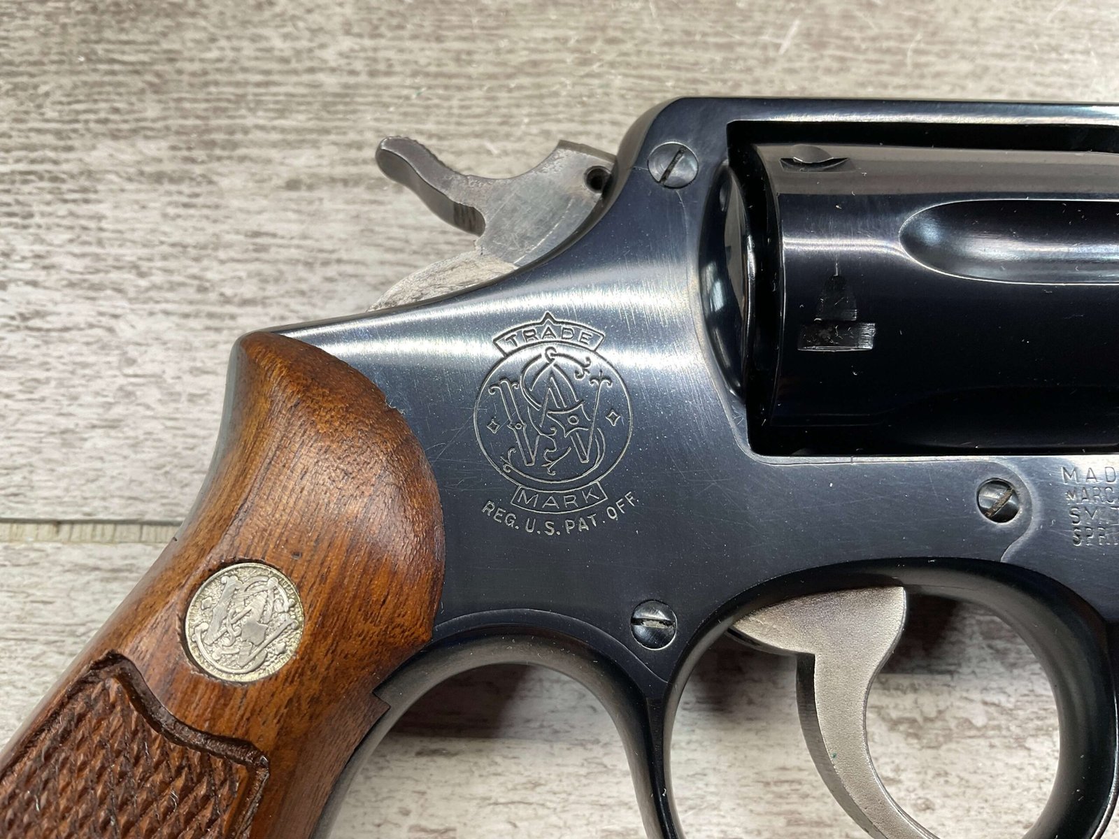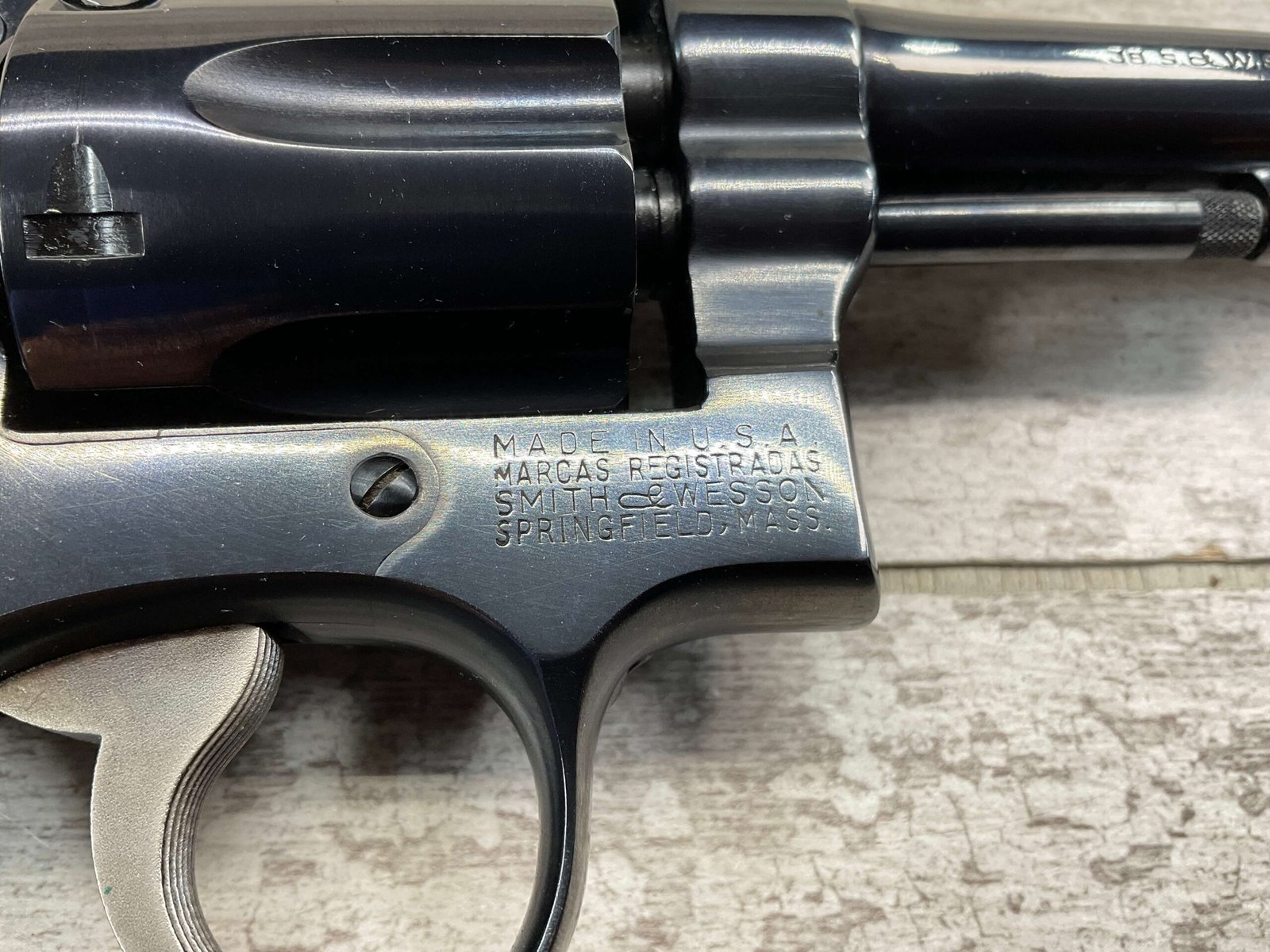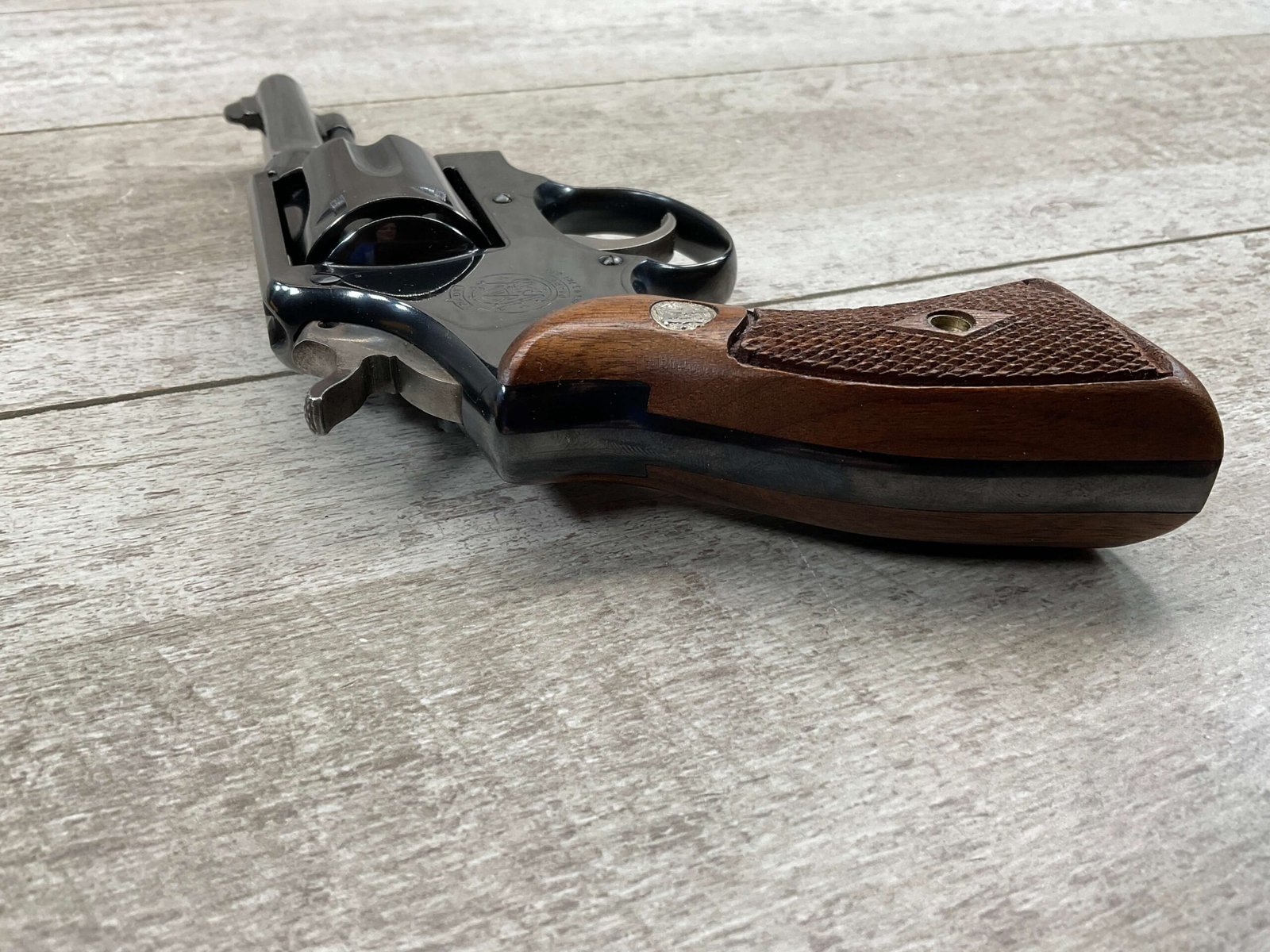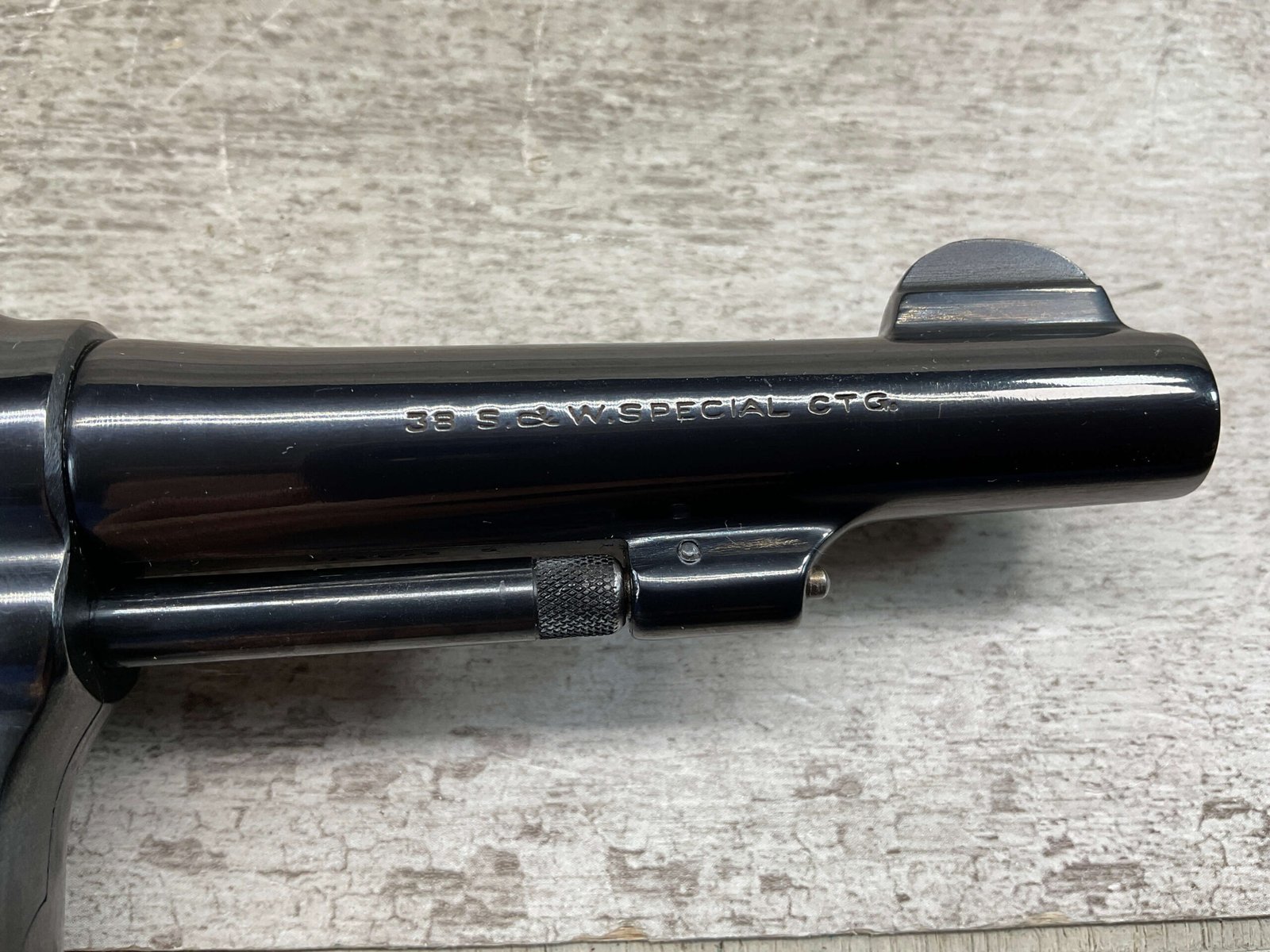 SMITH & WESSON S&W PRE-MODEL 10 .38 SPECIAL REVOLVER, 1953 MFR #C 24327(9), THE 9 IS MISSING ON THE BUTT (IS CORRECT EVERYWHERE ELSE), ALL MATCHING, 4″ PINNED & TAPPERED BARREL, JULY OF 1953 MFR, EXCELLENT HIGH POLISH BLUE, EXC CHECKERED WALNUT GRIPS W/S&W MEDALLIONS, VERY FAINT CYLINDER MARK, MINTY BORE & RIFLING, UNIT MARKING ON FRAME BELOW CYLINDER (ONCE YOU OPEN CYLINDER YOU WILL SEE IT, 4221-42), ORIGINAL BOX W/SERIAL # AND UNIT MARKING, 98%+ OVERALL