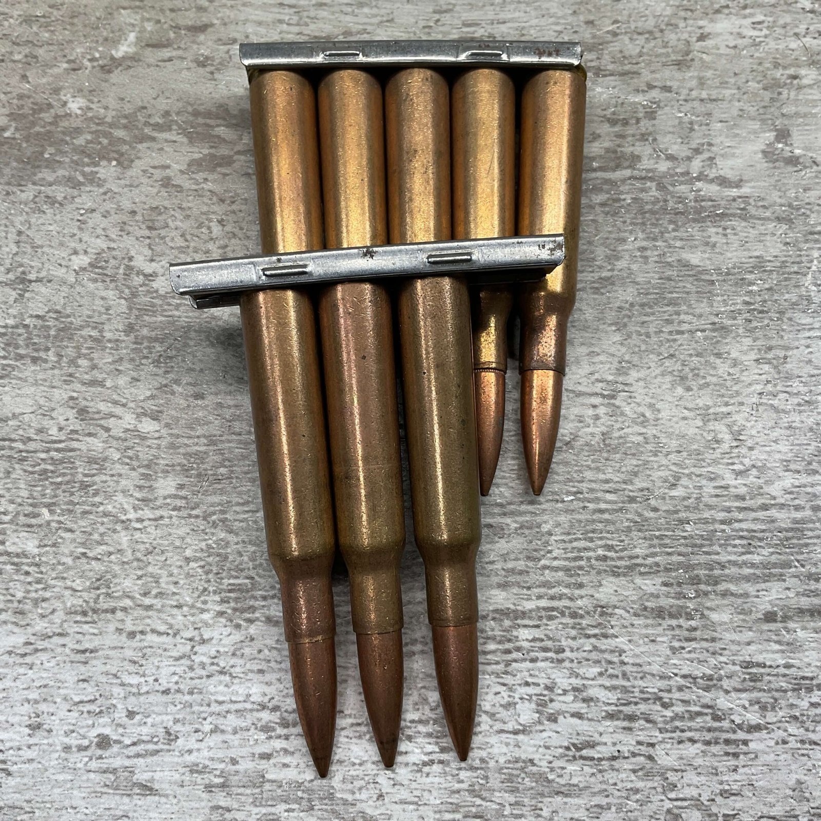 SPANISH 1953 7X57MM MAUSER AMMO, FABRICA NACIONAL DE TOLEDO (FNT), VINTAGE, ON STRIPPER CLIPS, HEADSTAMP “FNT / 1953”.