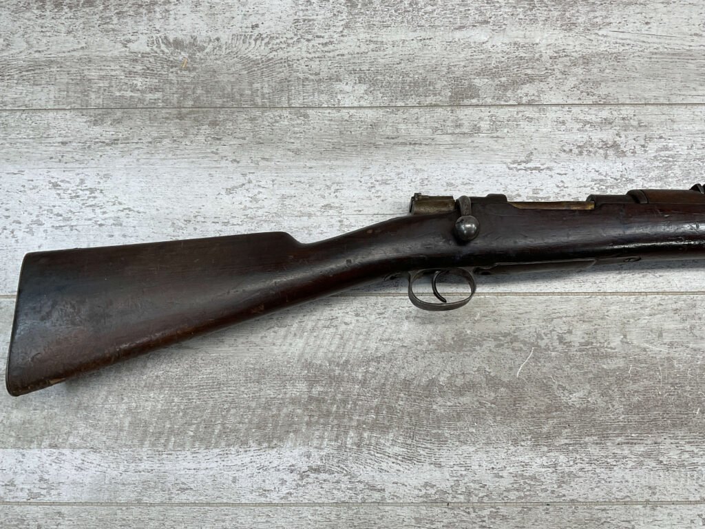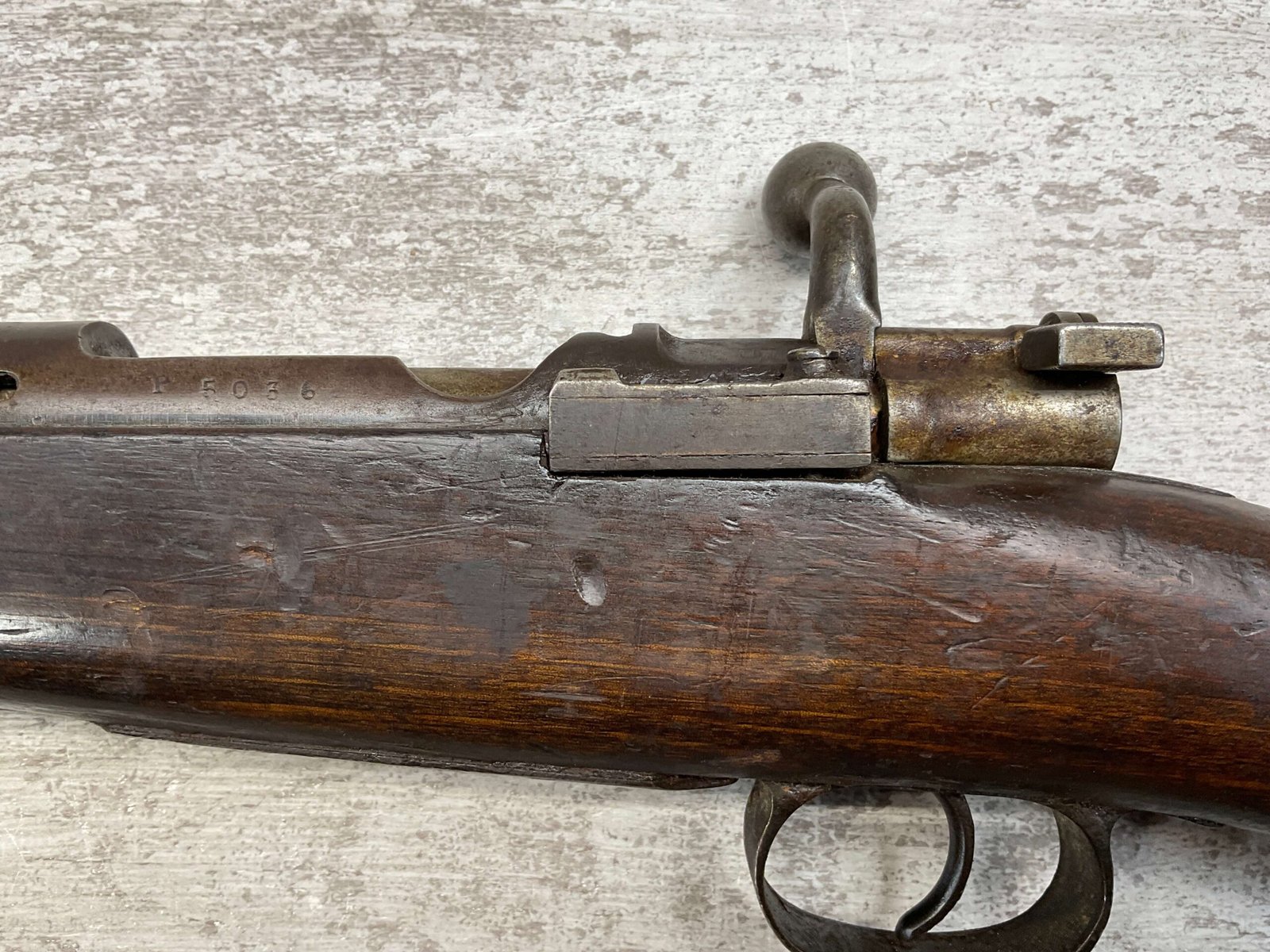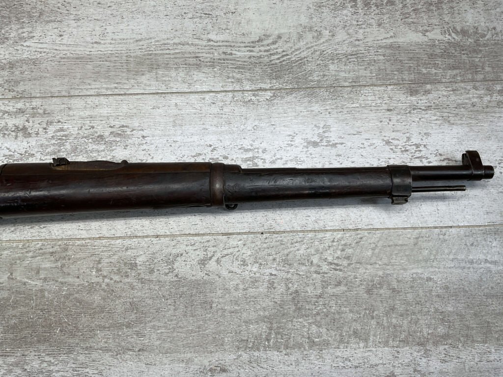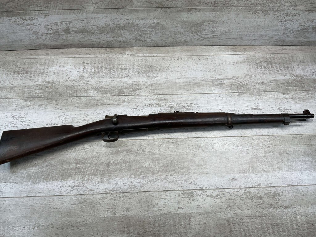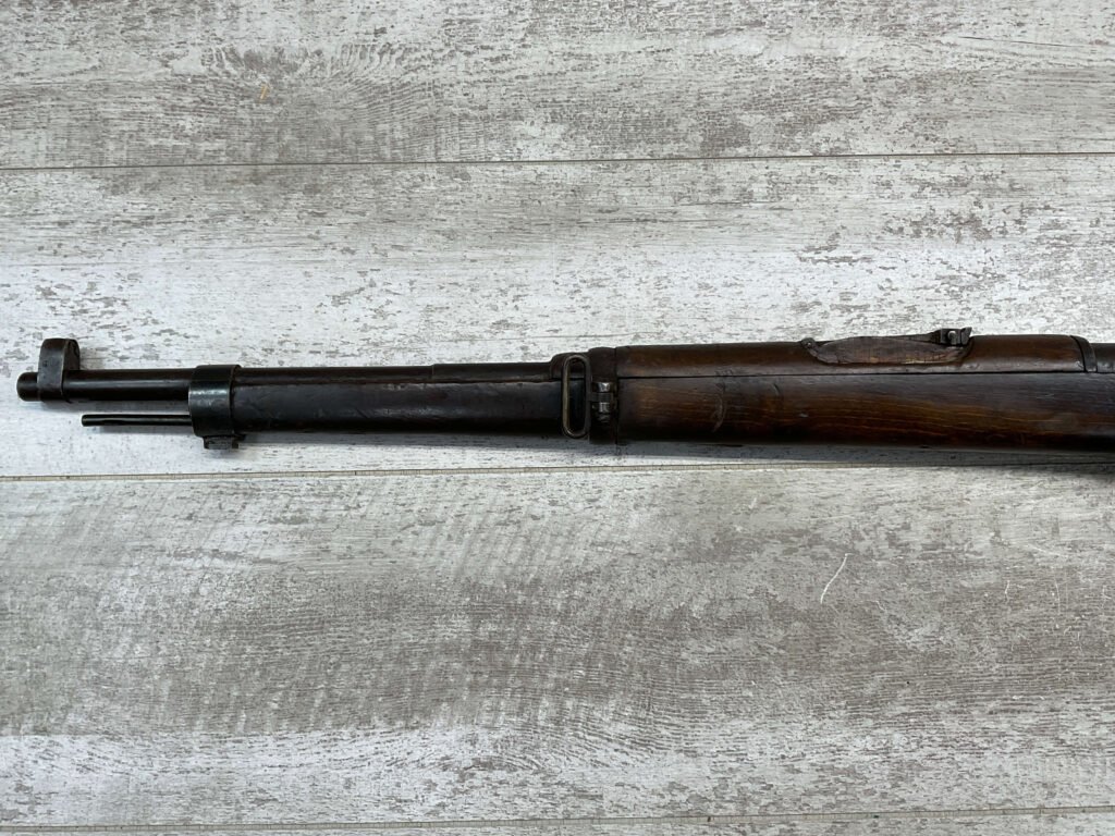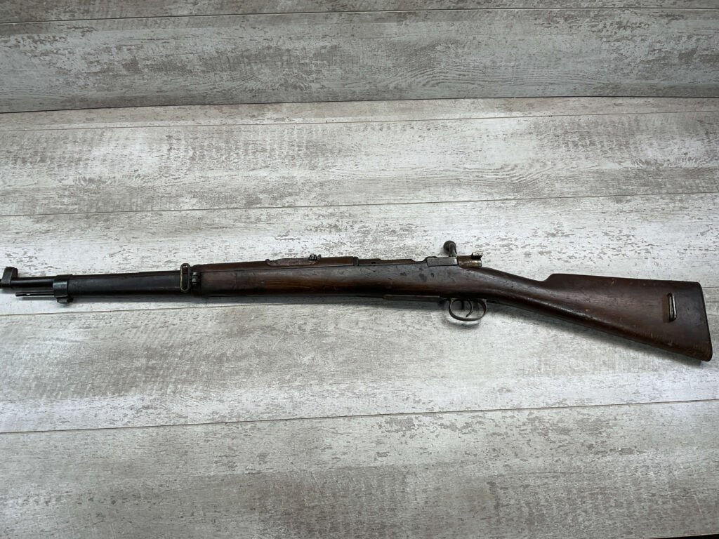 SPANISH OVIEDO 7X57 MODEL 1893 CARBINE BOLT ACTION RIFLE #P5036, 22″ BARREL, VOLLEY SIGHT, CURVED BOLT HANDLE, MIXED #’S, COVERED IN COSMOLINE (INCLUDING BORE), GREAT PROJECT GUN & SHOULD CLEAN UP W/ELBOW GREASE.