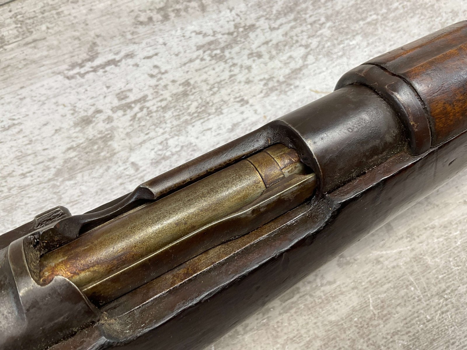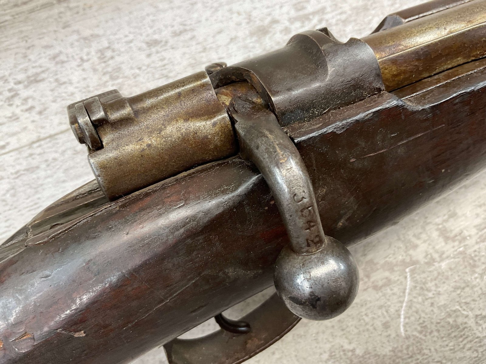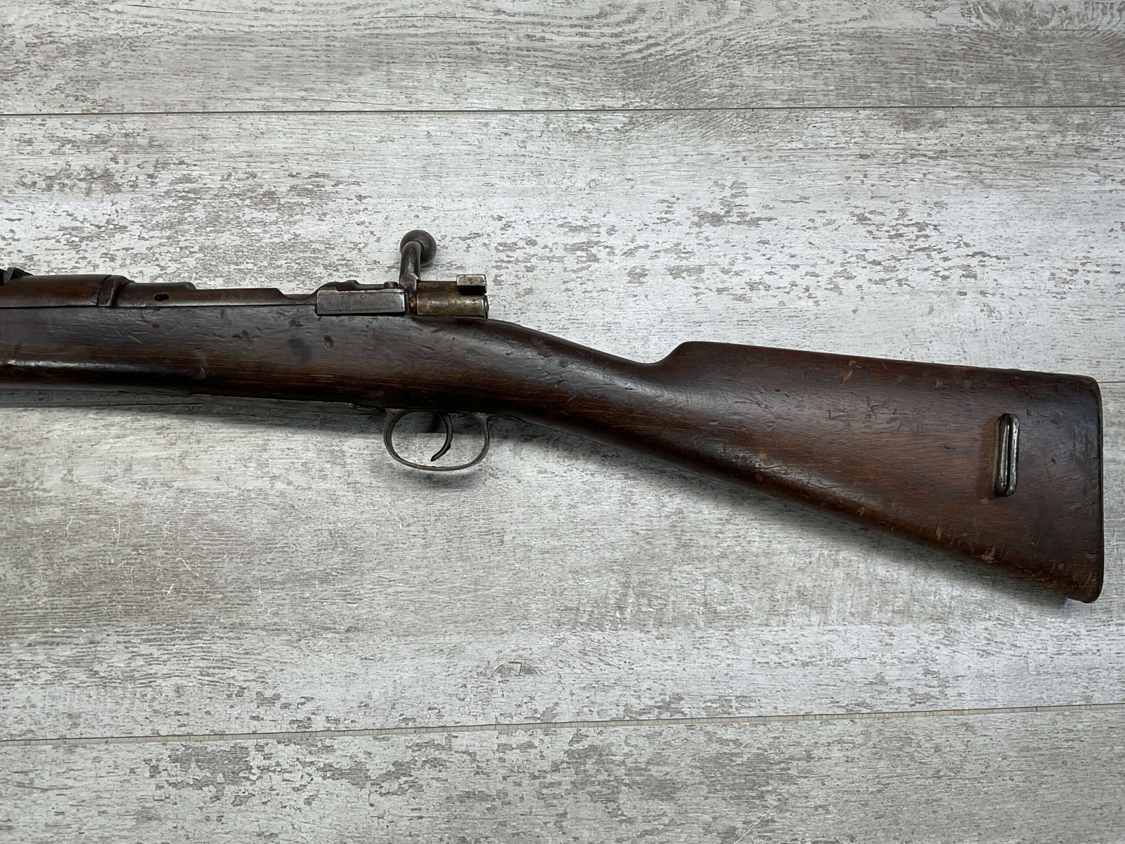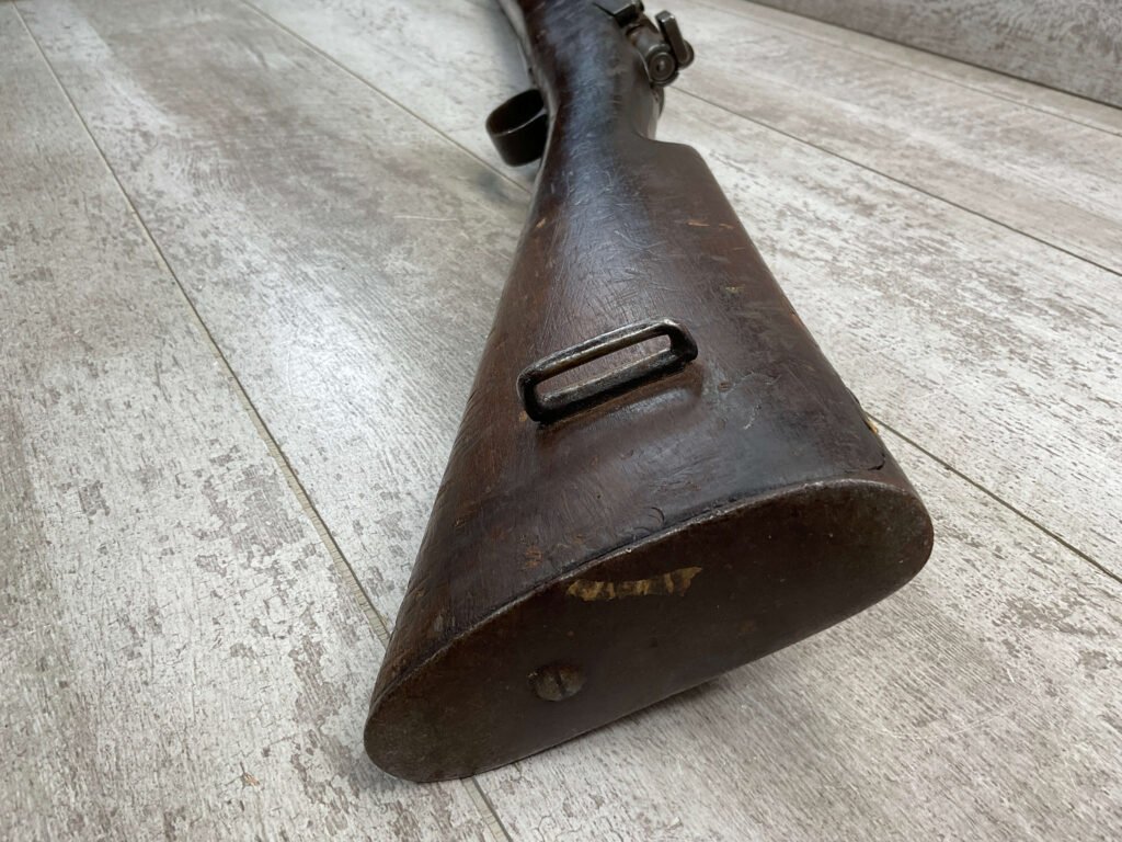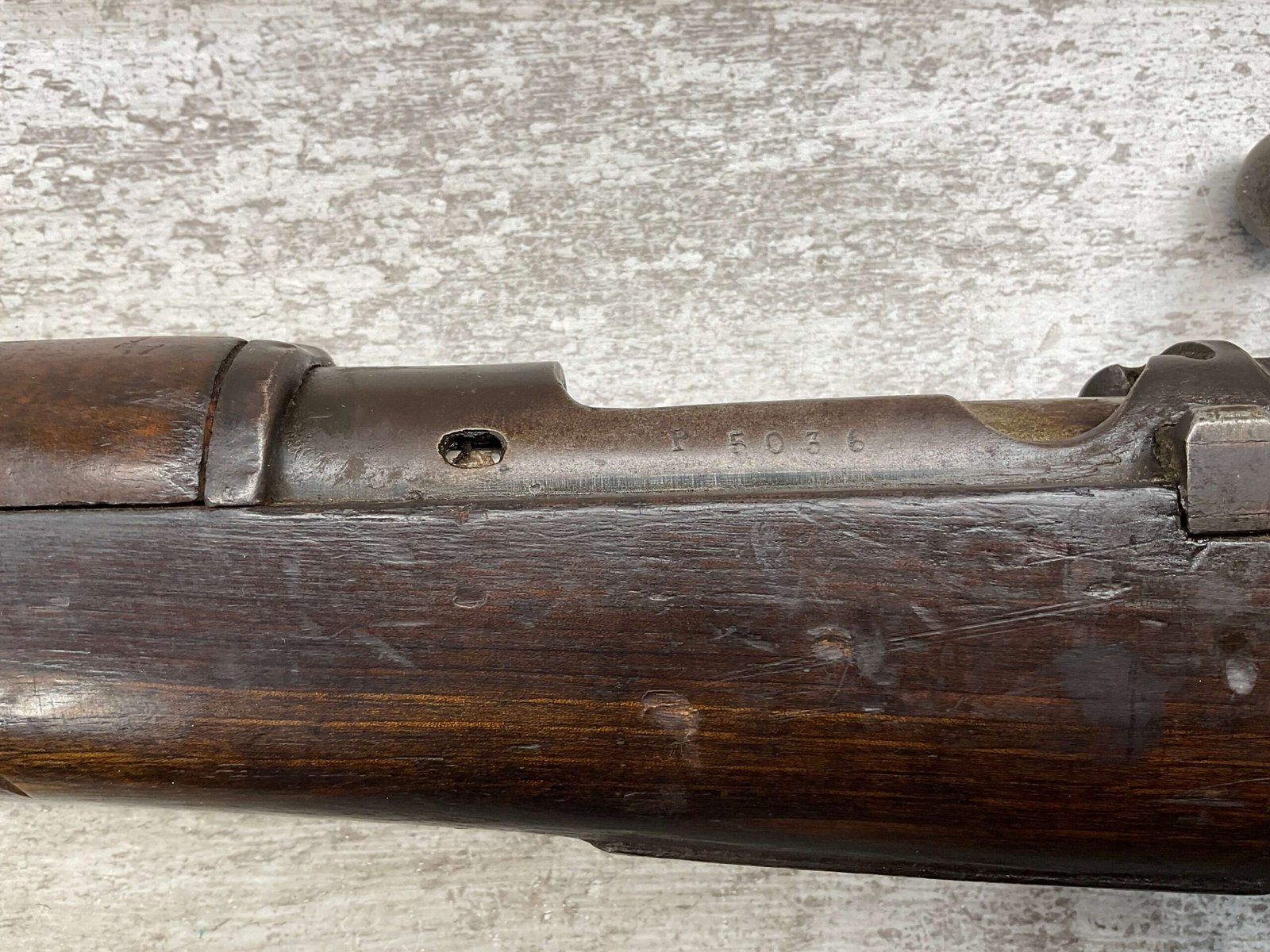 SPANISH OVIEDO 7X57 MODEL 1893 CARBINE BOLT ACTION RIFLE #P5036, 22″ BARREL, VOLLEY SIGHT, CURVED BOLT HANDLE, MIXED #’S, COVERED IN COSMOLINE (INCLUDING BORE), GREAT PROJECT GUN & SHOULD CLEAN UP W/ELBOW GREASE.