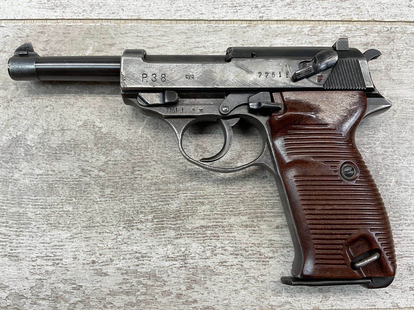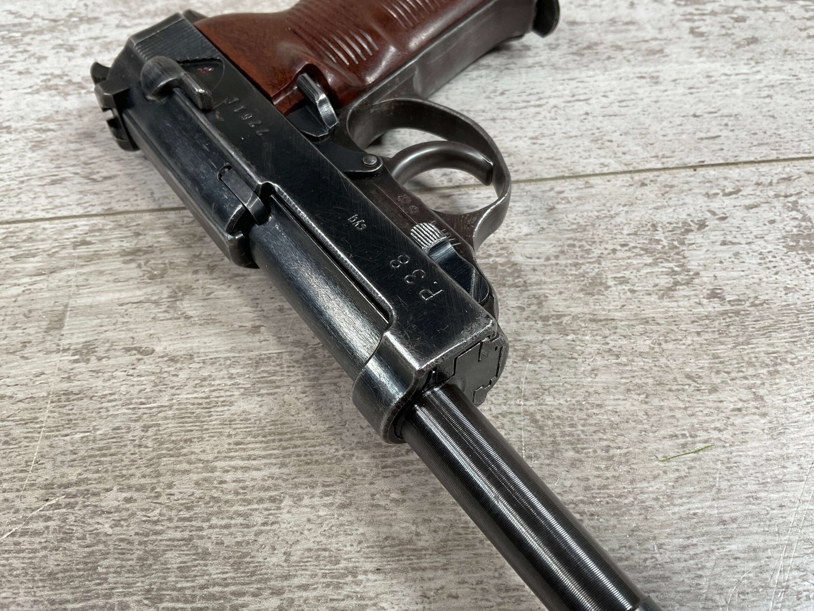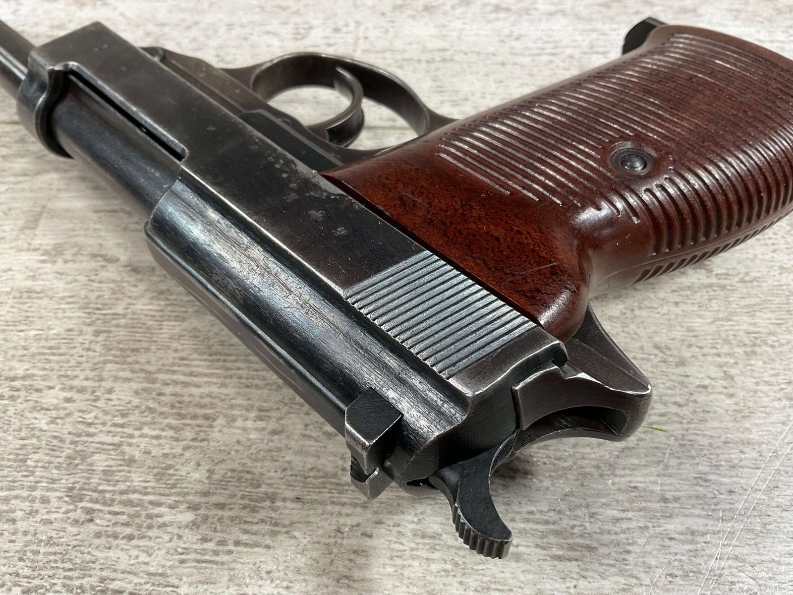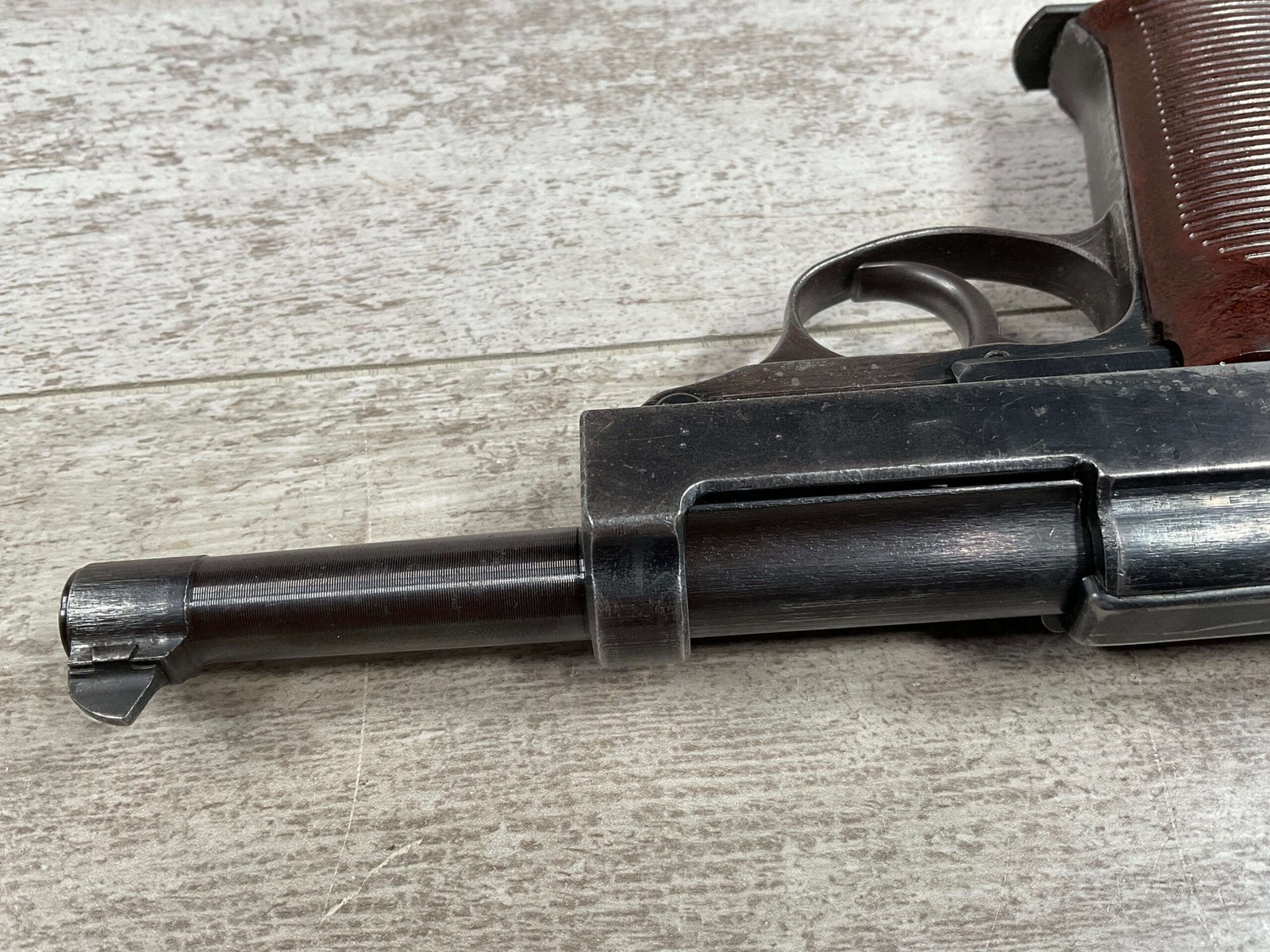 SPREEWERK cyq P38 9MM PISTOL #7761f, ARMORERS REPLACEMENT WaA135 5″ BARREL, REWORK MAGAZINE, MATCHING LOCKING BLOCK, ORIGINAL FINISH W/LIGHT HIGH EDGE WEAR, BRIGHT BORE W/LIGHTLY WORN RIFLING & LIGHT FROSTING IN THE GROOVES, EXC BROWN SPREEWERK GRIPS, 95+% OVERALL