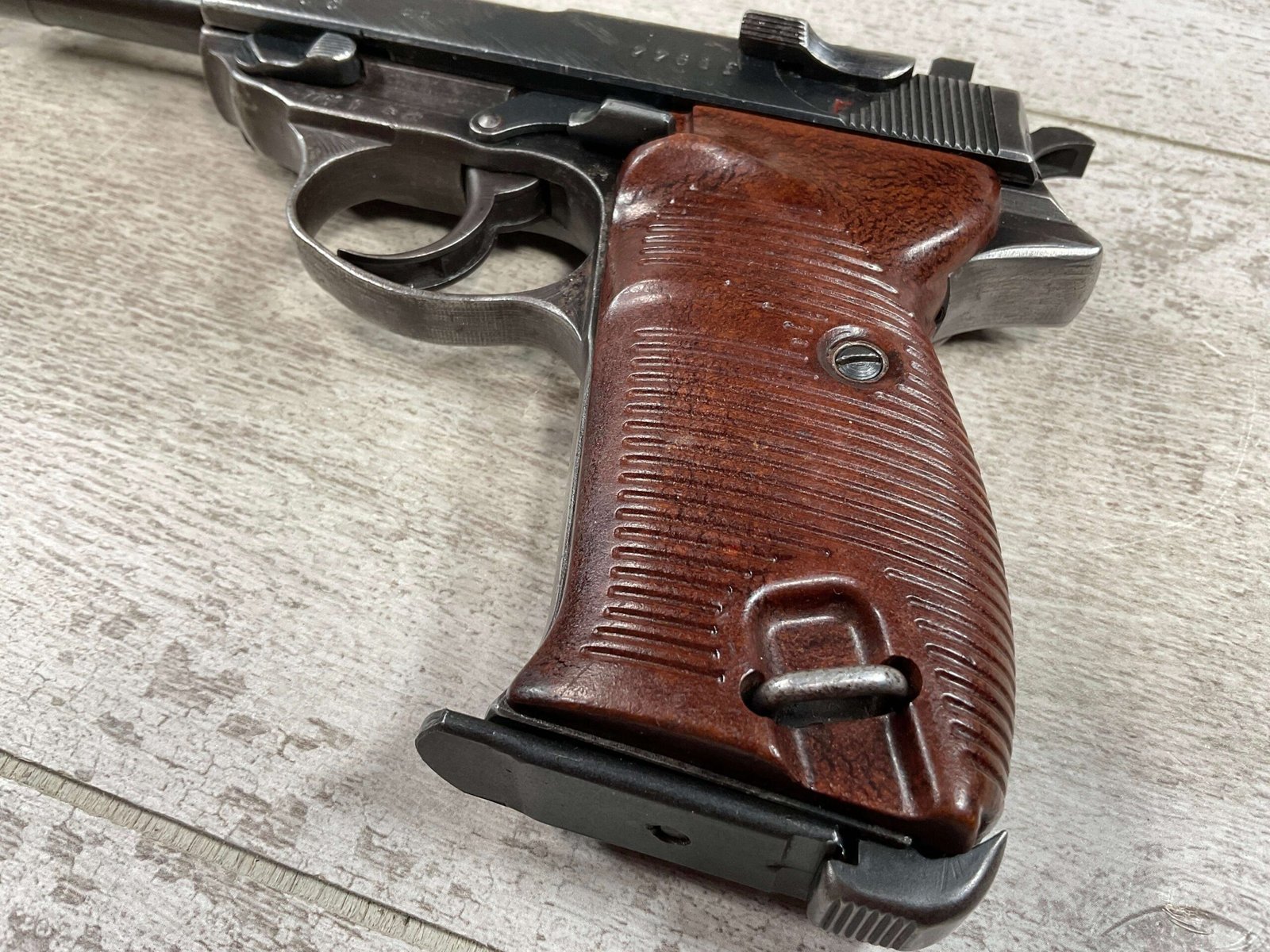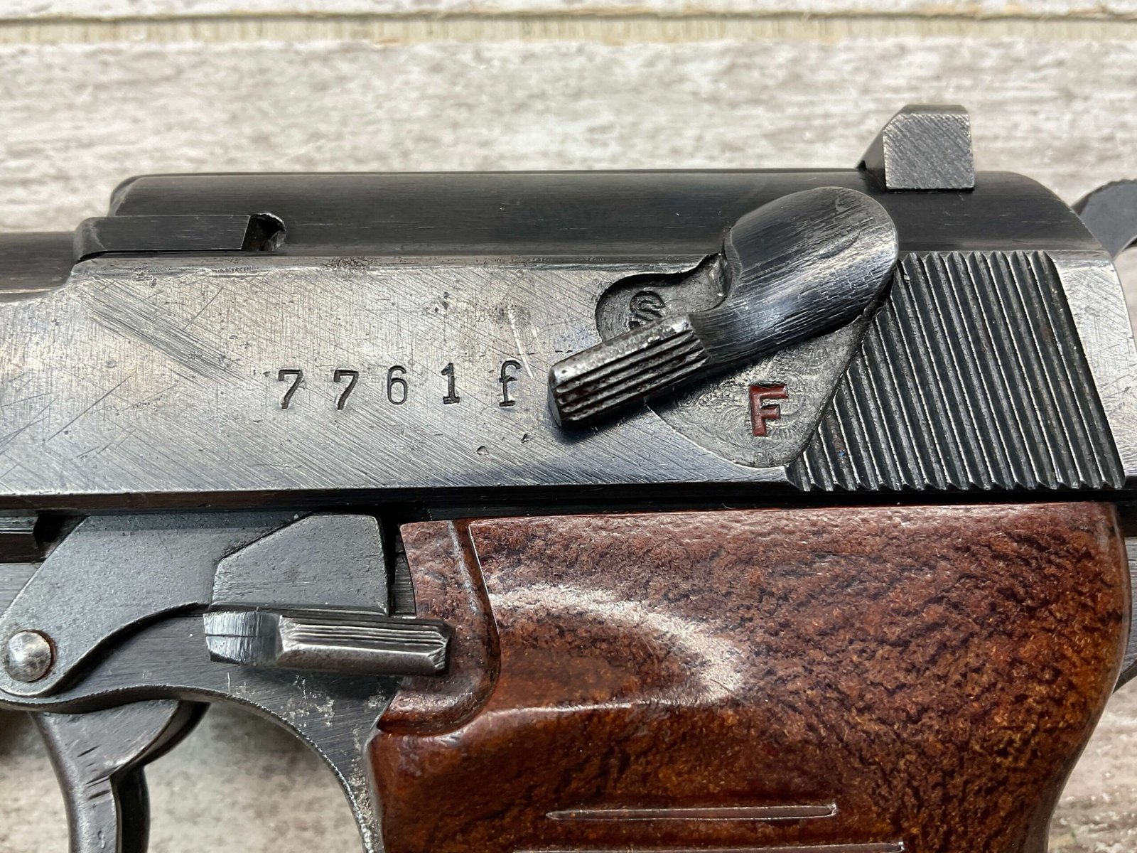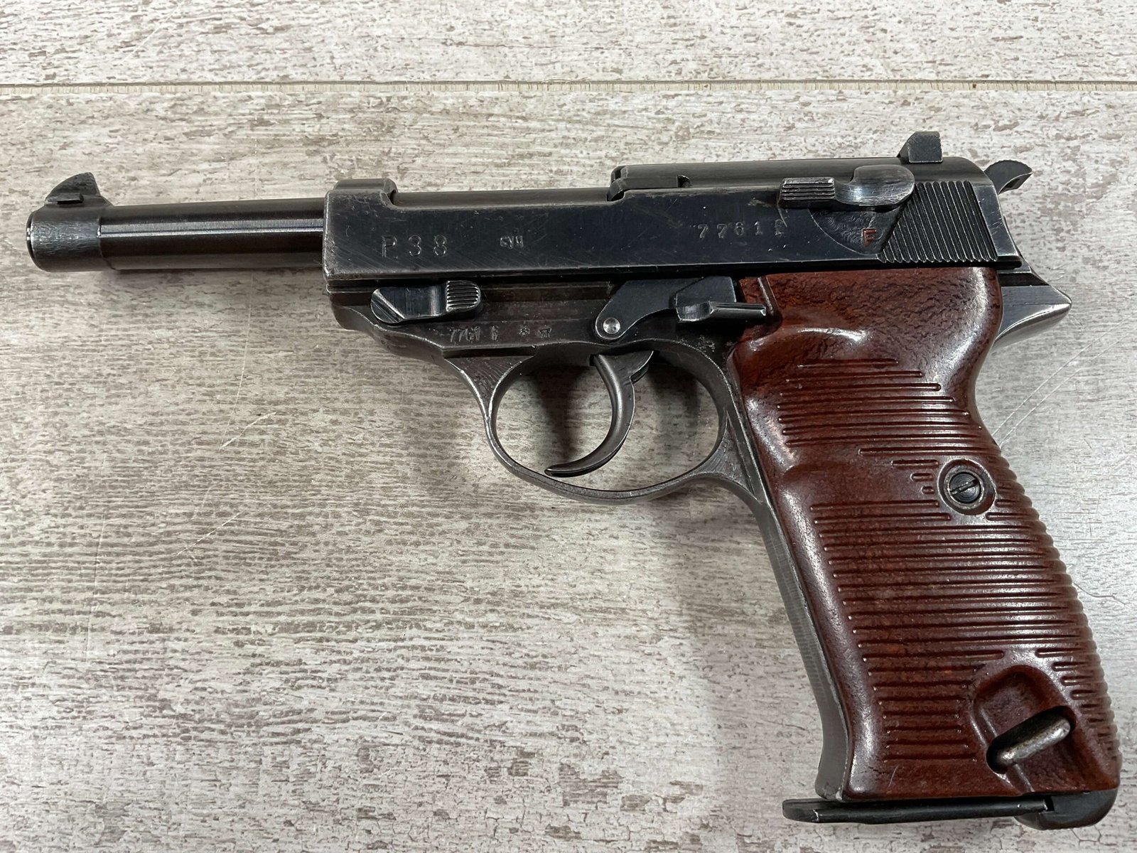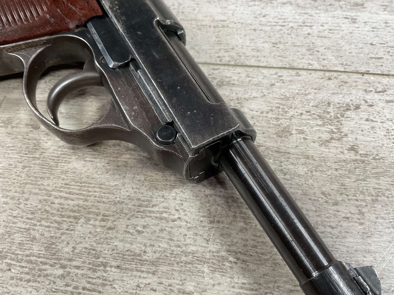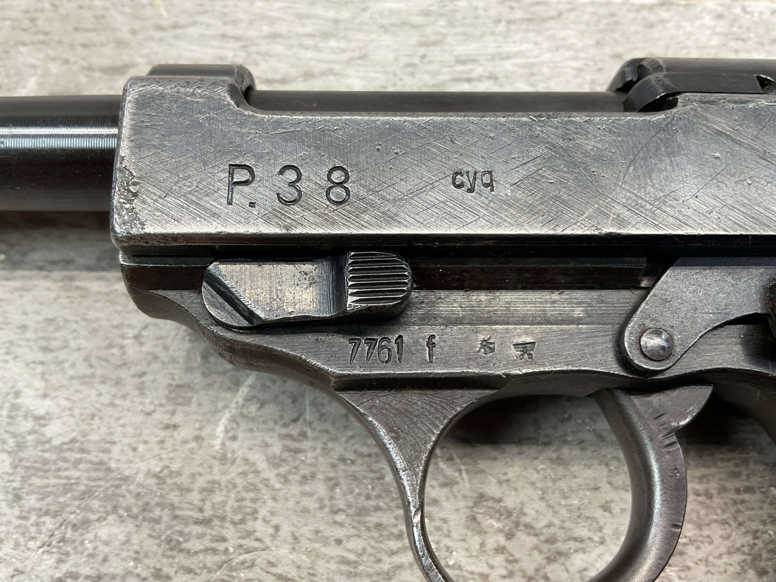 SPREEWERK cyq P38 9MM PISTOL #7761f, ARMORERS REPLACEMENT WaA135 5″ BARREL, REWORK MAGAZINE, MATCHING LOCKING BLOCK, ORIGINAL FINISH W/LIGHT HIGH EDGE WEAR, BRIGHT BORE W/LIGHTLY WORN RIFLING & LIGHT FROSTING IN THE GROOVES, EXC BROWN SPREEWERK GRIPS, 95+% OVERALL