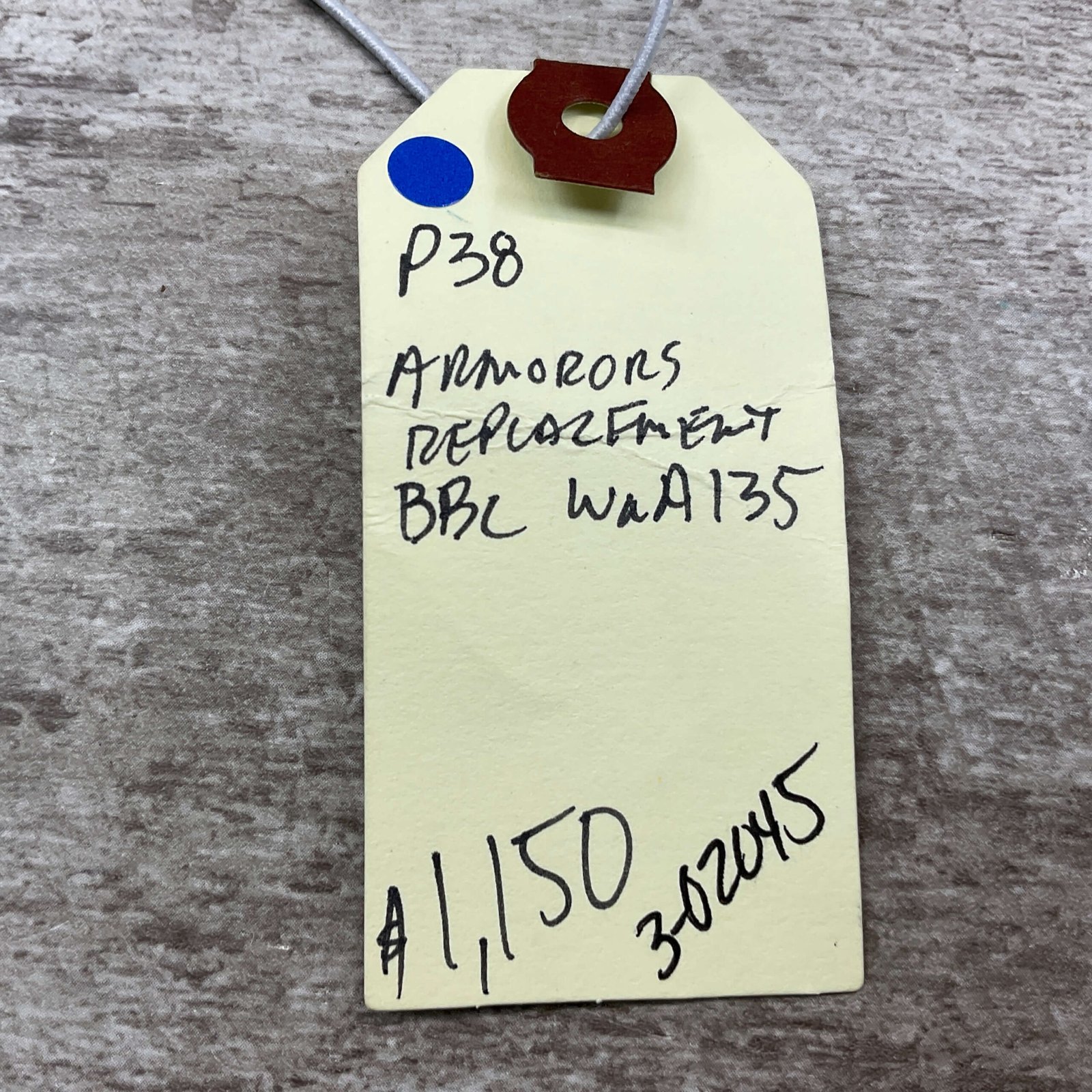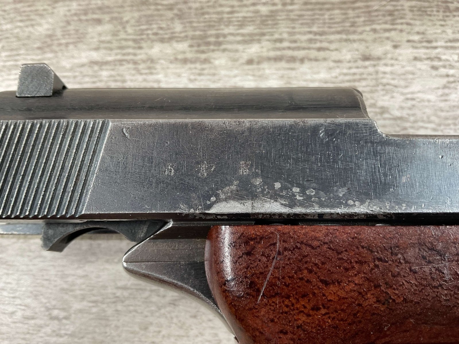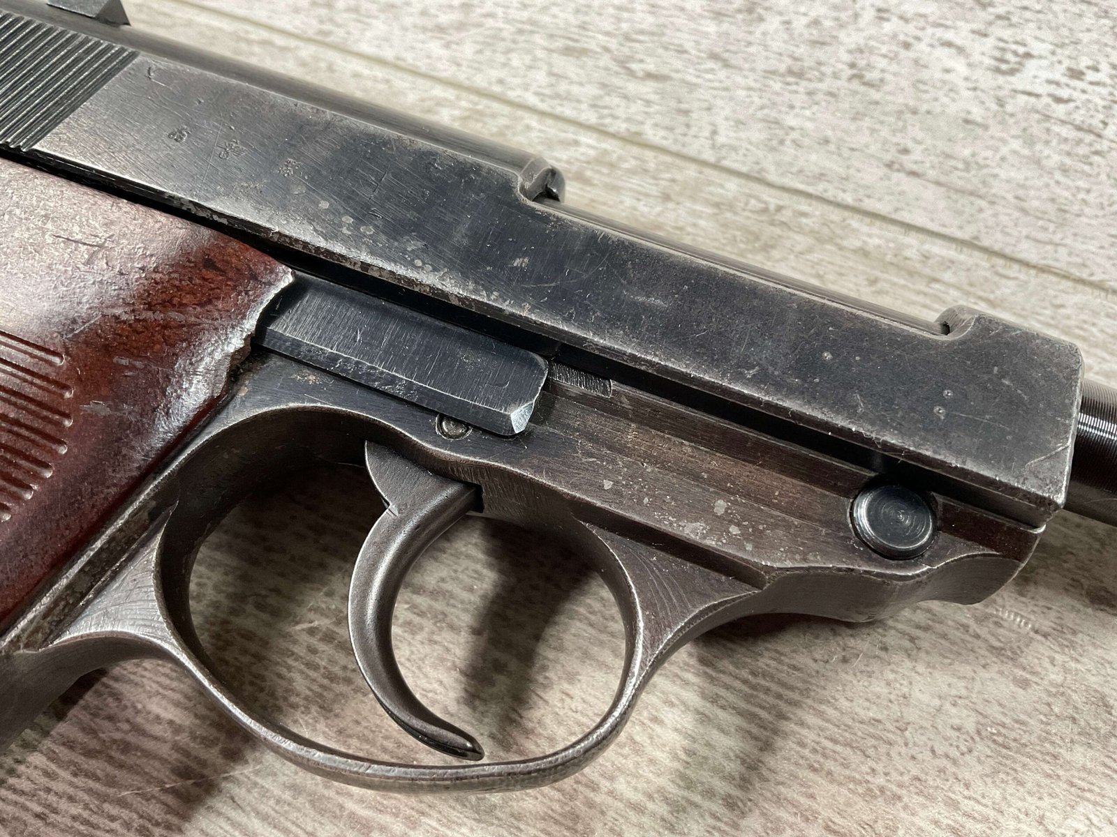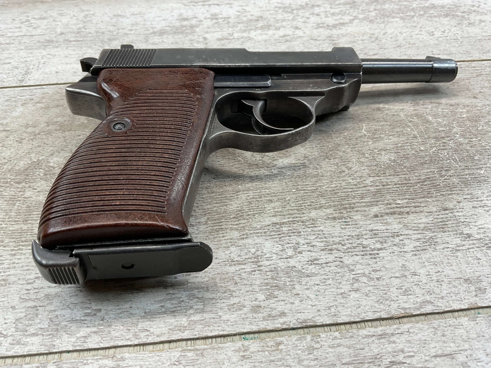 SPREEWERK cyq P38 9MM PISTOL #7761f, ARMORERS REPLACEMENT WaA135 5″ BARREL, REWORK MAGAZINE, MATCHING LOCKING BLOCK, ORIGINAL FINISH W/LIGHT HIGH EDGE WEAR, BRIGHT BORE W/LIGHTLY WORN RIFLING & LIGHT FROSTING IN THE GROOVES, EXC BROWN SPREEWERK GRIPS, 95+% OVERALL