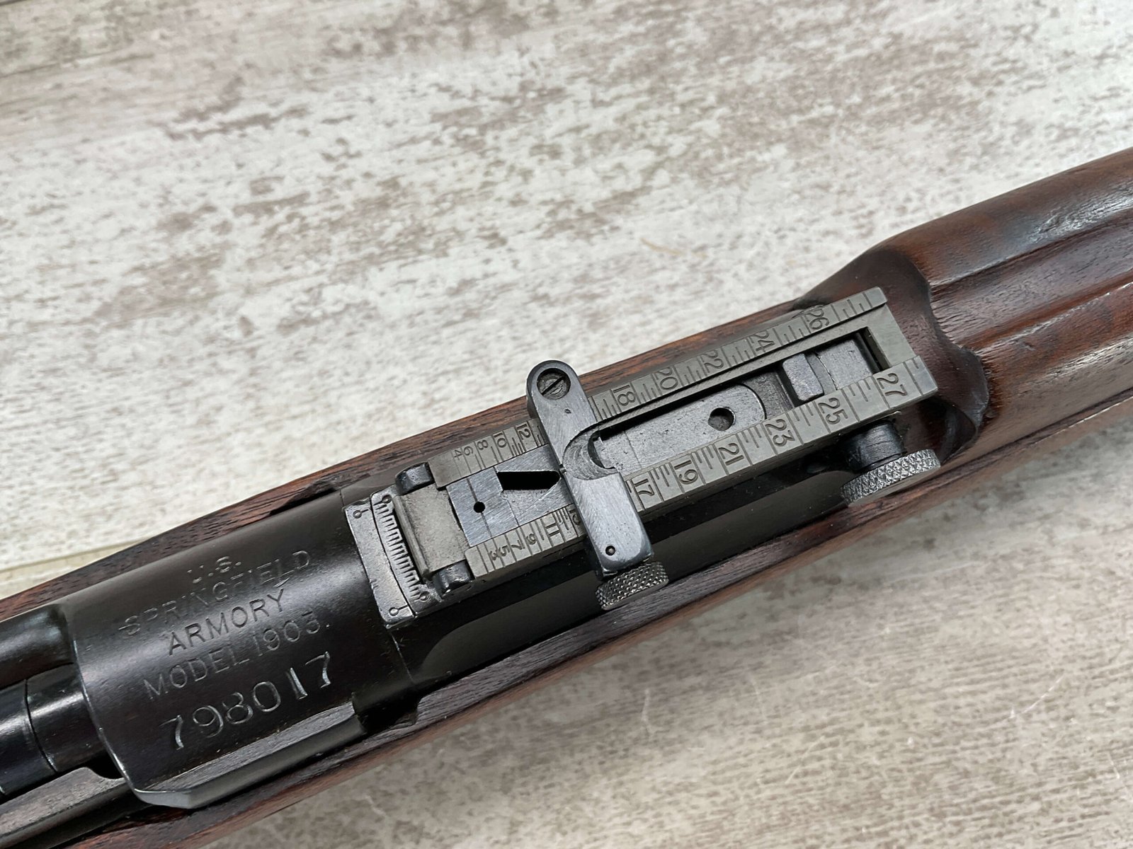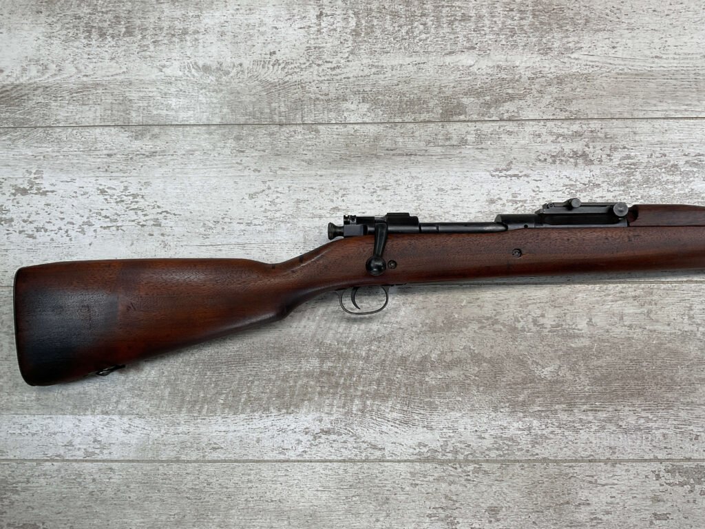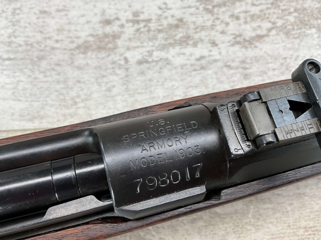 SPRINGFIELD 1903 .30-06 BOLT ACTION RIFLE, 4-18 MFR #798017, 1918 MFR, BARREL MARKED SA/FIREBOMB/4-18, 24″ BARREL, GOOD BORE & RIFLING (LIGHT PITTING PRESENT THROUGHOUT), 98% PARKERIZED FINISH, BOLT IS BRIGHT AND ELECTRO PENCILED W/#4818, EXC SCANT STOCK W/SOME DINGS AND LIGHT SCRATCHES & ARSENAL REPAIR AT GRIP, SMOOTH STEEL BUTT PLATE, EXCELLENT ACTION, 95+% OVERALL CONDITION, OWNER ORDERED IT FROM CMP IN 2002 & SAYS ITS AN EXCELLENT SHOOTER!!