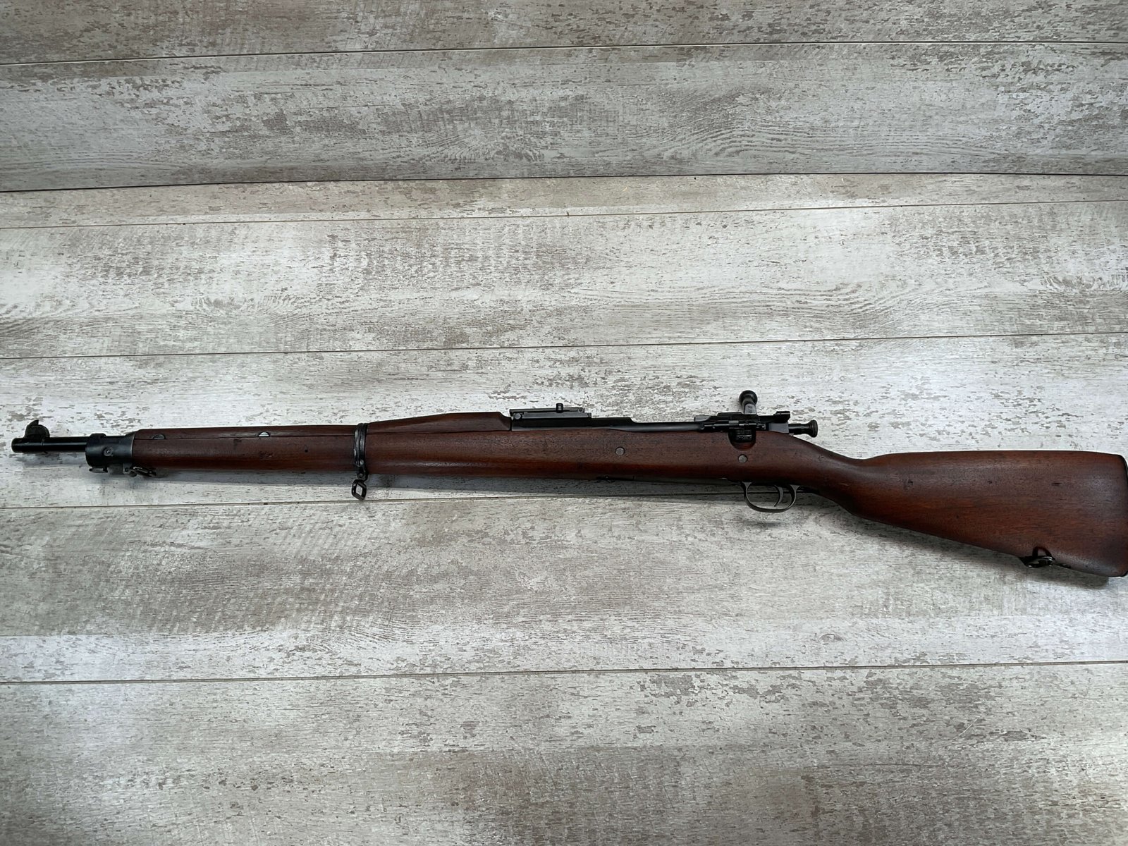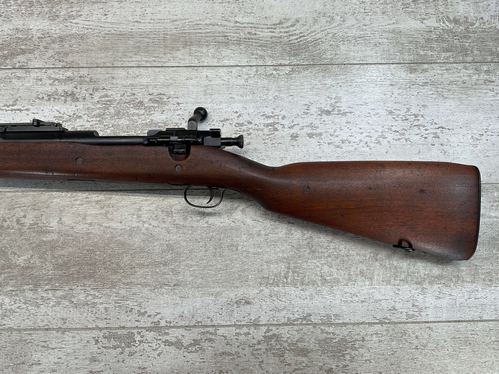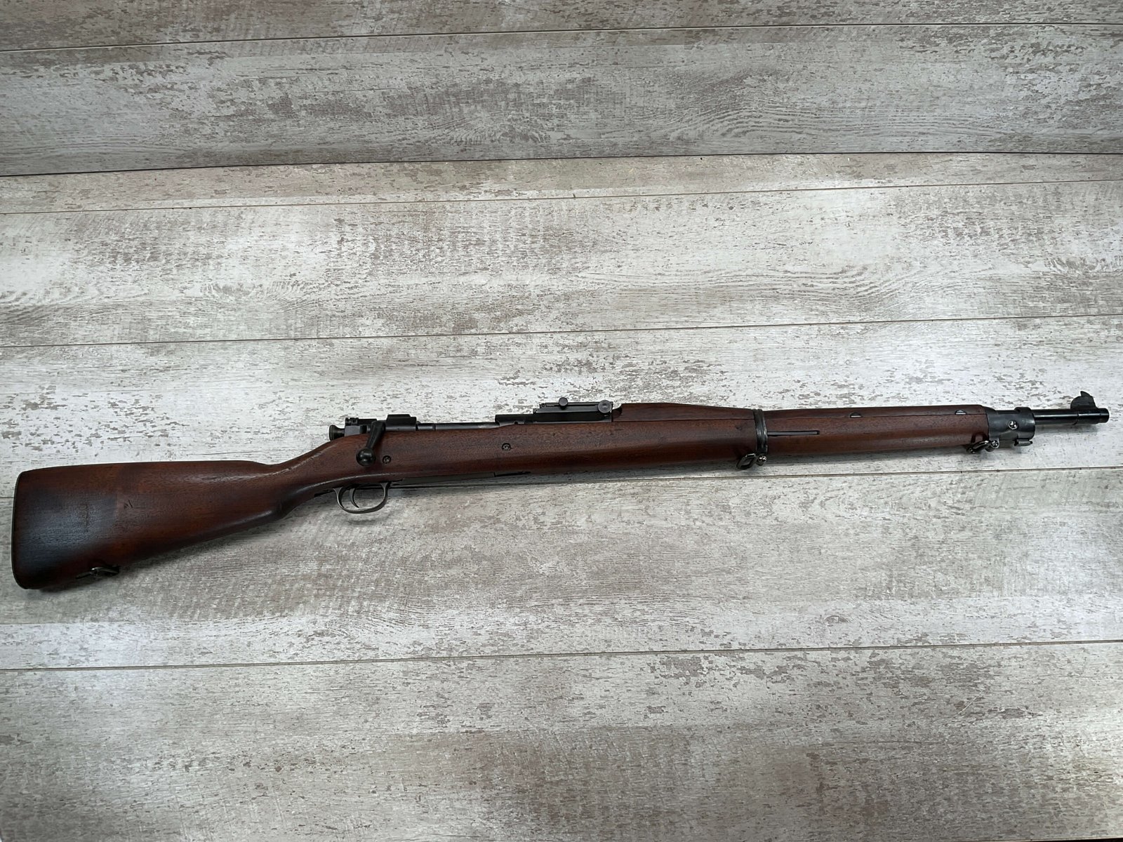 SPRINGFIELD 1903 .30-06 BOLT ACTION RIFLE, 4-18 MFR #798017, 1918 MFR, BARREL MARKED SA/FIREBOMB/4-18, 24″ BARREL, GOOD BORE & RIFLING (LIGHT PITTING PRESENT THROUGHOUT), 98% PARKERIZED FINISH, BOLT IS BRIGHT AND ELECTRO PENCILED W/#4818, EXC SCANT STOCK W/SOME DINGS AND LIGHT SCRATCHES & ARSENAL REPAIR AT GRIP, SMOOTH STEEL BUTT PLATE, EXCELLENT ACTION, 95+% OVERALL CONDITION, OWNER ORDERED IT FROM CMP IN 2002 & SAYS ITS AN EXCELLENT SHOOTER!!