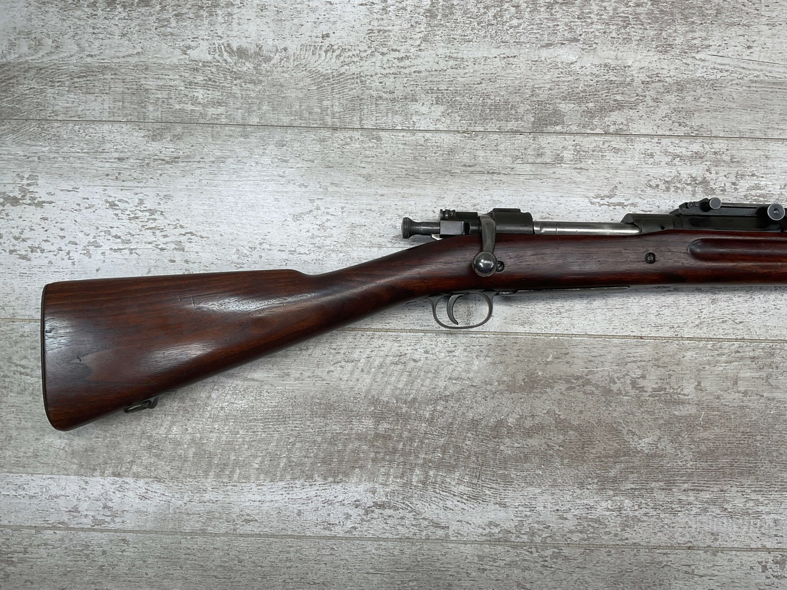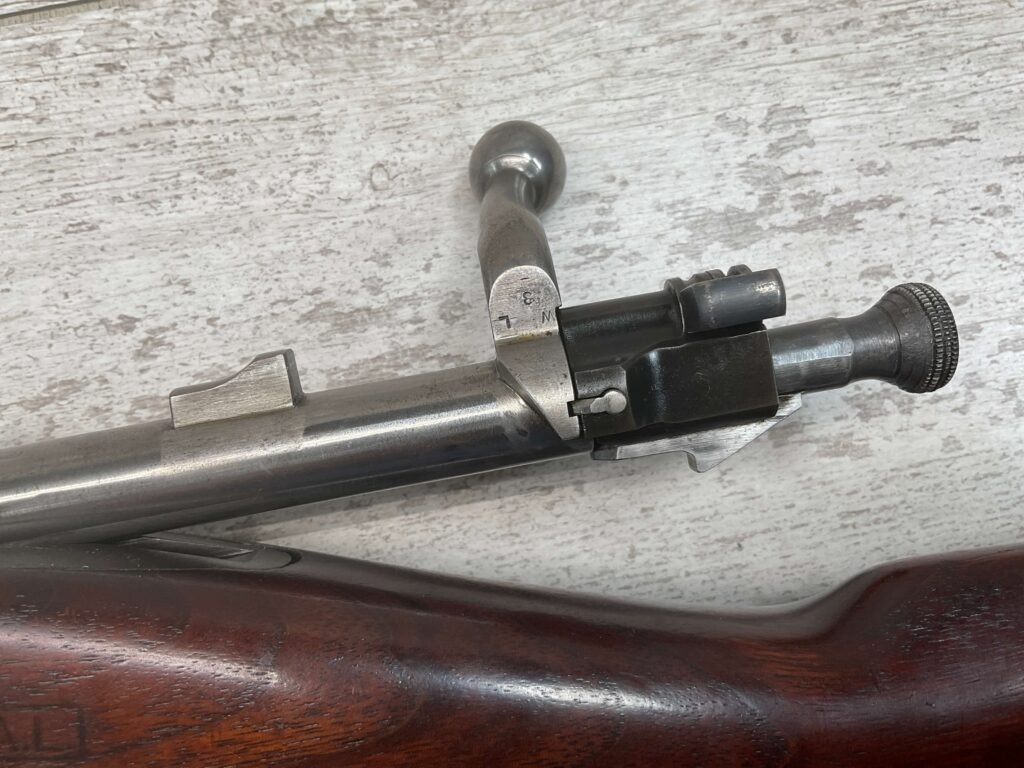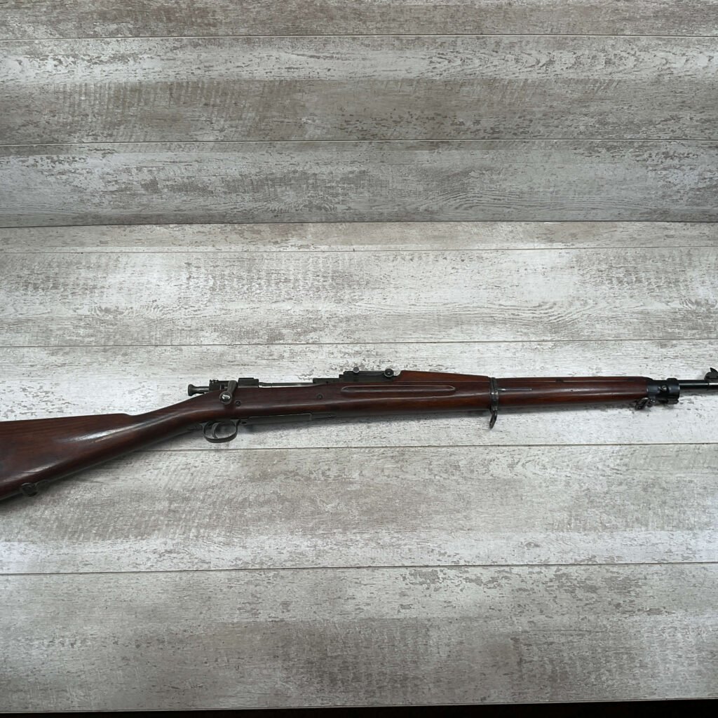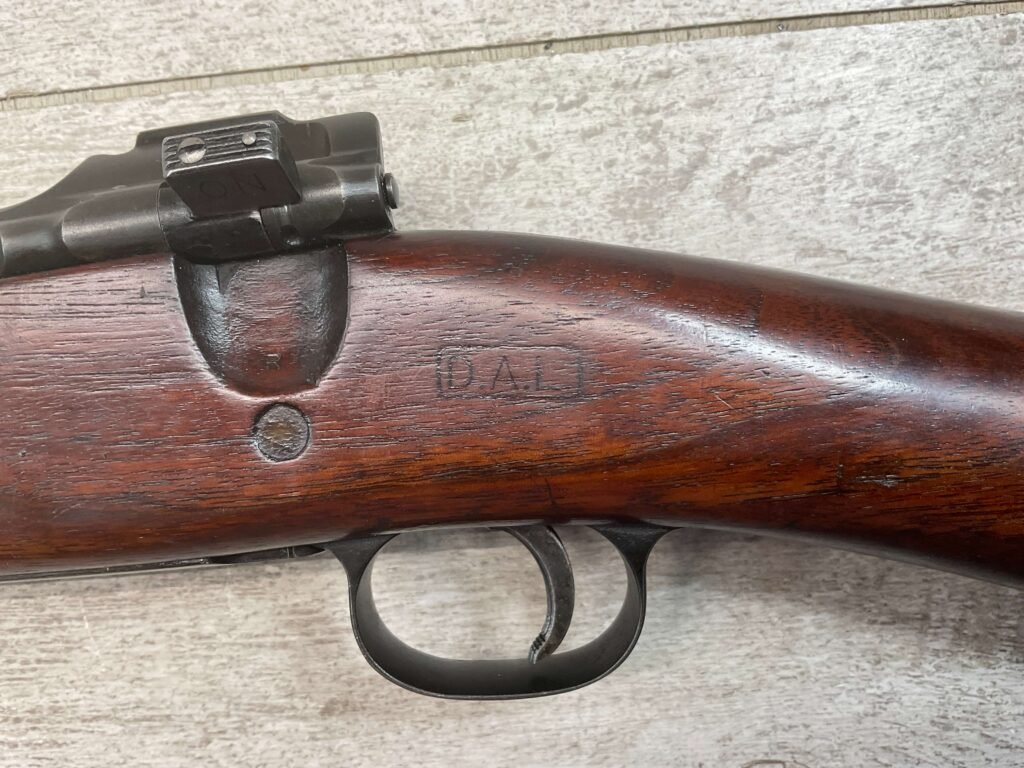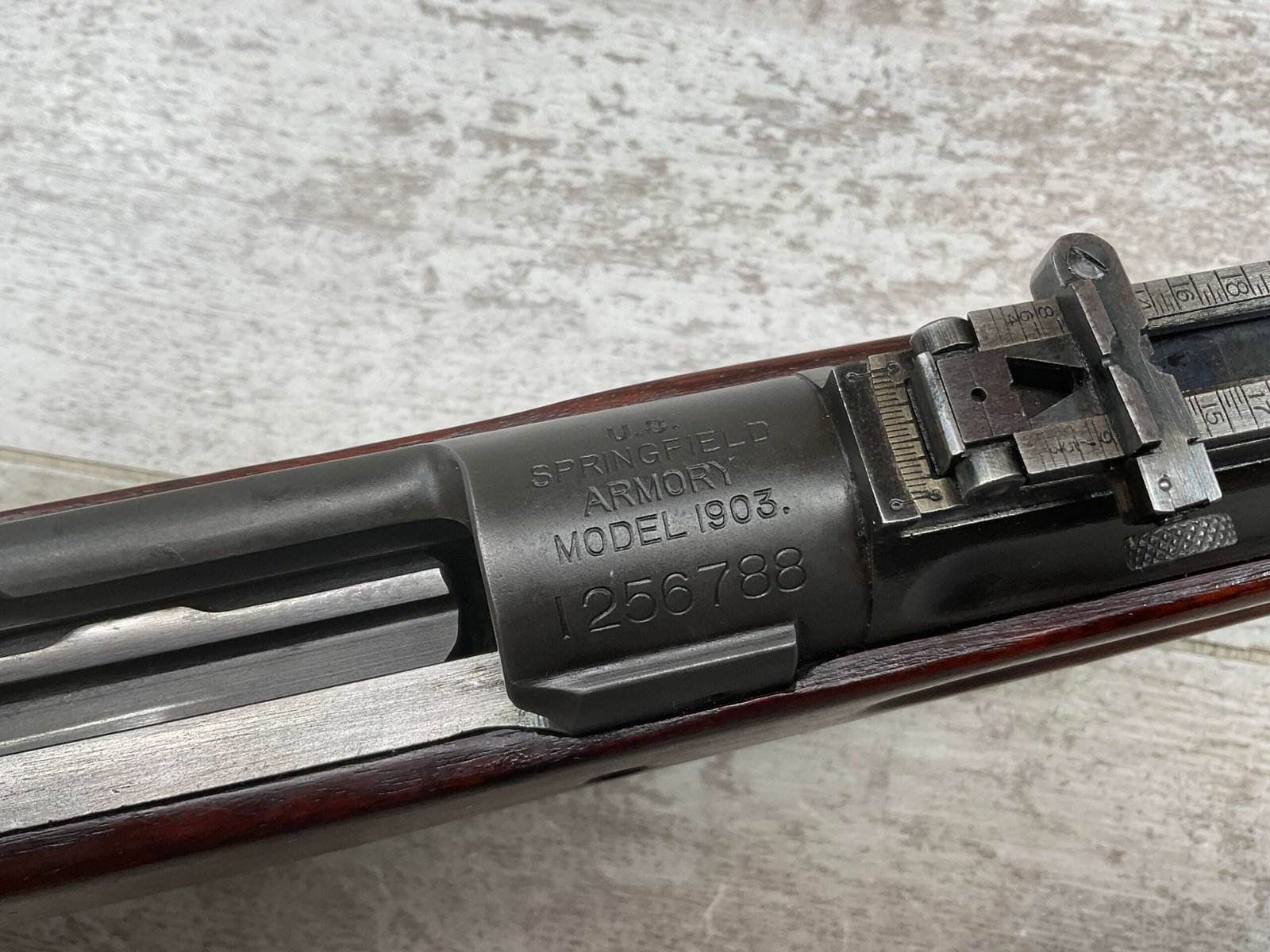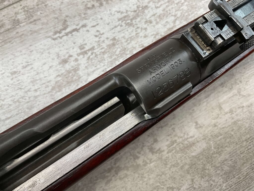 SPRINGFIELD 1903 30-06 NATIONAL MATCH BOLT ACTION RIFLE, #1256788, “SA/FIREBOMB/5-23″ STAR GAUGE MARKED 24” BARREL, EXC SCANT STOCK W/VERY LIGHT DINGS/NICKS, “CIRCLE P” CARTOUCHE LIGHT BEHIND TRIGGER GUARD, “D.A.L.” CARTOUCHE ON LEFT SIDE OF STOCK, GOOD BRIGHT BORE W/EXC RIFLING & SOME FROSTING THROUGHOUT, THE UNDERSIDE OF THE BOLT HANDLE IS MARKED “X” WITH A PUNCH, THE TOP OF THE BOLT HANDLE IS MARKED “W”/”L” & “3”, BAYONET LUG MARKED “H”, THE BARREL BAND MARKED “U”, RIGHT SIDE OF FRONT SIGHT MARKED “A”, 90+% ORIGINAL BLUE, EXC ACTION, ME-0, AMAZING 100 YEAR OLD PIECE OF HISTORY!!